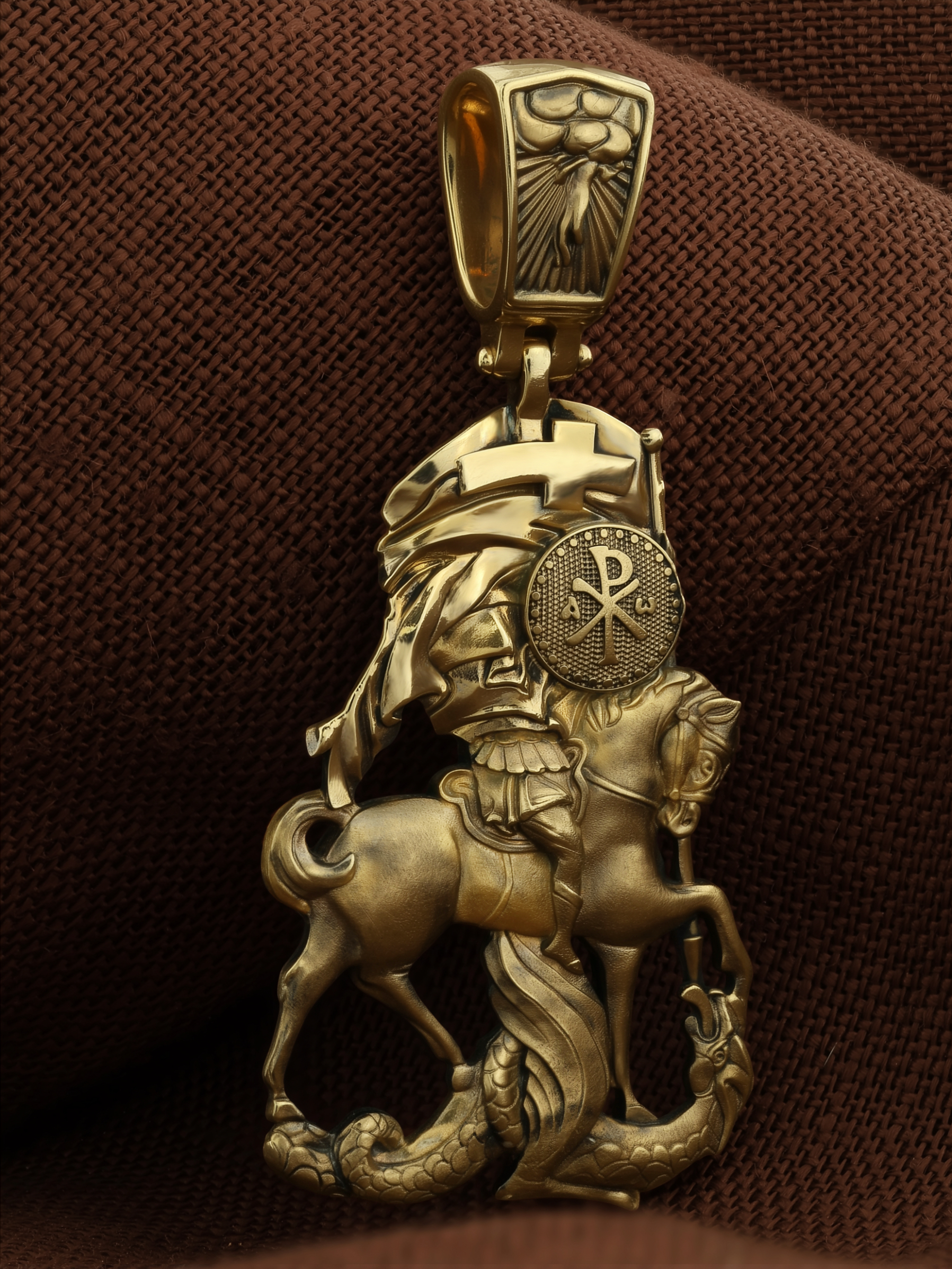 Основой композиции образка является изображение Святого Великомученика Георгия Победоносца — одного из самых почитаемых и удивительных святых. Георгий родился в Каппадокии (Малая Азия) в семье богатых и знатных горожан. Юношей поступил на службу к римскому императору Диоклетиану, за отличное знание военного дела и проявленную в боях и походах храбрость был приближен к императору и удостоен высокого воинского звания. Во время начавшихся гонений на христиан, перешел на сторону гонимых и, отвергнув человеческий страх, стал ярым проповедником учения Христа. Мучители подвергли опального воеводу жесточайшим восьмидневным пыткам и казнили его (обезглавили) в возрасте около тридцати лет в 303 году. На Руси он известен как Юрий или Егорий, заступник для верующих, чья жизнь имеет какое-либо отношение к военным делам, помощник в крестьянском труде. Образок сделан в виде воинского щита. На нем Георгий изображен как воитель, сидящий на вздыбленном коне и поражающий копьем огнедышащего змея. Справа над образом изображена благословляющая Божия десница. Змей символизирует собою сатанинские силы. Молитвами вознесенными к Всевышнему и своей непреклонной верой он смог одолеть чудовище. Святой убил змея, спас царскую дочь, принесенную в жертву, и жителей города, их души от влияния дьявола, породив в них надежду и веру в Господа, призывая людей принять христианскую веру. На оборотной стороне образка написана молитва: «Мучениче Георгие, моли Бога о мне».