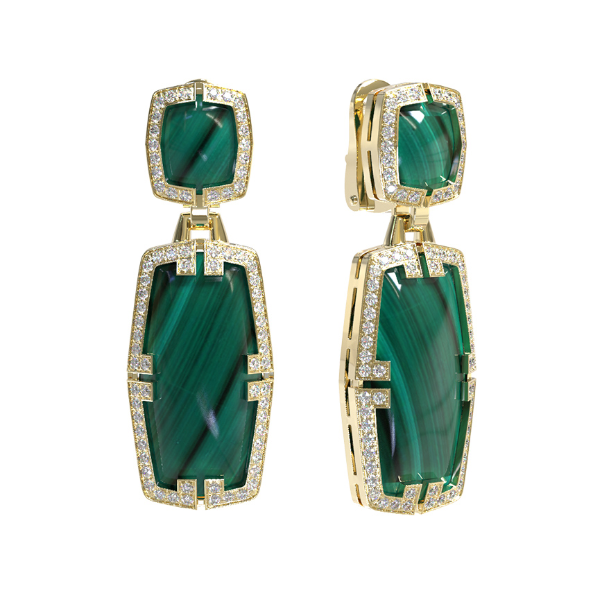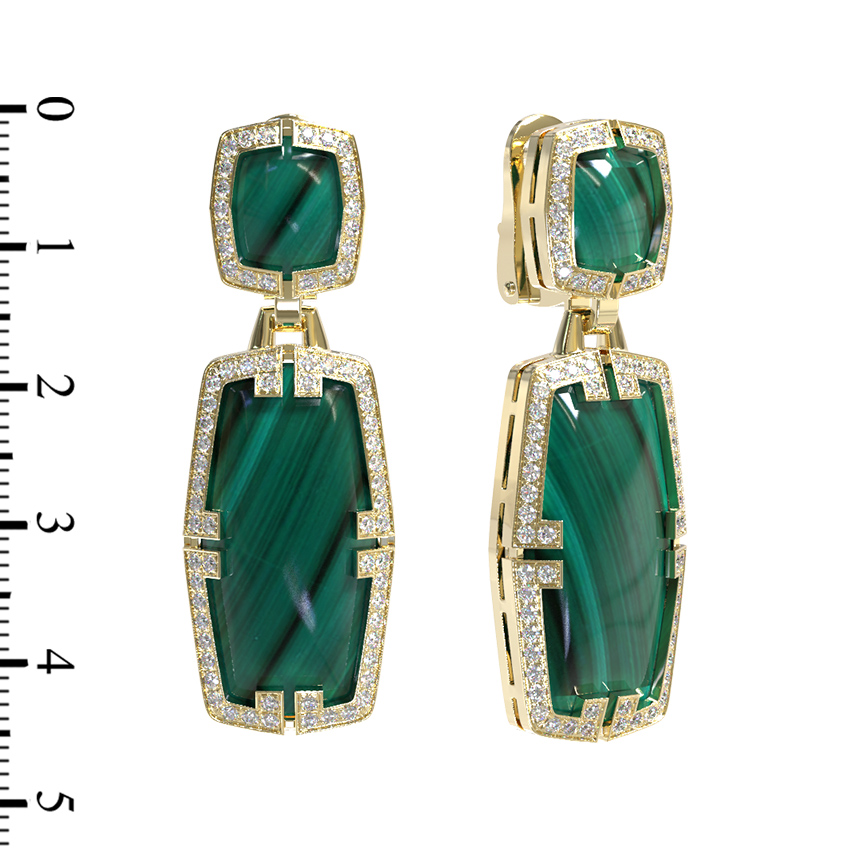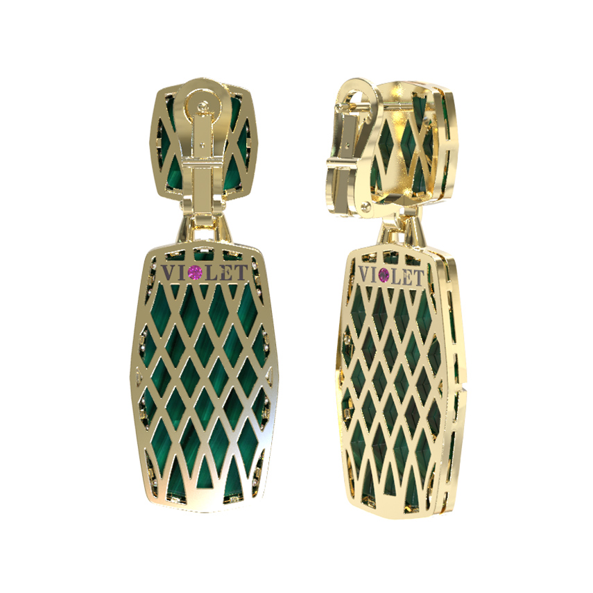 Серьги из лимонного золота c бриллиантами, рубином и малахитом