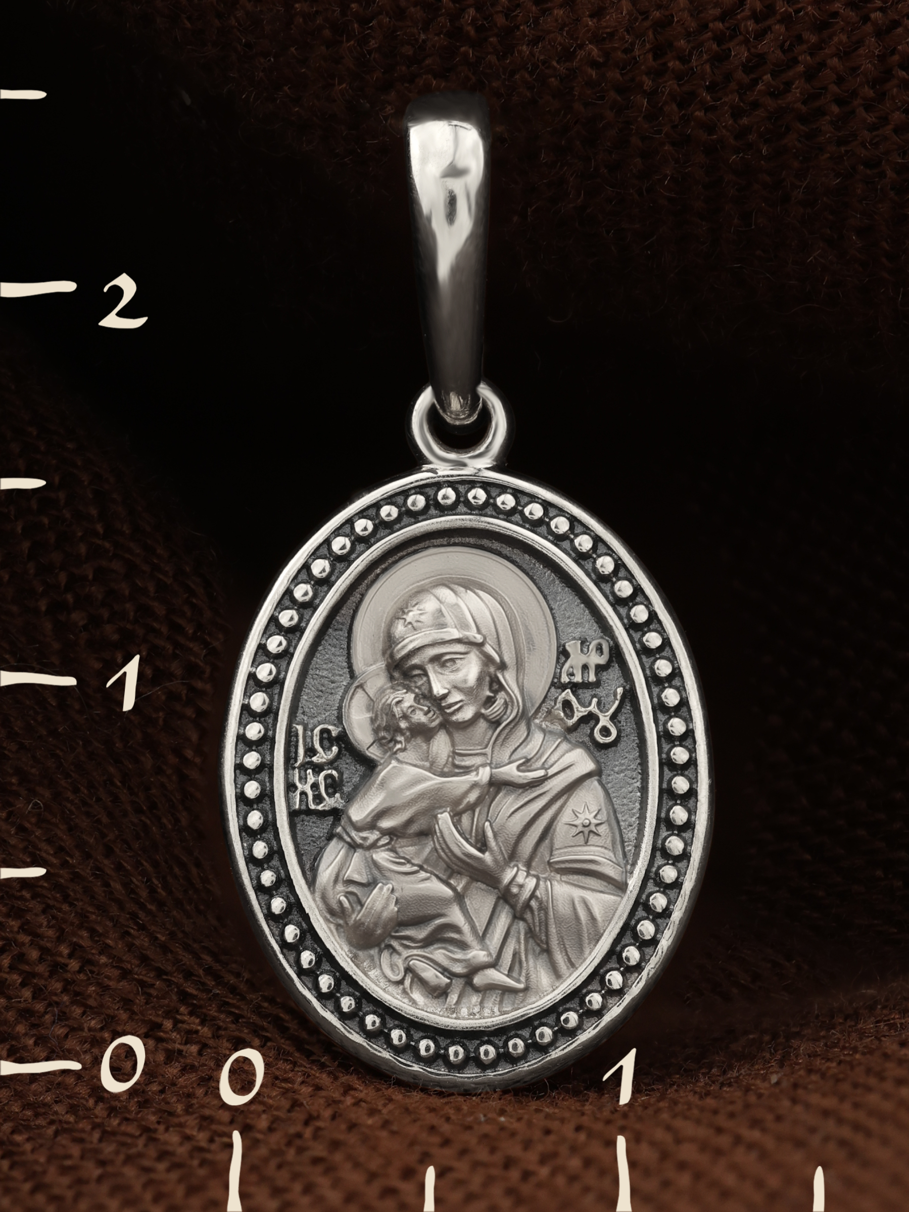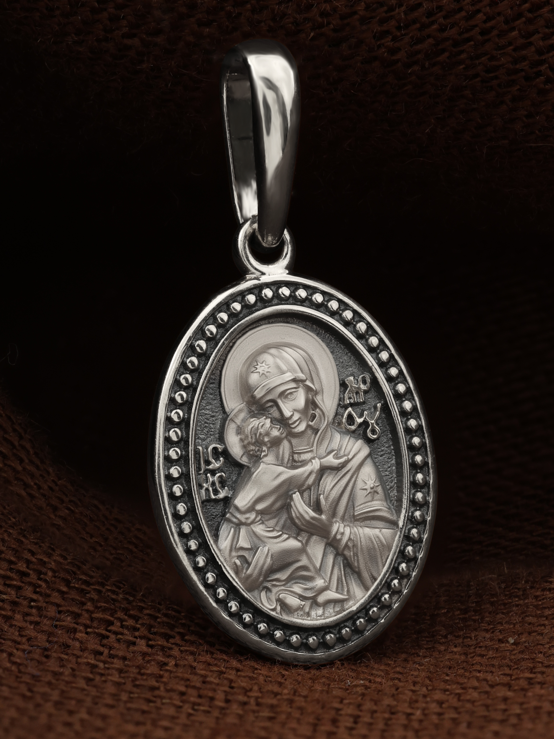Лицевую сторону возглавляет Владимирская икона Божией Матери. По преданию, она была написана на доске трапезного стола из дома Иисуса Христа. На Русь икона была привезена в начале XII века и с тех пор почитается как главная святыня нашего Отечества. Перед ней молитвенно просят Богородицу об исцелении от телесных недугов, в частности, заболеваний сердца и сердечно-сосудистой системы. За помощью к Владимирской иконе Божией Матери обращаются во время бедствий, когда нуждаются в защите от врагов.