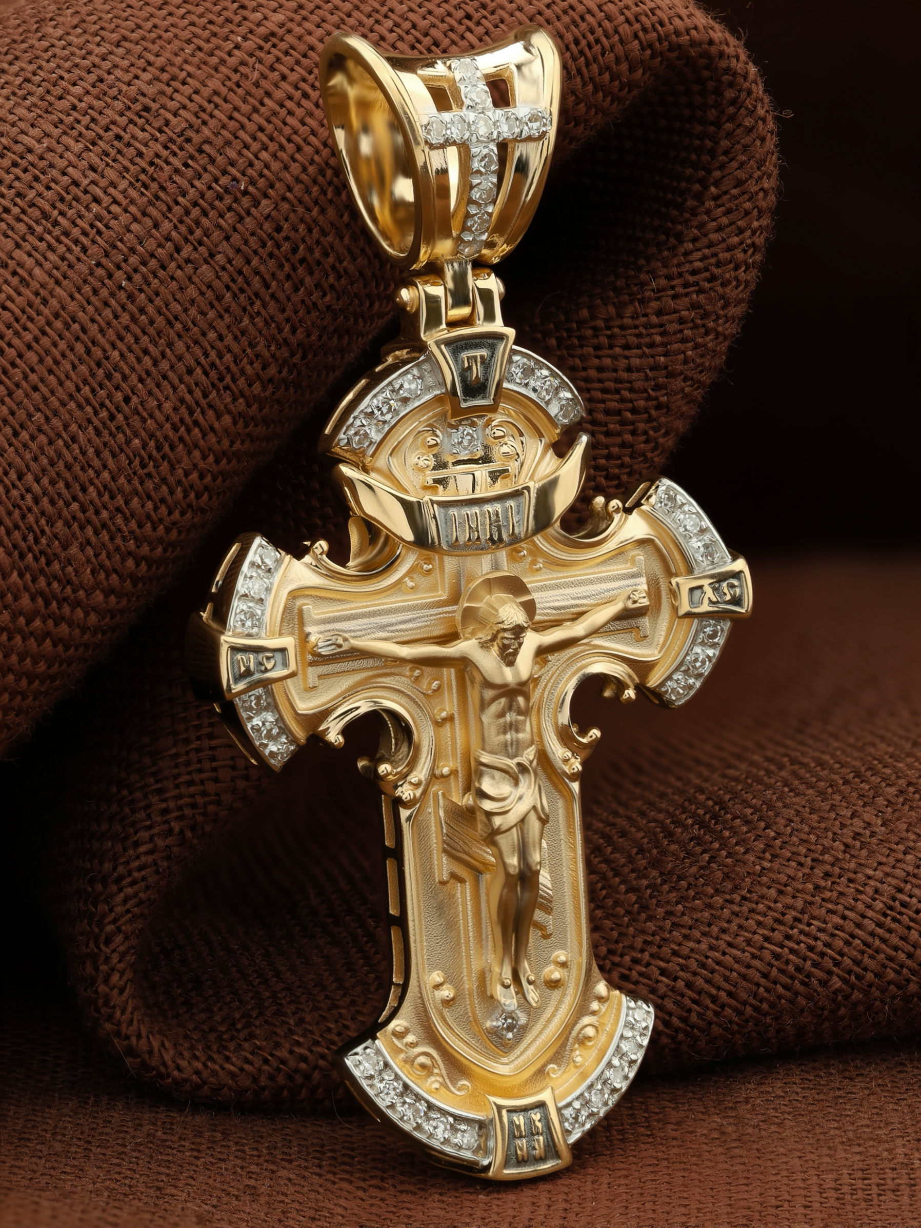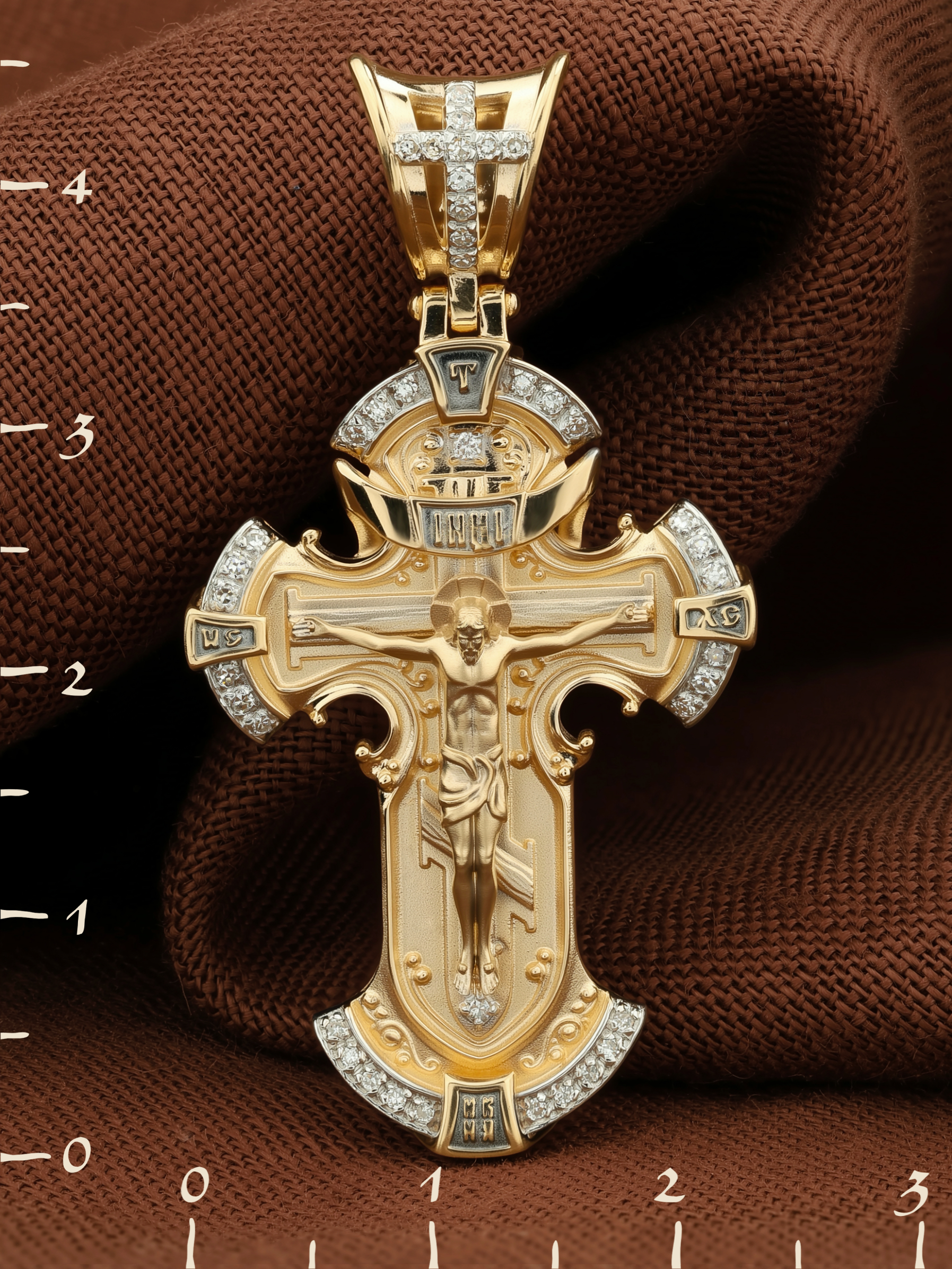На лицевой стороне креста изображено Распятие Иисуса Христа на Голгофском Кресте, верхняя перекладина которого символизирует титло — табличку, на которой, согласно Евангелию, было начертано: Иисус Назорей Царь Иудейский (IНЦI). Справа и слева от Распятия изображены символы «IС ХС» — святое имя Христа. Внизу креста написано слово «НИКА», что значит «победитель». В верхней части креста обозначена буква «Т», которая символизирует одно из орудий страданий Господа — трость.