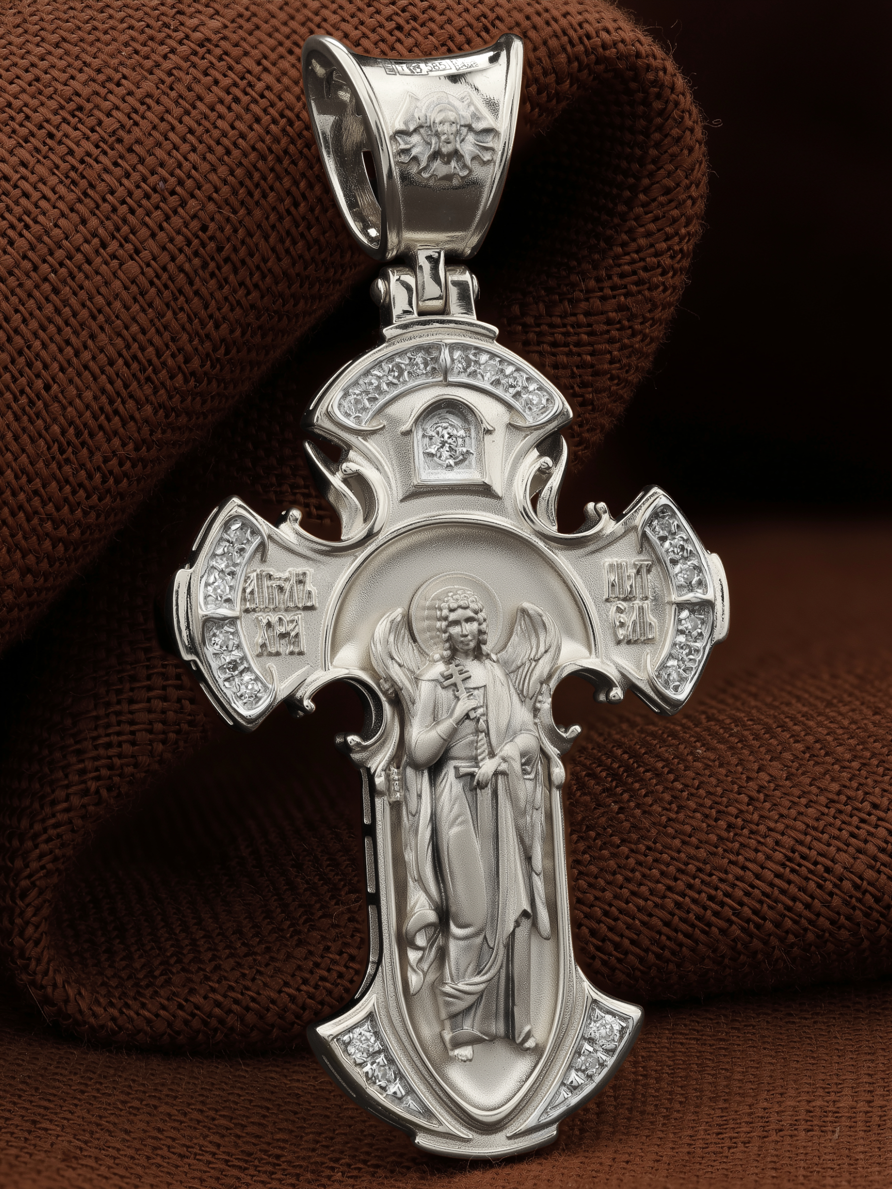 На оборотной стороне креста изображен Святой Ангел-Хранитель. Он держит в правой руке крест, а в левой — мечь. Ангел-Хранитель — это Ангел приставляемый Богом к человеку при крещении для охраны и помощи в добрых делах. Он невидимо находится при человеке на протяжении всей его жизни, если человек сохраняет в себе любовь к Богу и истинную веру перед Ним. Ангел-Xранитель делают для нас все, что служит к истинному нашему благу и спасению души.
