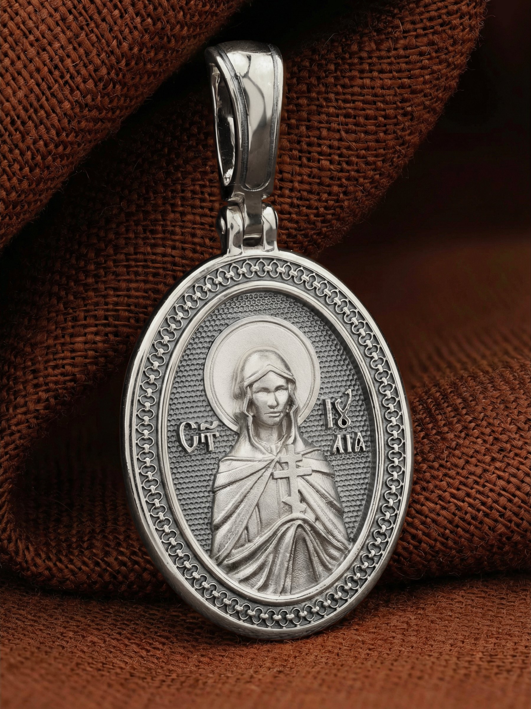 Центральную часть лицевой стороны занимает изображение Святой Мученицы Иулии (Юлии) Корсиканской. Покровительница Корсики, маленькой девочкой попала в плен и была продана в рабство. Служила богатому купцу-язычнику, который старался приобщить ее к своей вере, но юная Юлия свято хранила христианские заповеди, соблюдая себя в чистоте и благочестии. Хозяин удивлялся ее доброму нраву, кротости и смирению. Видя, что она верно служит и усердно работает, оставил ее в покое.
