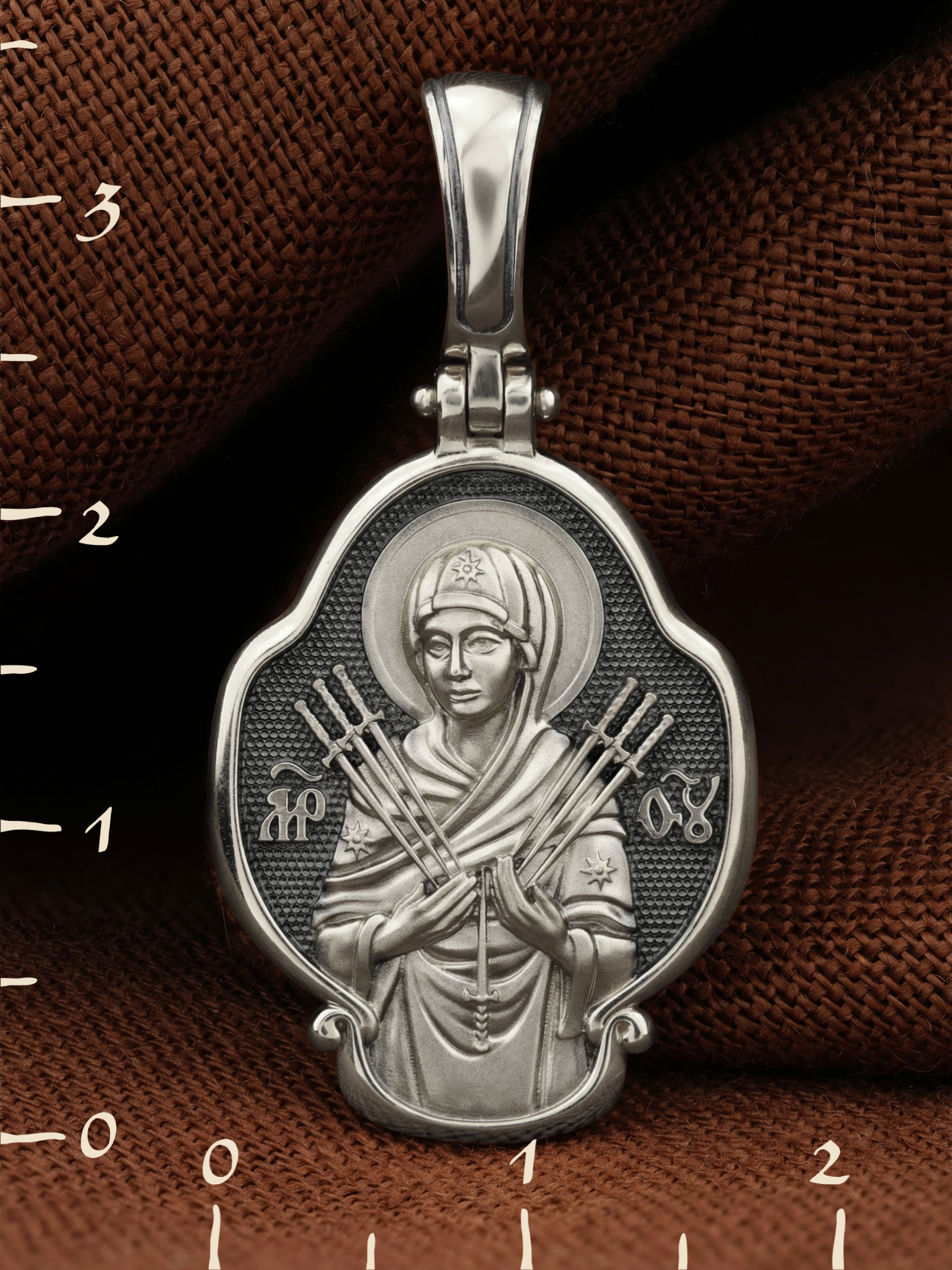 На лицевой стороне образка изображена икона Пресвятой Богородицы «Семистрельная» — одна из самых чудотворных икон на Руси. На протяжении многих веков христиане взывали к Царице Небесной через эту икону, если в стране начинались войны или мятежи.
