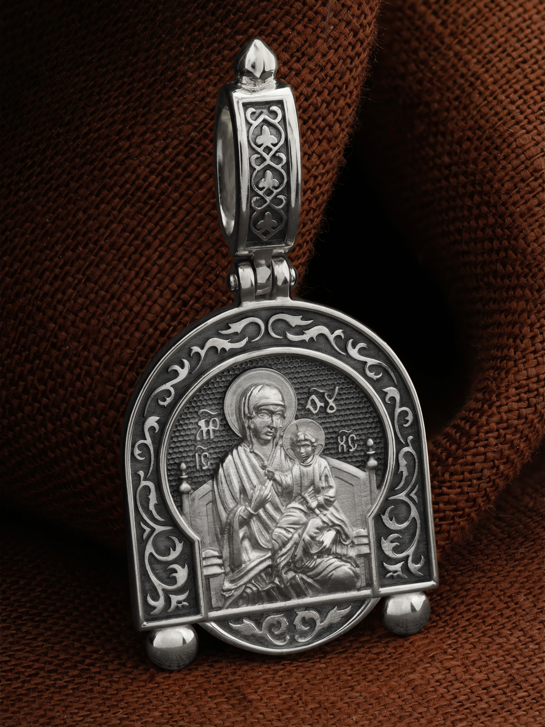 В центр образка помещен образ Божией Матери «Всецарица», восседающая на царском троне. На руках Ее — Богомладенец Иисус Христос со свитком в левой руке. Пальцы Его правой руки сложены в благословляющем жесте.