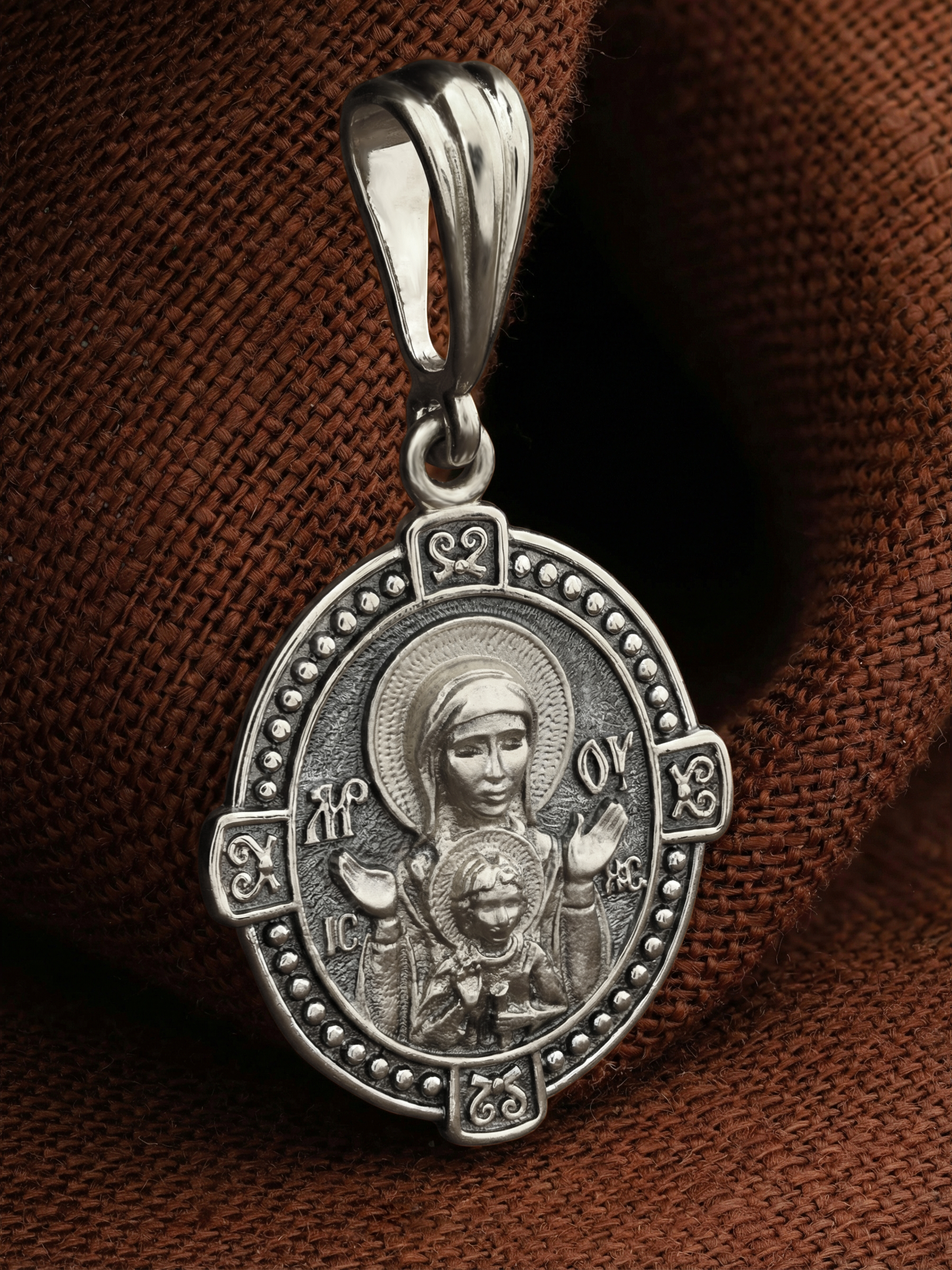 В центр образка помещен образ Божией Матери «Знамение», прославившийся многими чудесами в Новгороде в XII веке. Икона эта чтится как одна из самых великих святынь Русской земли. Молитвенно воздетые руки Богородицы означают заступничество за людей пред Богом. Рядом с Ней, на фоне круглого щита, — благословляющий Божественный Младенец — Спас-Эммануил.