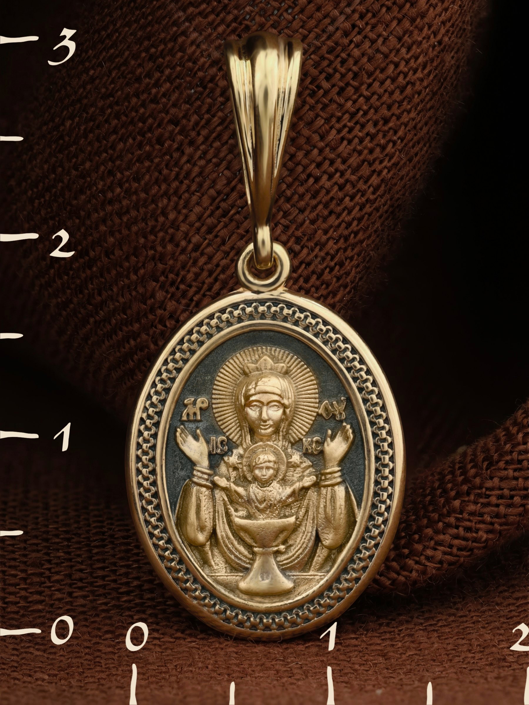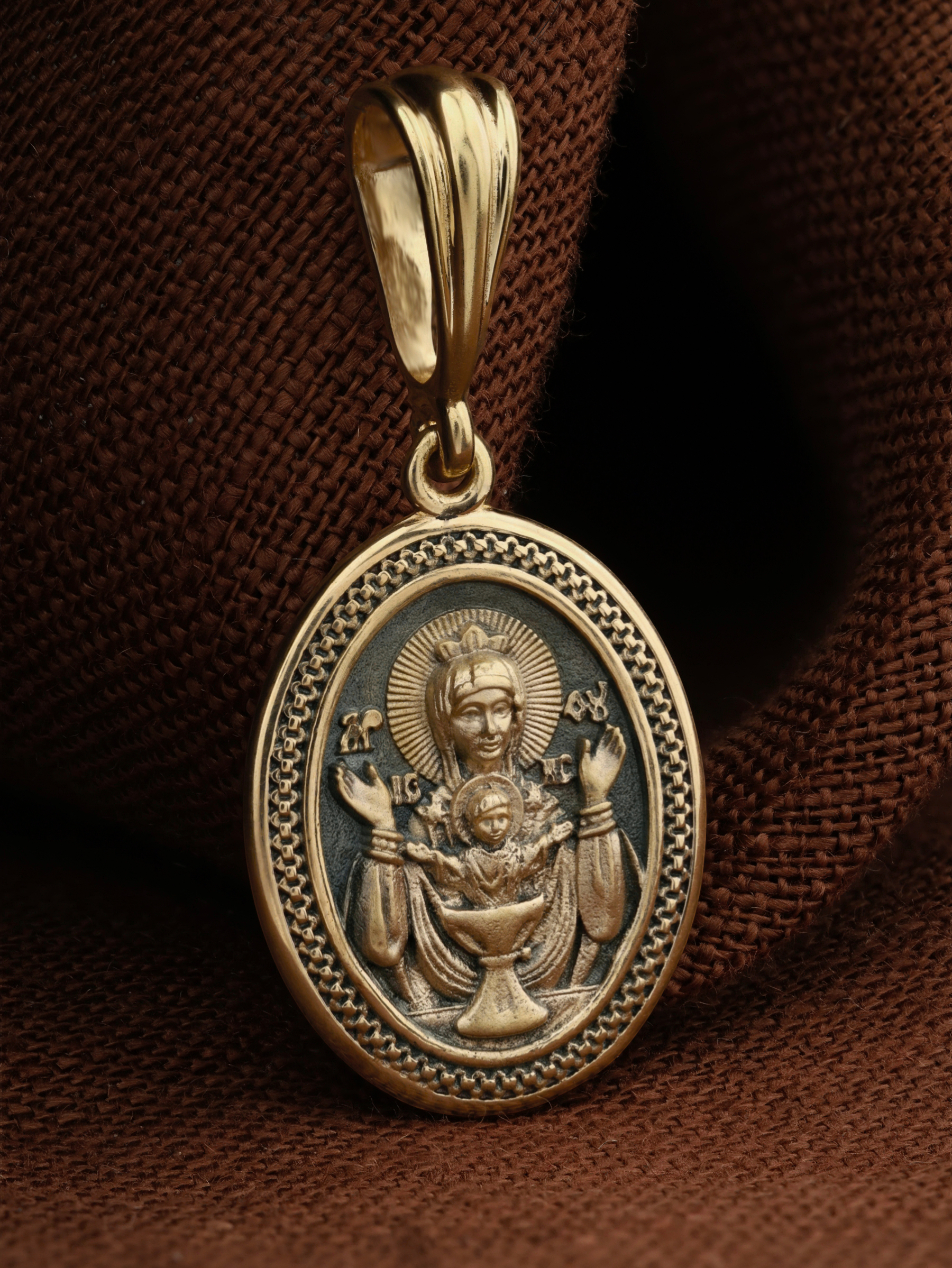 На лицевой части образка изображена икона Божией Матери «Неупиваемая чаша». Икона славится помощью в исцелении зависимостей, помогает людям обрести свободу от греховных страстей.