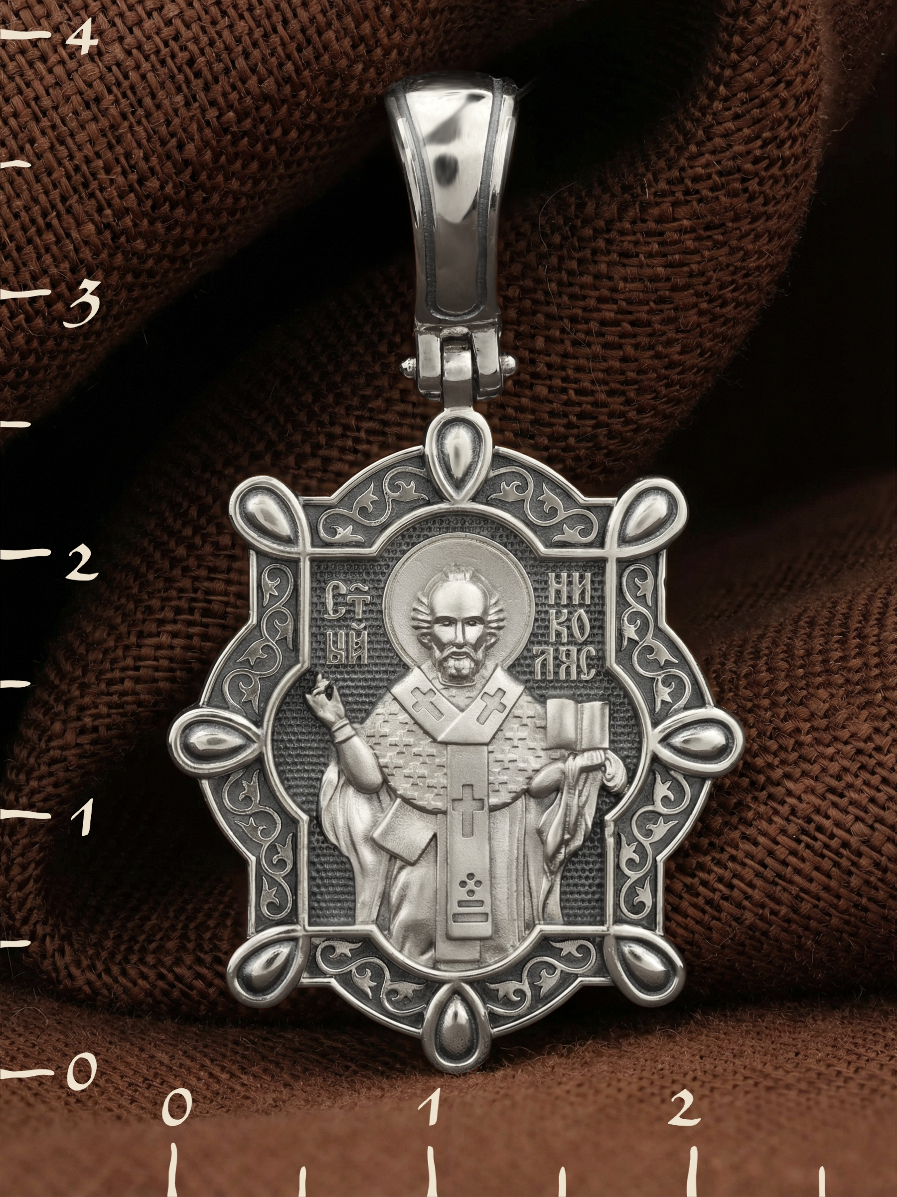 На лицевой стороне образка изображен Святитель Николай архиепископ Мир Ликийских, Чудотворец. Он является одним из самых почитаемых святых в православном мире. Святитель Николай родился во второй половине III века в Малой Азии в Ликийском городе Патары. Сохранилось Предание, что во время крещения он простоял в купели три часа. С детства Святитель избегал развлечений, любил молитву, прекрасно учился и проводил свободное время за чтением Священного писания. Приняв сан священника, святитель Николай стал проводить еще более строгую подвижническую жизнь. Вся жизнь святого Николая — это служение Богу. Он помогал сущим в бедах, укрощал штормы, спасал от потопления и выносил на сушу из глубины морской, освобождал из плена и приносил освобожденных домой, избавлял от темницы, освобождал от смерти, подавал различные исцеления: слепым — прозрение, глухим — слух, немым — дар слова.