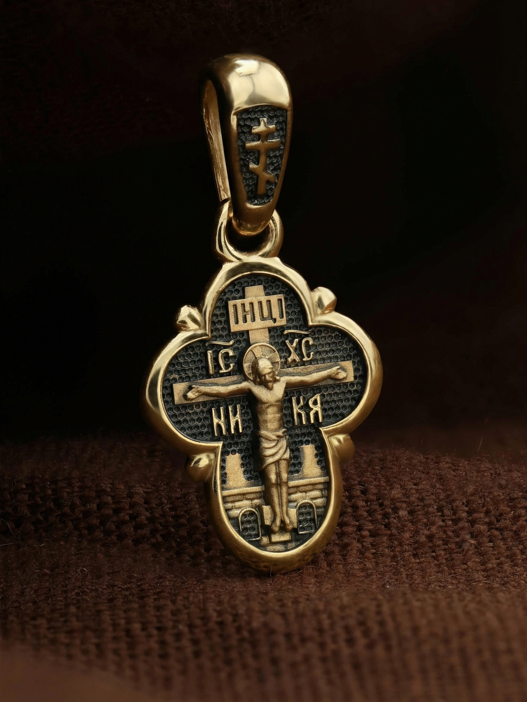 На лицевой стороне креста изображено Распятие Господа и Спасителя нашего Иисуса Христа, отдавшего Себя на смерть, для искупления грехов мира. Крест является символом жертвенной любви Всеблагого Бога к падшим людям, всепобеждающим духовным оружием христиан, основанием и средоточием церковной жизни. Господь сказал: «кто хочет идти за Мною, отвергнись себя, и возьми крест свой, и следуй за Мною». (Мк. 8: 34). На верхней табличке, выше головы Иисуса, расположена надпись, составленная Понтием Пилатом — «IНЦI». Она означает «Иисус Назорей, Царь Иудейский». Надпись «IC» «ХC», означает Иисус Христос, помещается на разных сторонах поперечной перекладины креста. Рядом — слово «НИКА», что означает «победитель». За крестом высится Иерусалимская стена. Над вершиной Распятия, на кулонном кольце, помещен крест.