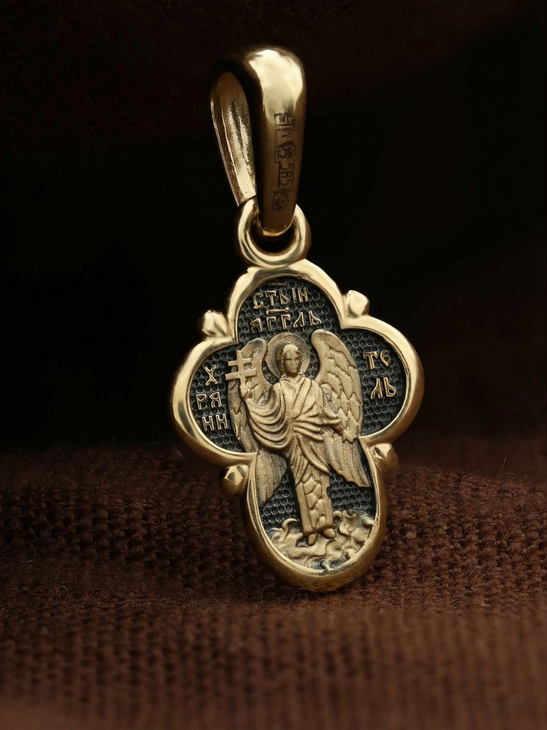 На оборотной стороне креста изображен Святой Ангел-Хранитель держащий в правой руке крест. Ангел-Хранитель — это Ангел приставляемый Богом к человеку при крещении для охраны и помощи в добрых делах. Он невидимо находится при человеке на протяжении всей его жизни, если человек сохраняет в себе любовь к Богу и истинную веру перед Ним. Ангел-Xранитель делают для нас все, что служит к истинному нашему благу и спасению. Невидимо пребывая при нас постоянно, он, руководствуя нас ко спасению, не только по нашему желанию таинственно наставляет нас на все доброе и полезное, не только возносит наши молитвы к Богу, но еще и сам от себя охраняют и защищают нас от врагов видимых и невидимых и ходатайствует за нас пред Богом. Ангел-Хранитель так любит нас, как никто на земле любить не может. Одного лишь каждому из нас он желает — спасения души; к этому он направляет все свои заботы.