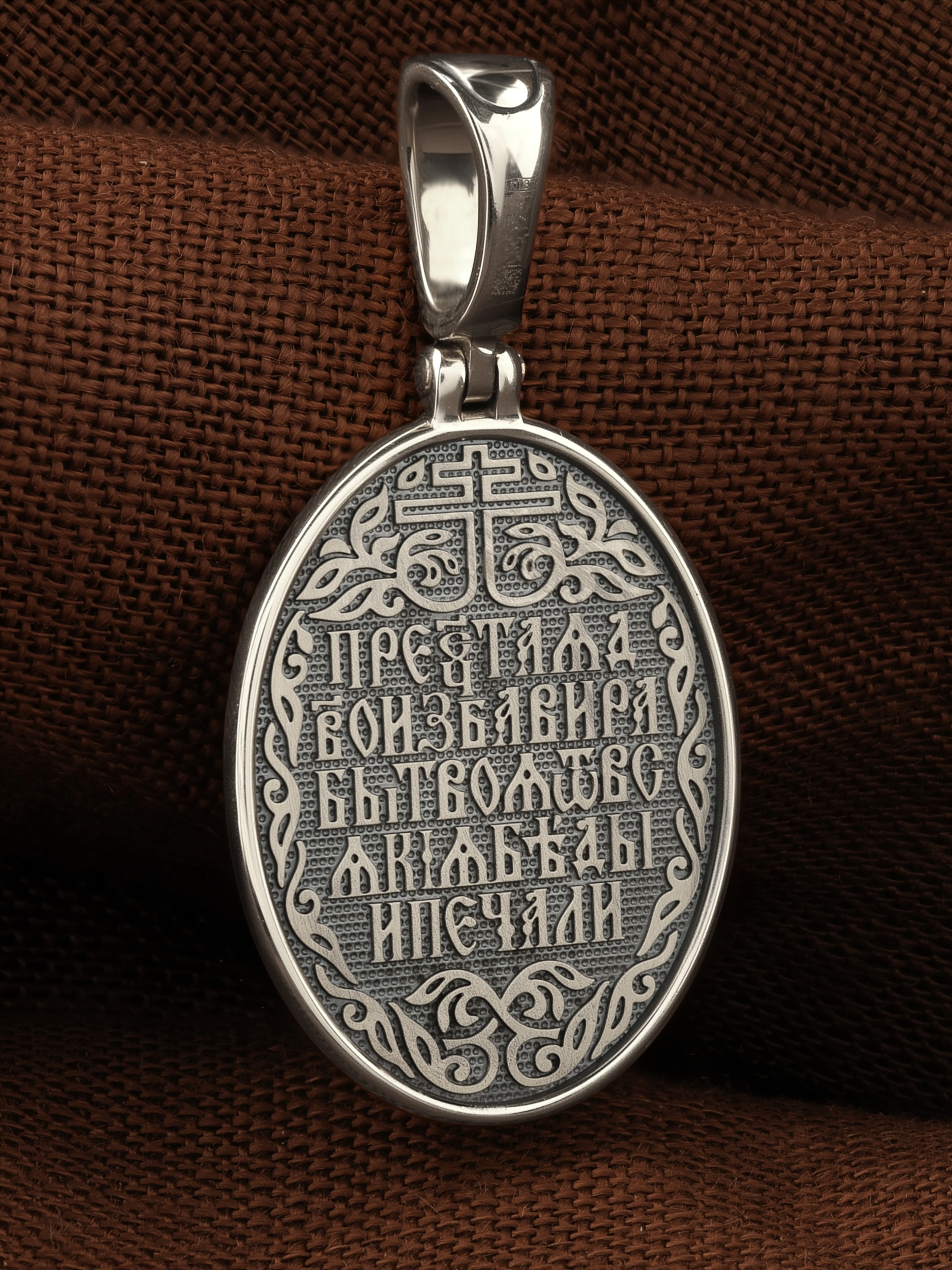 На лицевой стороне образка изображена икона Пресвятой Богородицы «Семистрельная» — одна из самых чудотворных икон на Руси. На протяжении многих веков христиане взывали к Царице Небесной через эту икону, если в стране начинались войны или мятежи.