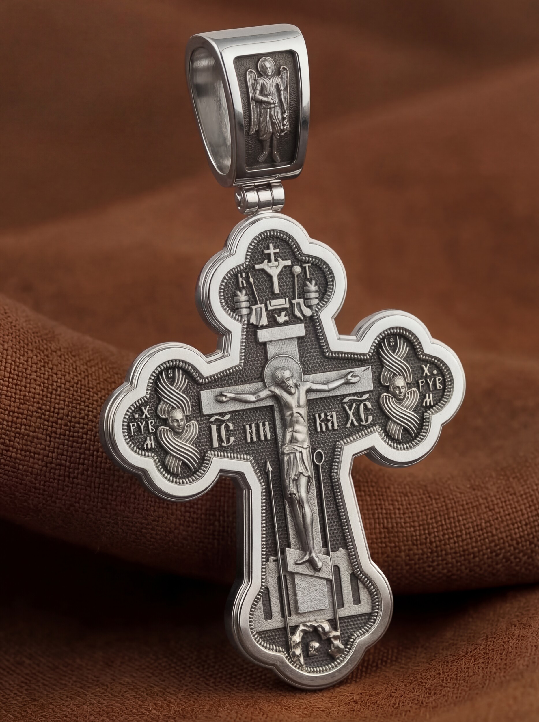 Основой композиции лицевой стороны креста является Распятие Иисуса Христа. Справа и слева от Распятия изображены Ангелы, первыми стоящие у Престола Господа — Херувимы. Под основной перекладиной рядом с титлами Святого имени Христа написано «НИКА», что значит «победитель». Сверху над Распятием помещен Голгофский Крест с цатой, рядом с которым, орудия страданий Господа — трость и копие, обозначенные буквами «Т» и «К».