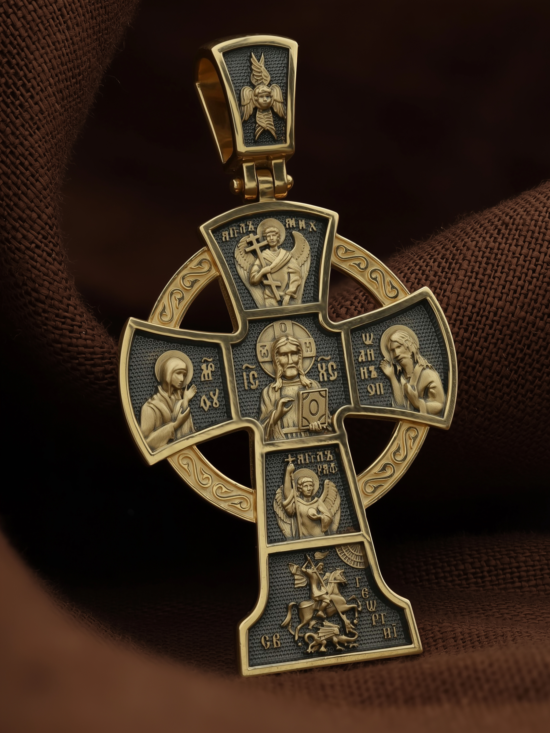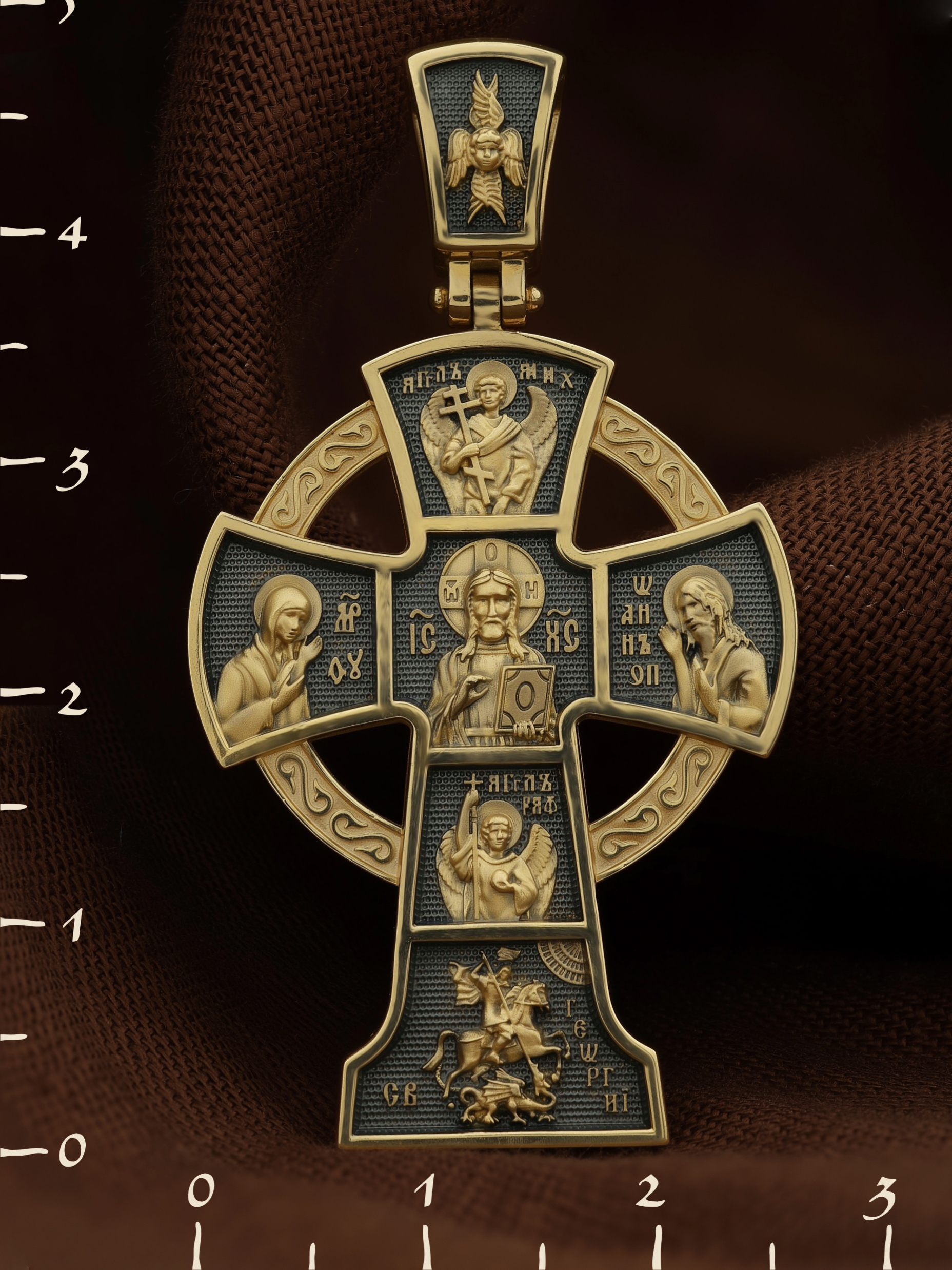 Вверху и внизу от спасителя предстоят два архангела, Михаил (Первый служитель Божественной славы, страж и защитник) и Гавриил (служитель Божественной крепости и изъявитель сокровенных Божьих тайн). Внизу помещен образ свт. Георгия Победоносца. Святой при жизни прославился не только как храбрый воин и твердый исповедник веры, но и как сострадательный, милосердный целитель и чудотворец. Святому молятся о покровительстве воинам и армии, о защите государства, сохранении и спасения России.