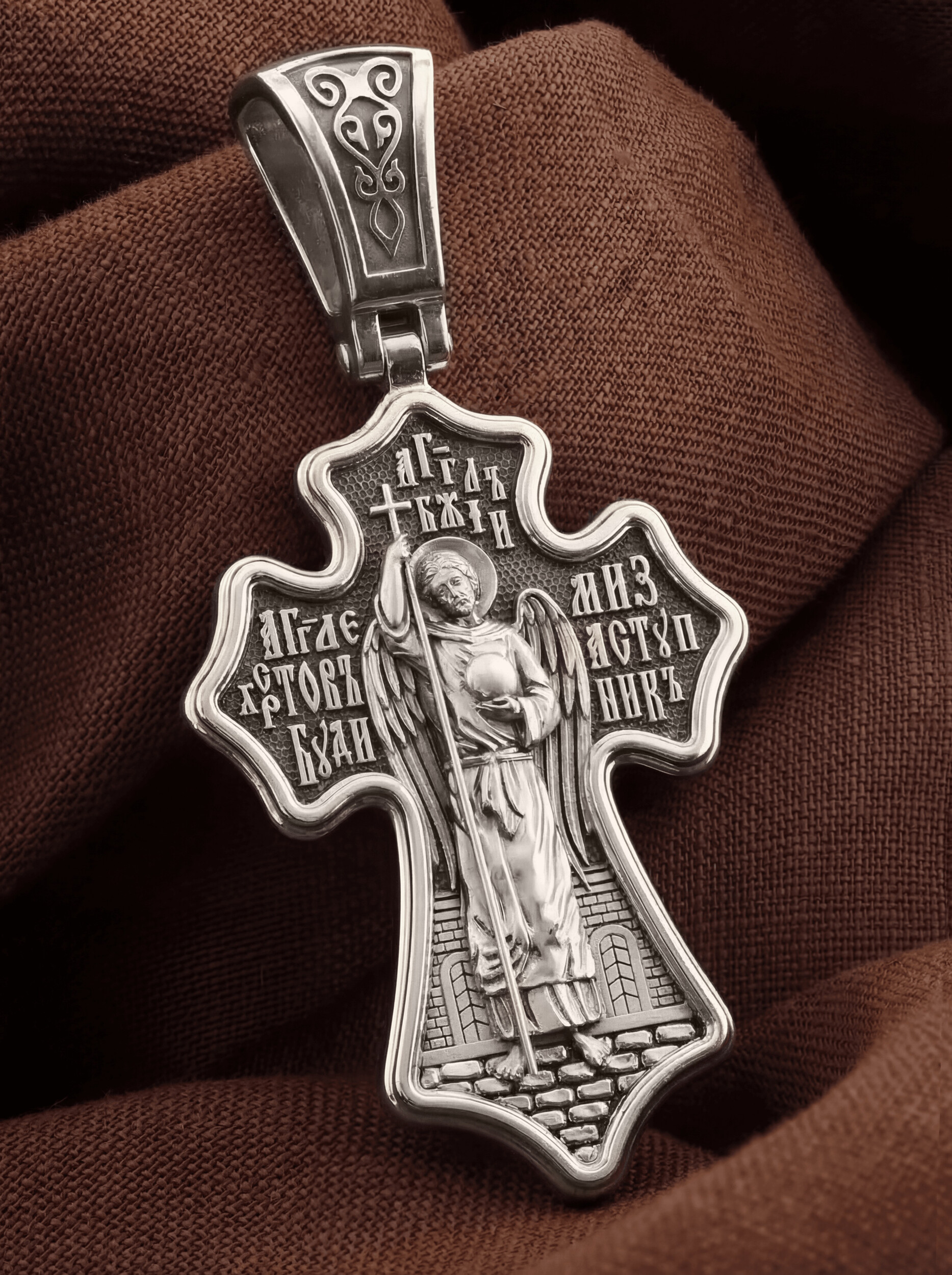 Оборотную сторону креста возглавляет Ангел Хранитель. Он защищает человека от злых духовных и физических нападений. Ангел не может нарушить свободу воли человека, поэтому его надо молитвенно просить о помощи. Вокруг его образа написана молитва: «Ангеле Христов, буди ми заступник».