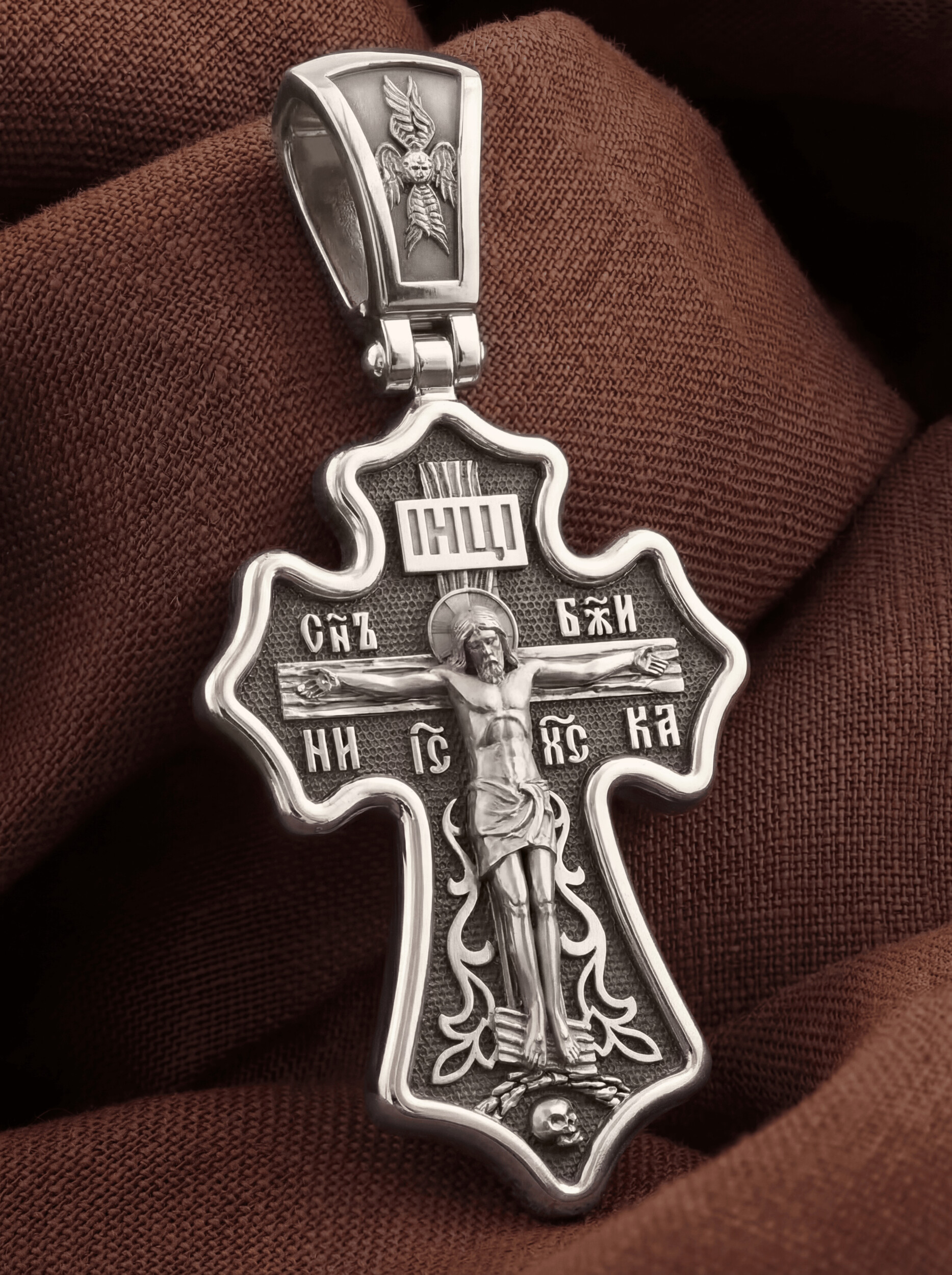 Основной композицией лицевой стороны является Распятие Господа Иисуса Христа. Позади Распятия видна иерусалимская стена, знак того, что Господь был распят вне стен города. Стена символизирует и Небесный Иерусалим, путь который открылся для человека через Голгофу. У подножья Господа в виде скалистой горки видна сама Голгофа с Главой Адамовой в пещере. Распятие сопровождается каноническими надписями. Это святое имя Христа, которое принято писать на иконах сокращенно — «ИС ХС», словосочетание «СЫН БОЖИЙ», что означает божественную природу Иисуса Христа, и надпись «НИКА» — «победитель». Над головой Господа на поперечной перекладине аббревиатура «IНЦI», что символизирует табличку, которая была прибита к Кресту, с надписью «Иисус Назорей Царь Иудейский».