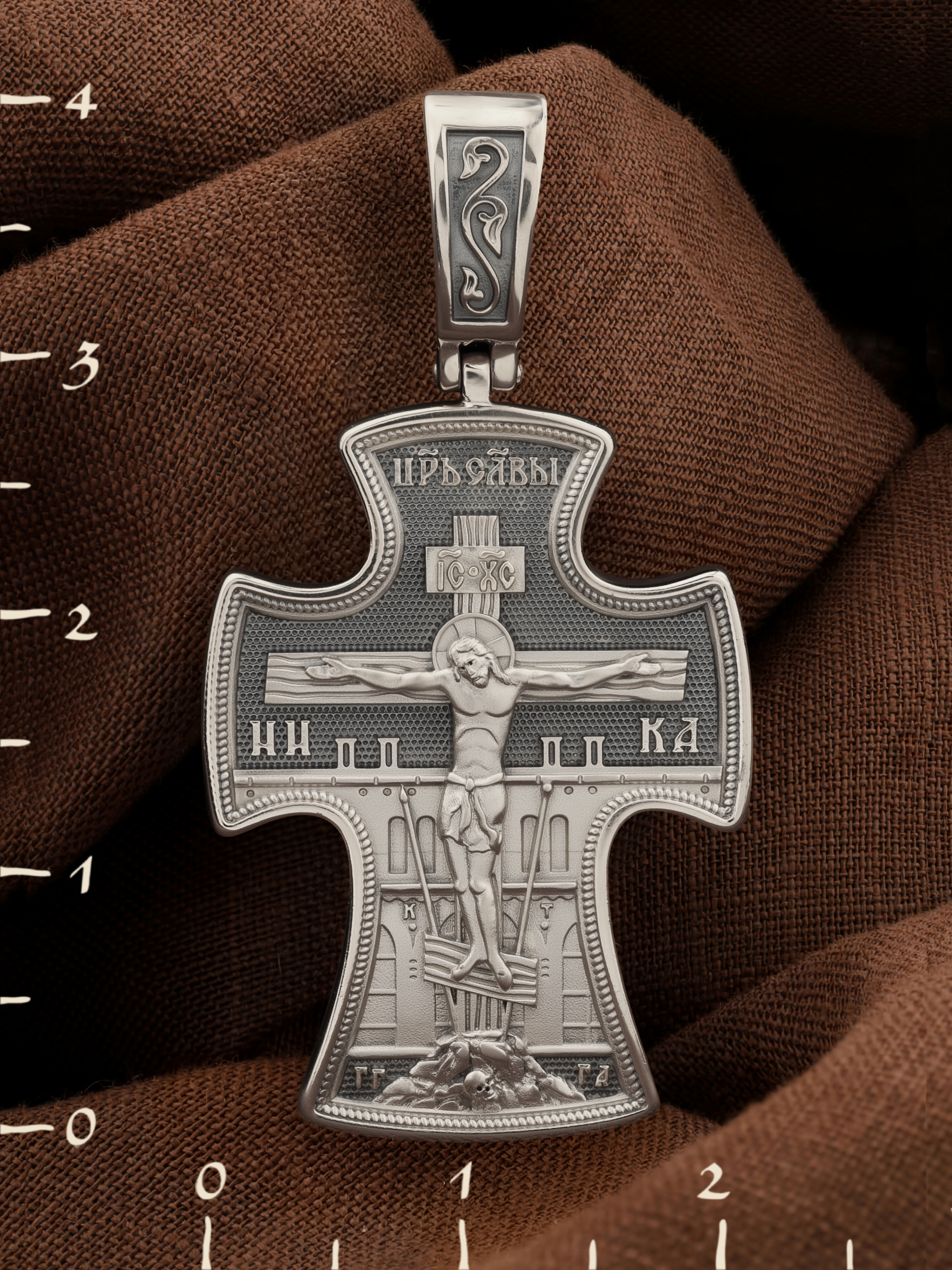 Основное поле лицевой стороны креста занято рельефным изображением Распятия Христова на восьмиконечном Голгофском Кресте. Позади Распятия видна иерусалимская стена, знак того, что Господь был распят вне стен города. Но вместе с тем стена символизирует и Небесный Иерусалим, путь который открылся для человека через Голгофу. У подножья Господа в виде скалистой горки видна сама Голгофа с Главой Адамовой в пещере. По сторонам Голгофы начертаны буквы «ГГ» (Гора Голгофа) и «ГА» (голова Адама). Справа и слева от Креста изображены орудия страданий Господа — трость и копие, обозначенные буквами «Т» и «К». На трости стражники подали Христу пропитанную уксусом губку, когда Он жаждал воды, а копьем пронзили Ему ребра, чтобы проверить: умер ли Он?