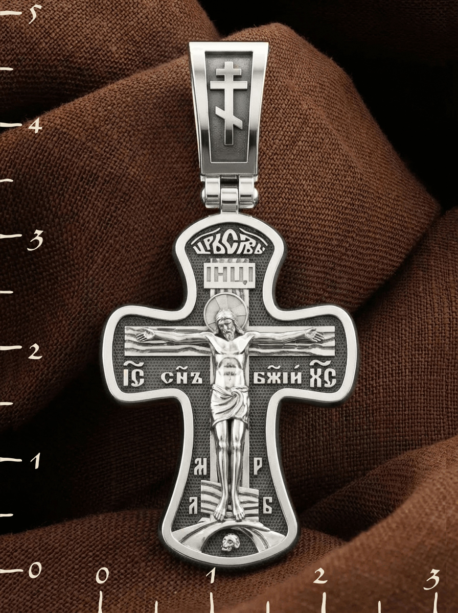 Основой композиции лицевой стороны креста является Распятие Иисуса Христа. С обеих сторон горизонтальной перекладины надписи: монограмма святого имени Христа — «ИС ХС», а под ней «Сын Божий». Над головой Господа на поперечной перекладине аббревиатура «IНЦI», что символизирует «Иисус Назорей Царь Иудейский». Венчает лицевую сторону креста надпись «Царь Славы». В подножии мы видим изображенную гору Голгофу в виде скалистой горки, а так же буквы «МЛ» «РБ», которые означают: «Место Лобное Рай Бысть». Крест стоит на горе камней, символизирующих Голгофу, в основании которой различается череп. Это голова Адама.