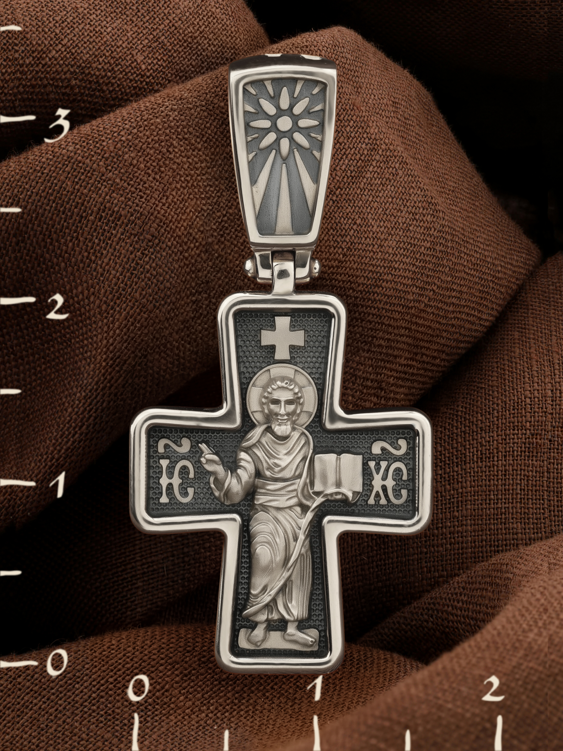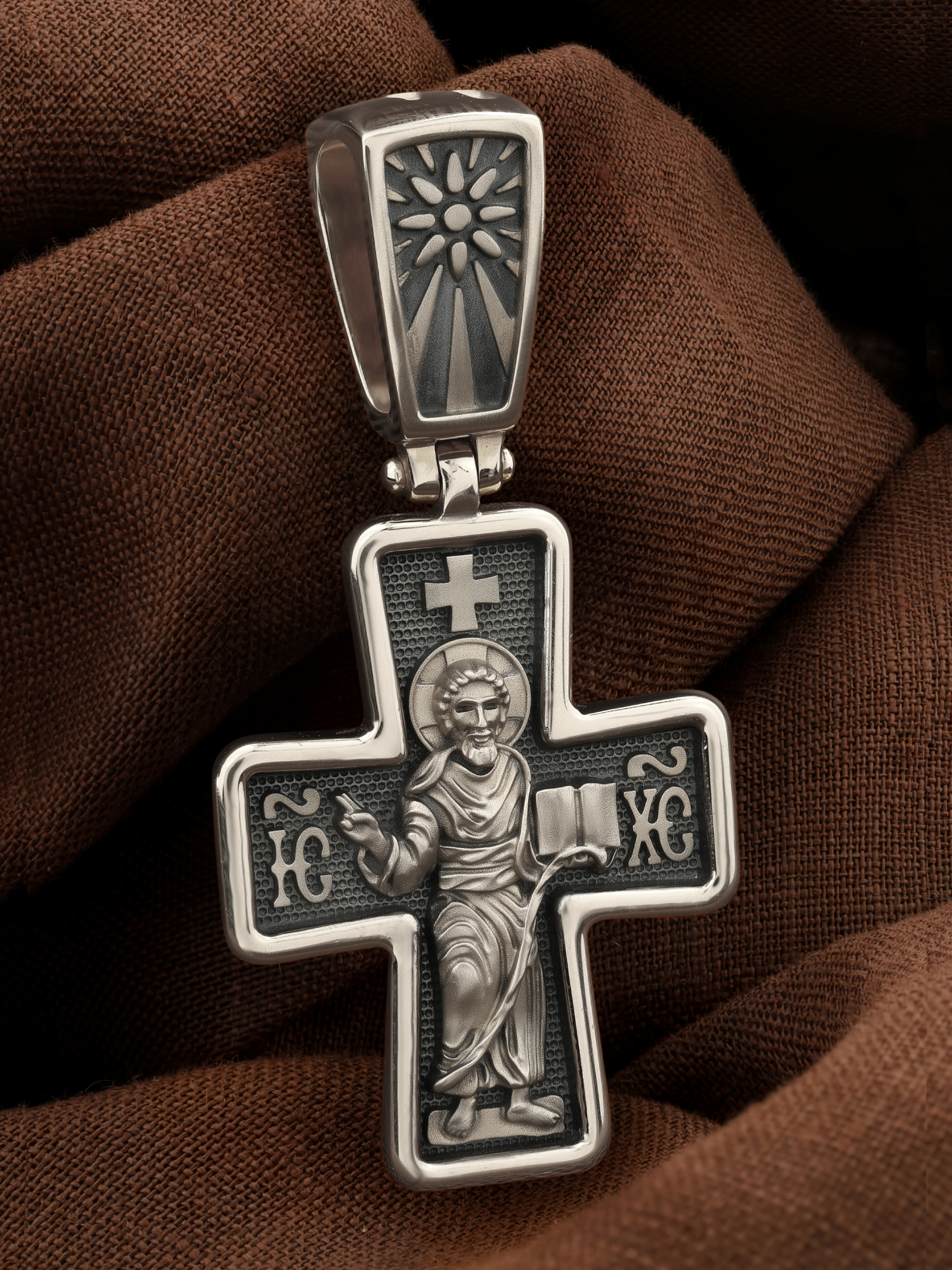 На лицевой стороне креста изображена икона Господа и Спасителя нашего Иисуса Христа — Господь Вседержитель или Пантократор. Он представлен как Царь Небесный и будущий Судия мира. Именование Иисуса «Вседержителем» указывает, с одной стороны, на Его Божественную природу: «Аз есмь Альфа и Омега, начало и конец, говорит Господь, Который есть и был и грядет, Вседержитель» (Откр. 1: 8). С другой стороны, такое именование связано и с человеческой природой Христа, искупившего крестной жертвой людские грехи и обновившего тем самым человеческую природу. Правой рукой Он благословляет, а левой держит Книгу. Она символизирует Евангелие — благую весть, принесенную Христом всему миру. Указывая на раскрытое Евангелие и одновременно благословляя, Иисус недвусмысленно указывает нам путь к спасению души.
