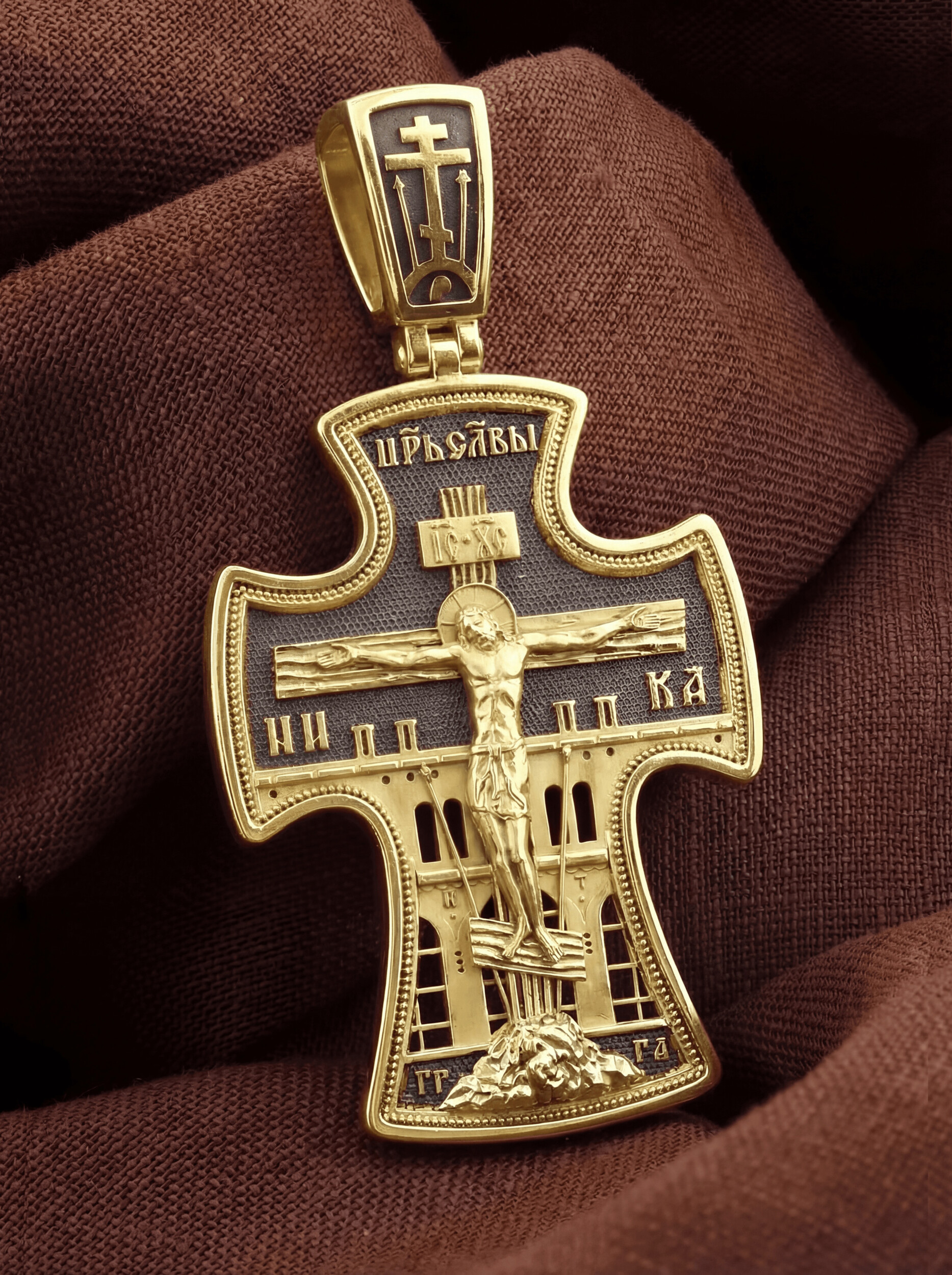 Основное поле лицевой стороны креста занято рельефным изображением Распятия Христова на восьмиконечном Голгофском Кресте. Позади Распятия видна иерусалимская стена, знак того, что Господь был распят вне стен города. Но вместе с тем стена символизирует и Небесный Иерусалим, путь который открылся для человека через Голгофу. У подножья Господа в виде скалистой горки видна сама Голгофа с Главой Адамовой в пещере. По сторонам Голгофы начертаны буквы «ГГ» (Гора Голгофа) и «ГА» (голова Адама). Справа и слева от Креста изображены орудия страданий Господа — трость и копие, обозначенные буквами «Т» и «К». На трости стражники подали Христу пропитанную уксусом губку, когда Он жаждал воды, а копьем пронзили Ему ребра, чтобы проверить: умер ли Он?