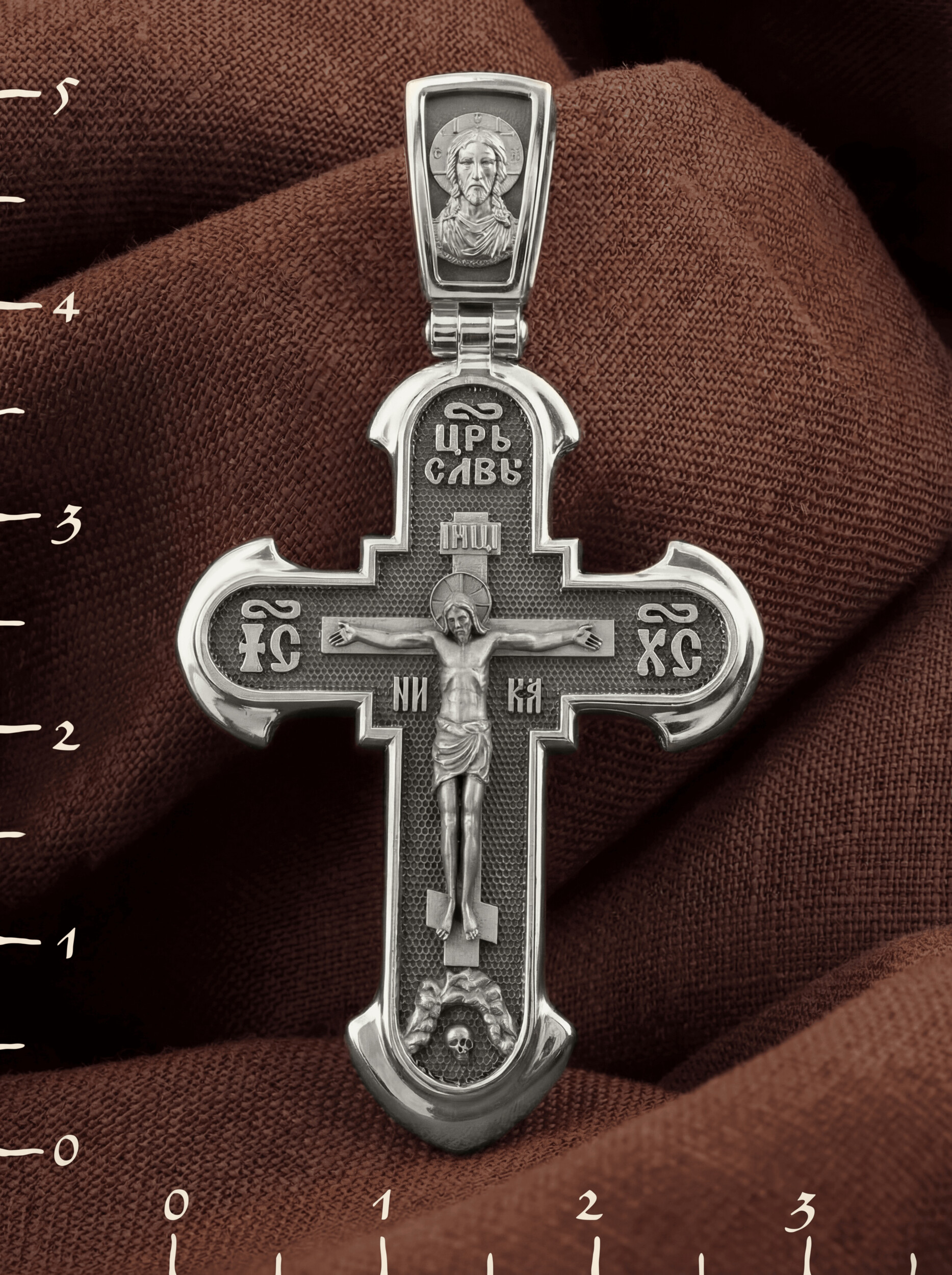 На лицевой стороне креста изображено Распятие Господа нашего Иисуса Христа. В традиции Православия — принято изображать Спасителя как Воскресшего Крестоносителя, призывающего в Свои объятия все концы мира. Его руки имеют горизонтальное положение, открытые ладони пробиты гвоздями, голова наклонена вправо, вокруг головы крестчатый нимб. Крест стоит на горе камней, символизирующих Голгофу, в основании которой различается череп. Это голова Адама. По преданию, тело Адама было погребено Симом, сыном Ноя, на месте, где впоследствии возникла гора Голгофа. Над головой Господа на поперечной перекладине аббревиатура «IНЦI», что символизирует табличку, которая была прибита к Кресту, с надписью «Иисус Назорей Царь Иудейский». Этим иудеи хотели посмеяться над Христом, не зная, что распинают истинного Царя всех царей. По бокам поперечной перекладины титлы святого имени Христа «IC» (Иисус) «ХС» (Христос), и слово «НИКА», что в переводе с греческого означает «победитель». Венчает лицевую сторону креста надпись «Царь Славы».