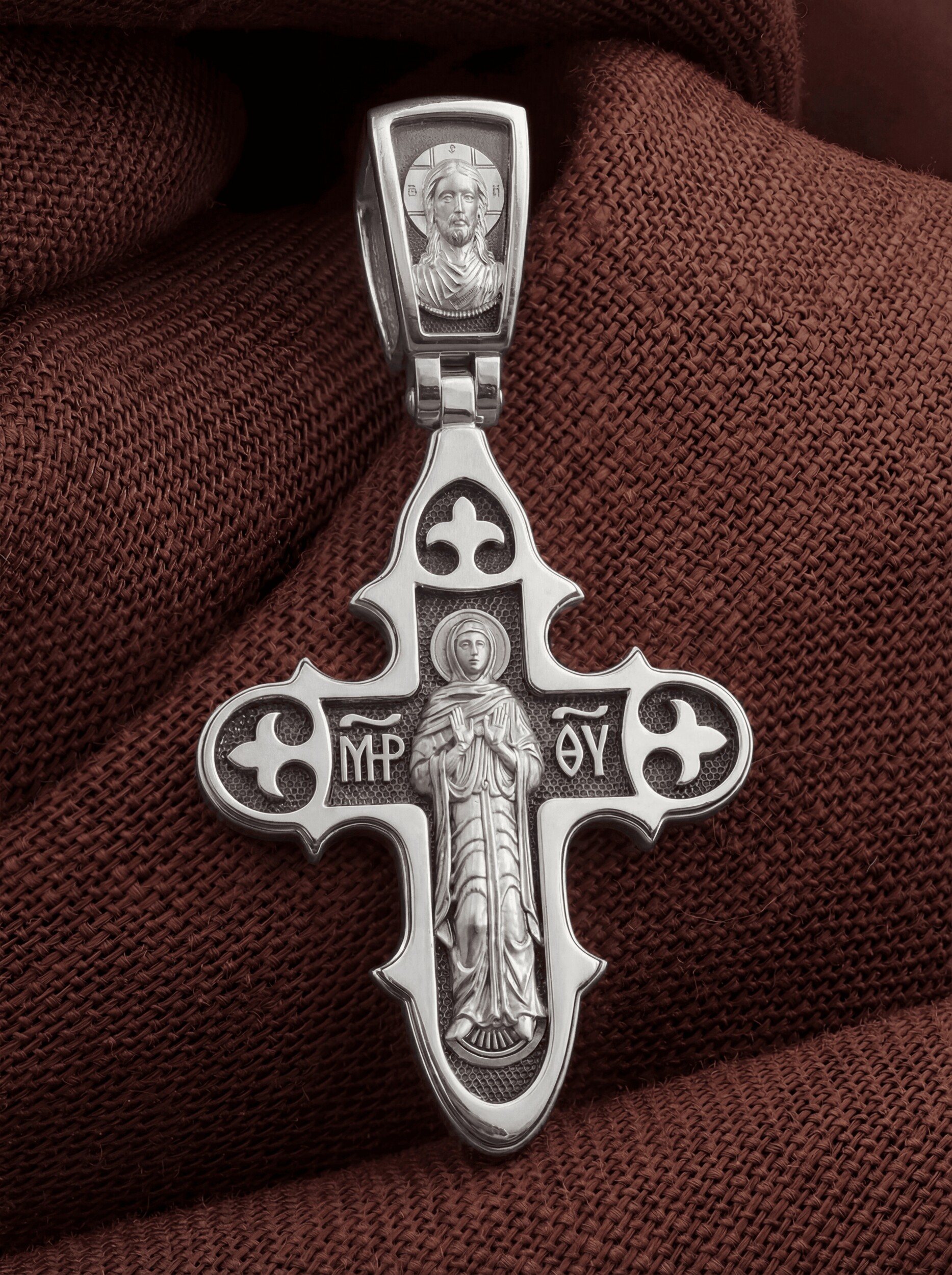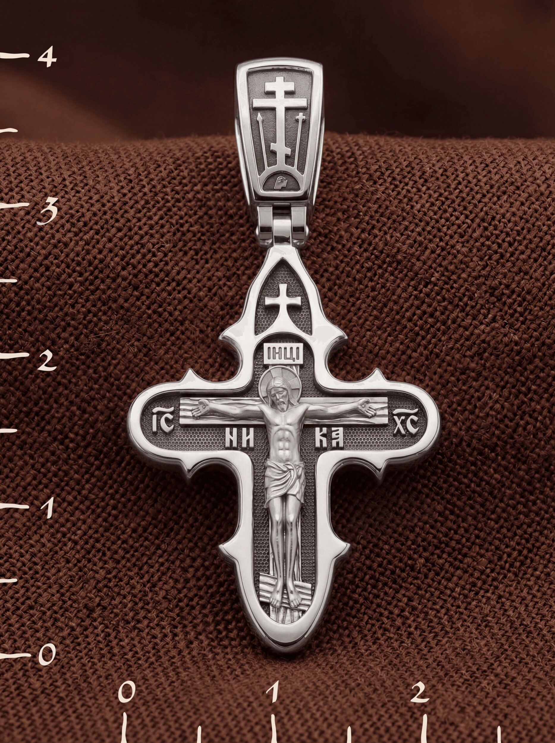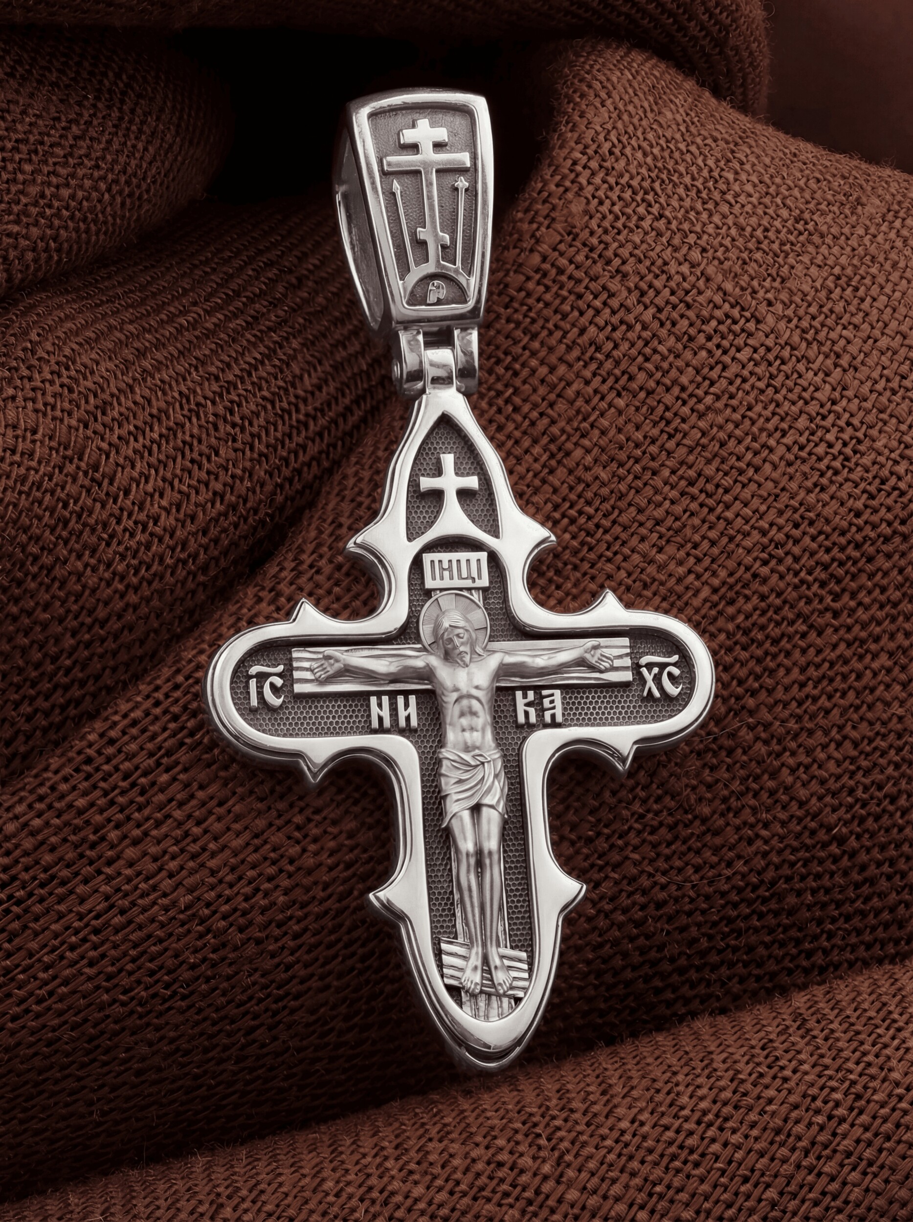На лицевой стороне нательного креста по традиции изображено Распятие Господа Иисуса Христа. Православная иконография показывает нам распятого Господа не в виде мучительно умирающего человека, а как величественного и всесильного Бога, который простирает руки, словно обнимает весь мир. Человеческие страдания Господа обозначаются только наклоном Его головы и полузакрытыми глазами.