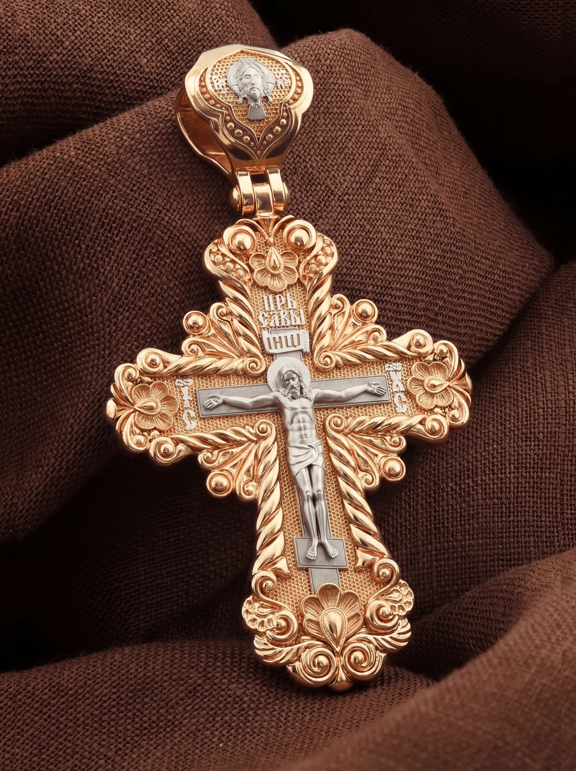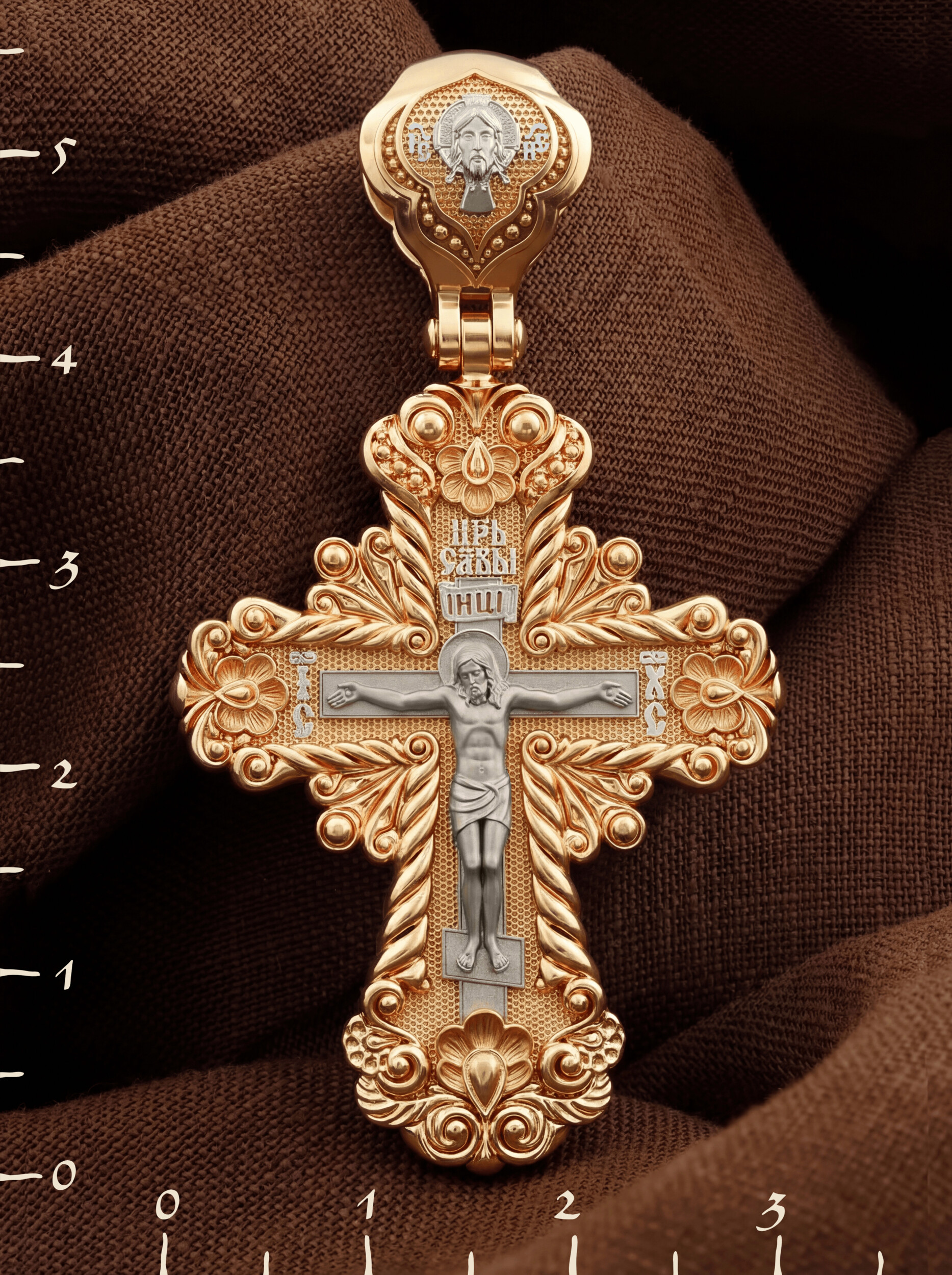 На лицевой стороне креста изображено Распятие Господа и Спасителя нашего Иисуса Христа, отдавшего Себя на смерть, для искупления грехов мира. Крест является символом жертвенной любви Всеблагого Бога к падшим людям, всепобеждающим духовным оружием христиан, основанием и средоточием церковной жизни. Господь сказал: кто хочет идти за Мною, отвергнись себя, и возьми крест свой, и следуй за Мною. (Мк. 8: 34). Над Распятием помещена надпись «Царь Славы». На верхней табличке, выше головы Иисуса, расположена надпись, составленная Понтием Пилатом — «IНЦI». Она означает «Иисус Назорей, Царь Иудейский». Надпись «IC» «ХC», означает Иисус Христос, помещается на разных сторонах поперечной перекладины креста. На кулонном кольце изображен Нерукотворный образ Господа и Спасителя нашего Иисуса Христа, чудесно отпечатавшийся на плате, которым Христос вытер свой лик.