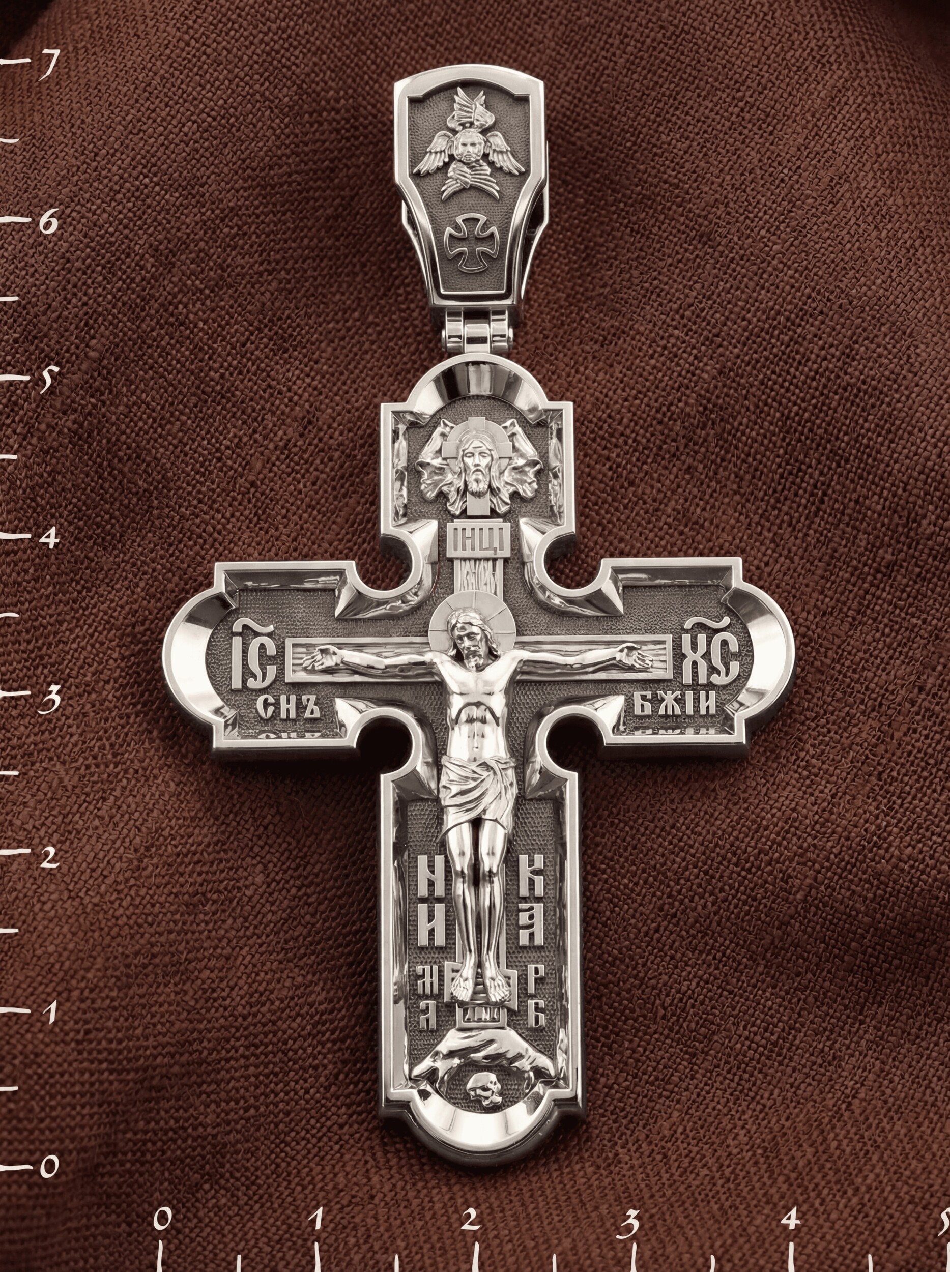На лицевой стороне нательного креста по традиции изображено Распятие Господа нашего Иисуса Христа. Крест Господень стоит на небольшом каменистом возвышении, символизирующем гору Голгофу, которая обозначена буквами МЛРБ (Место Лобное Рай Бысть). Над головой Господа на поперечной перекладине написано «ИНЦИ», что символизирует табличку, которая была прибита к Кресту, с надписью «Иисус Назорей Царь Иудейский». Этим иудеи хотели посмеяться над Христом, не зная, что распинают истинного Царя всех царей. По сторонам основной перекладины расположены позолоченные рельефные инициалы Христа «ИС ХС». Под перекладиной, по сторонам древа, находится надпись «СЫН БОЖИЙ», а в основании креста — надпись «НИКА» (Победитель).