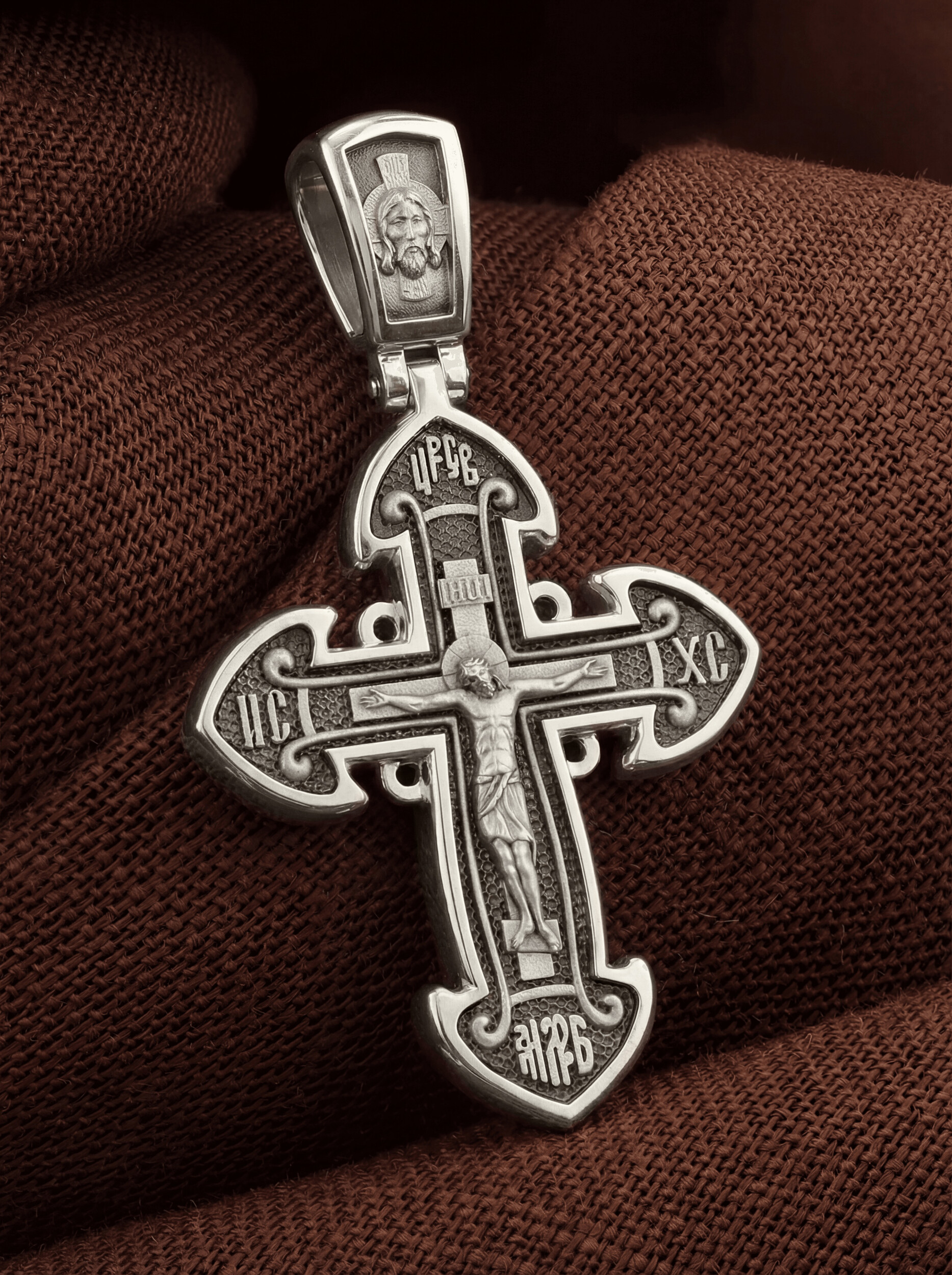 Традиционно на лицевой стороне этого креста изображено Распятие. Это связано с тем, что любой нательный крест в первую очередь символизирует крестные страдания Христа, Его смерть и Воскресение. Поэтому древний вид Распятия являет вознесенного на Крест Сына Божия не просто прибитого к кресту, а словно простирающего руки и призывающего в Свои объятия весь мир. Сохраняя образ страдания Христа, такой вид Распятия в то же время удивительно точно передает его духовный смысл. Христос, распятый и умерший, изображен живым в самой Своей смерти. С двух сторон раскинутых рук Христа написаны инициалы Его имени — «ИС ХС». Сверху над Распятием размещена надпись «Царь Славы», а у подножия Господа видна аббревиатура «МЛ РБ» (Место Лобное Рай Бысть), символизирующая гору Голгофу.