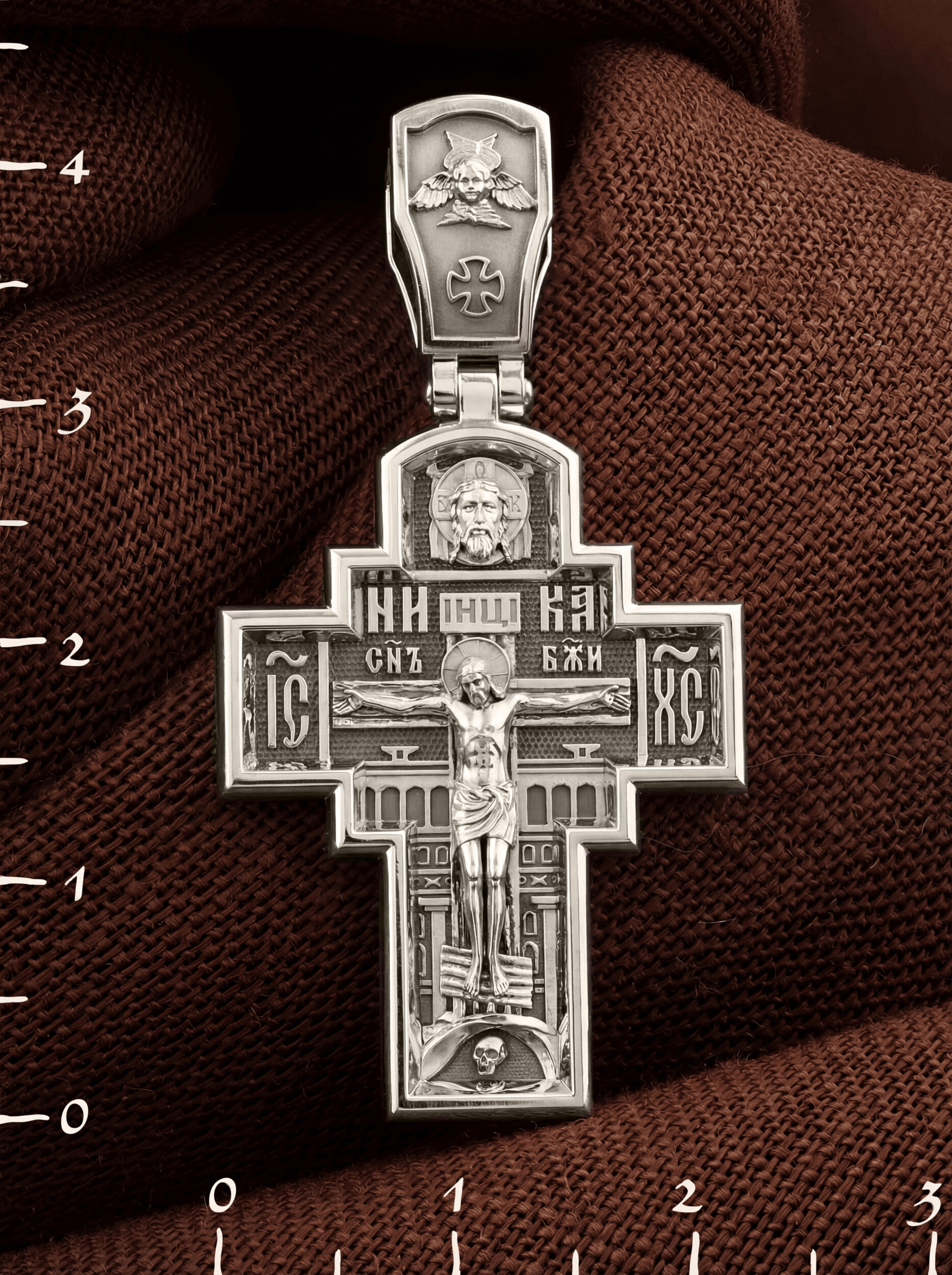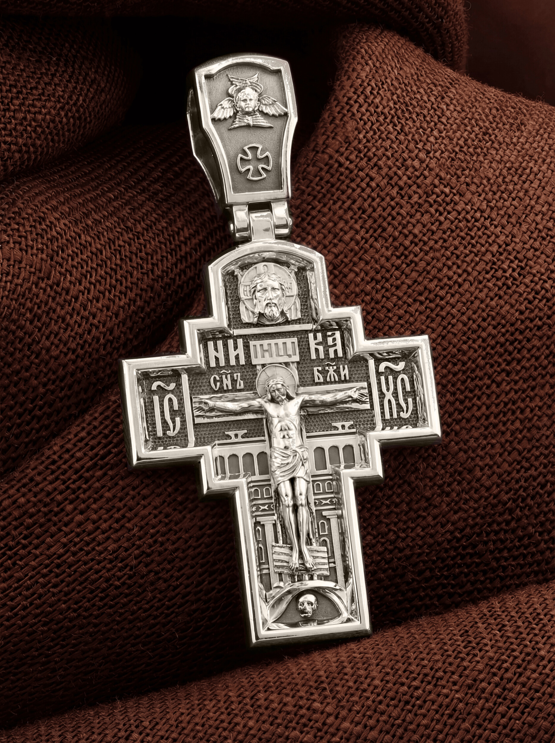 Основной композицией лицевой стороны является Распитие Господа Иисуса Христа. Позади Распятия видна иерусалимская стена, знак того, что Господь был распят вне стен города. Но вместе с тем стена символизирует и Небесный Иерусалим, путь который открылся для человека через Голгофу. У подножья Господа в виде скалистой горки видна сама Голгофа с Главой Адамовой в пещере. Распятие сопровождается каноническими надписями. Это святое имя Христа, которое принято писать на иконах сокращенно — «ИС ХС», словосочетание «СЫН БОЖИЙ», что означает божественную природу Иисуса Христа, и надпись «НИКА» — «победитель». Над Распятием помещено изображение Спаса Нерукотворного — образ Спасителя, который Он запечатлел на плате и передал для исцеления больному проказой царю Эдессы.