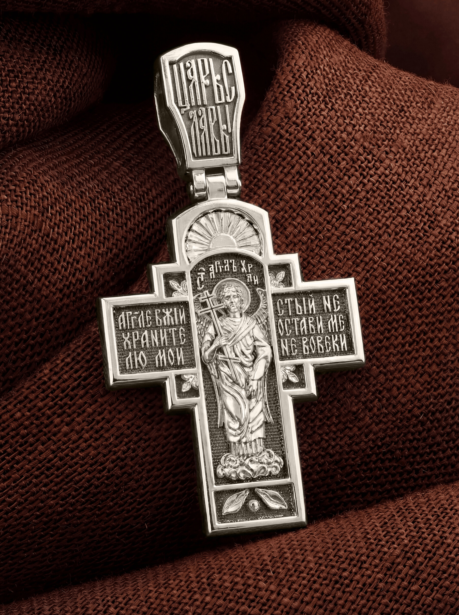 Оборотную сторону креста возглавляет Ангел Хранитель с крестом: им он защищает человека от злых духовных и физических нападений. Ангел не может нарушить свободу воли человека, поэтому его надо молитвенно просить о помощи: «Ангеле Божий, хранителю мой святый, не остави мене вовеки», — эта молитва написана вокруг его образа.
