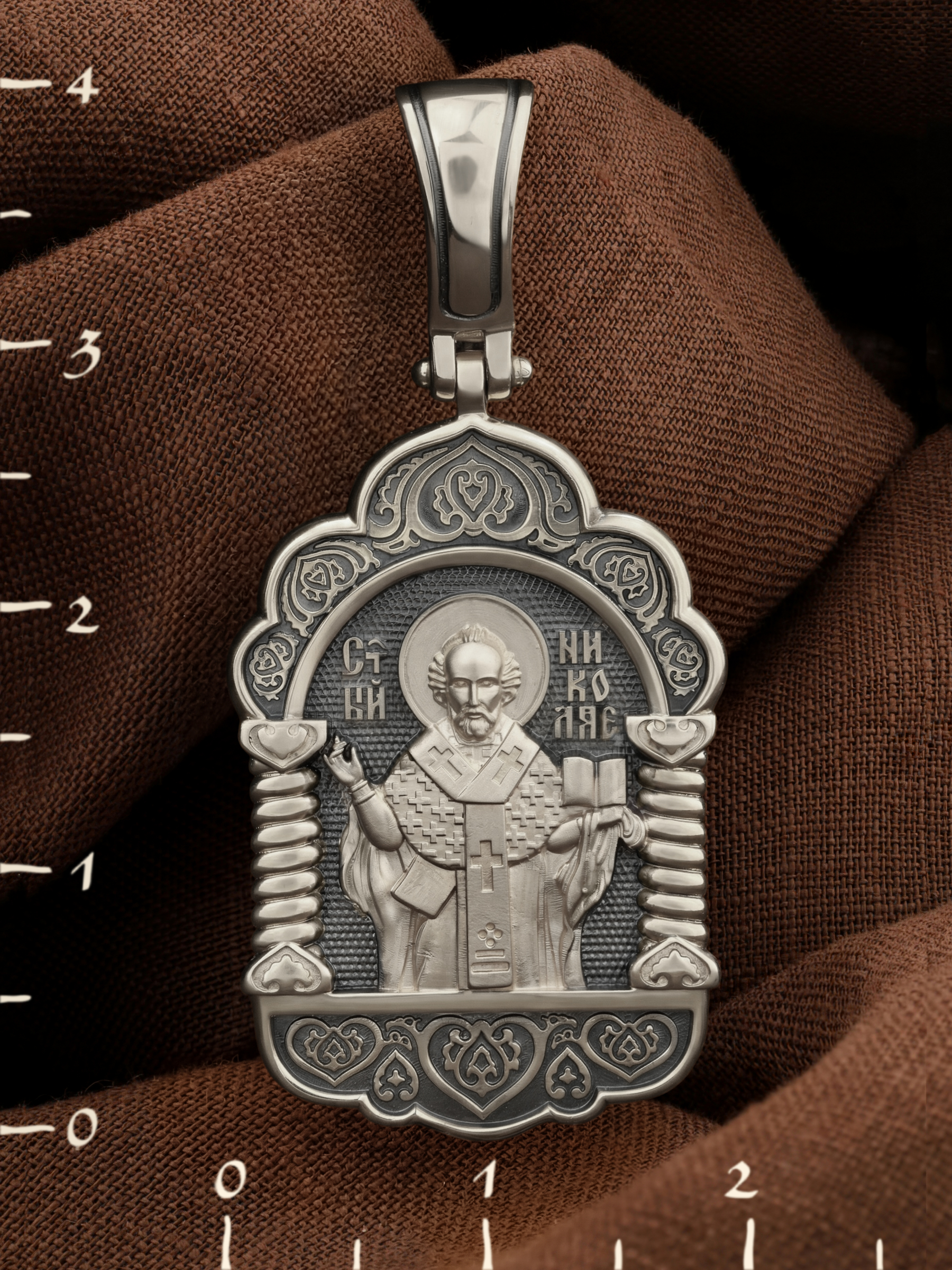 На лицевой стороне образка изображен Святитель Николай архиепископ Мир Ликийских, Чудотворец. Он является одним из самых почитаемых святых в православном мире. Святитель Николай родился во второй половине III века в Малой Азии в Ликийском городе Патары. С рождения Божий Угодник проявлял необыкновенные дарования. Сохранилось Предание, что во время крещения он, никем не поддерживаемый, простоял в купели три часа. Приняв сан священника, святитель Николай стал проводить еще более строгую подвижническую жизнь. Избранник Божий Николай стал вершиной всех добродетелей, поднятой до райской высоты. С кем из величайших праведников не сравнялся он образом духовной красоты, кому из них не последовал в своих деяниях и чудотворениях? Вся жизнь святого Николая — это служение Богу. Много великих и преславных чудес сотворил великий Святитель Николай Угодник. Он помогал сущим в бедах, укрощал штормы, спасал от потопления и выносил на сушу из глубины морской, освобождал из плена и приносил освобожденных домой, избавлял от уз и темницы, защищал от посечения мечом, освобождал от смерти и подавал многим различные исцеления, слепым прозрение, хромым хождение, глухим слух, немым дар слова.