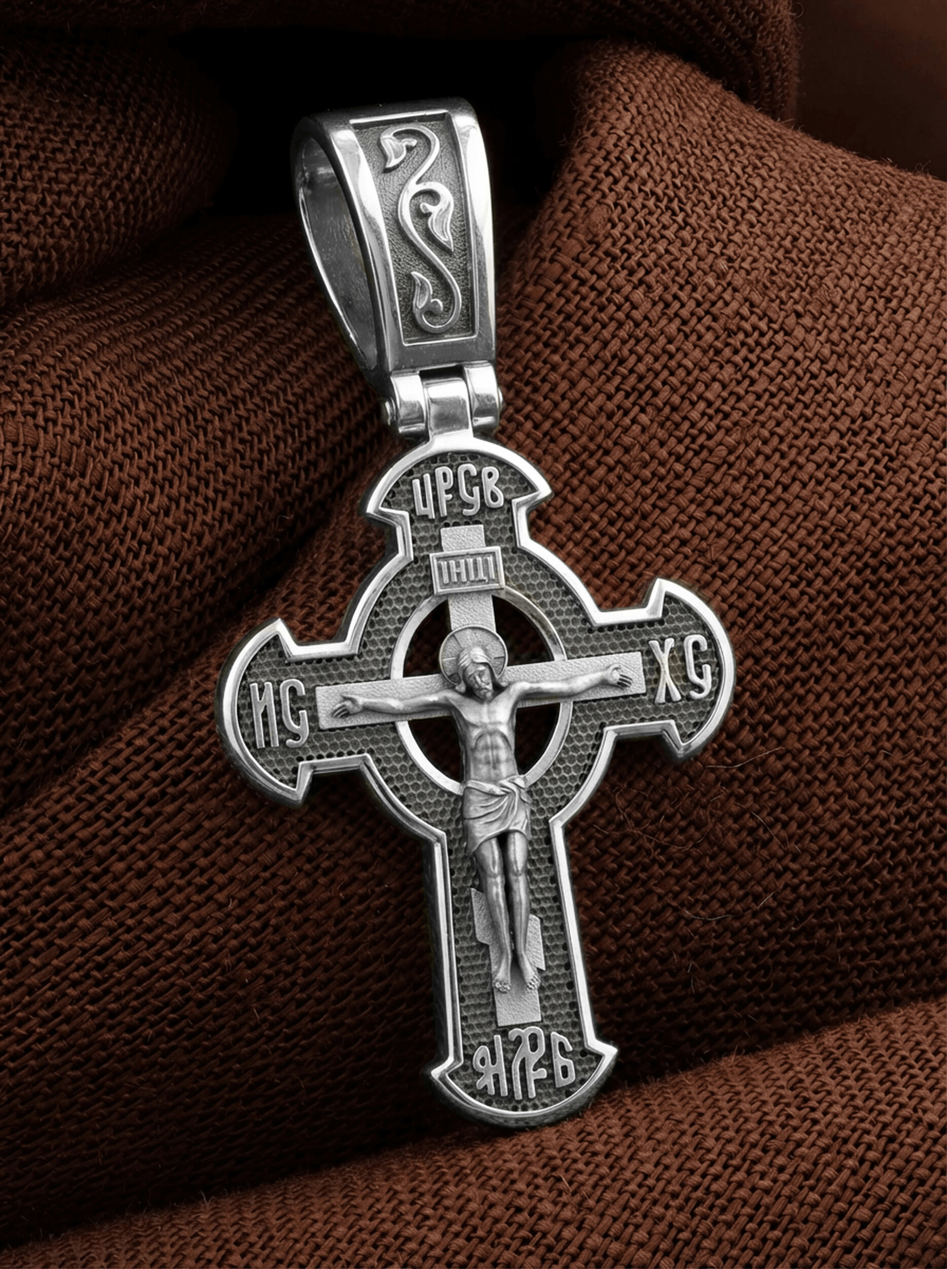 Соединенные вместе крест и круг созидают всеобъемлющий образ мирозданья. Оно объединяется во Христе, образ которого мы видим по центру. Иисус Христос, могущественный и милосердный Царь и Бог.