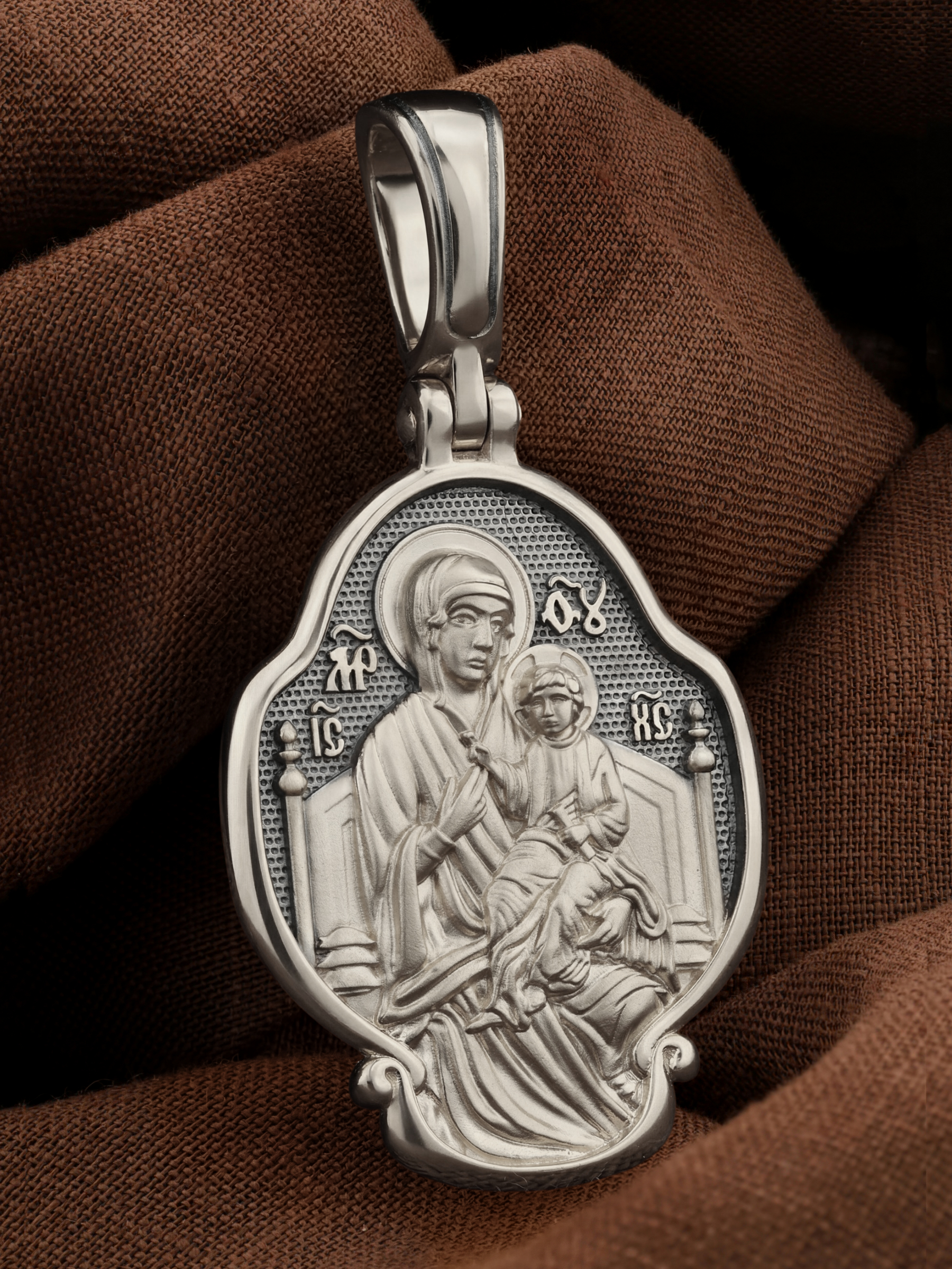 В центр образка помещен образ Божией Матери «Всецарица», восседающая на царском троне. На руках Ее — Богомладенец Иисус Христос со свитком в левой руке. Пальцы Его правой руки сложены в благословляющем жесте.