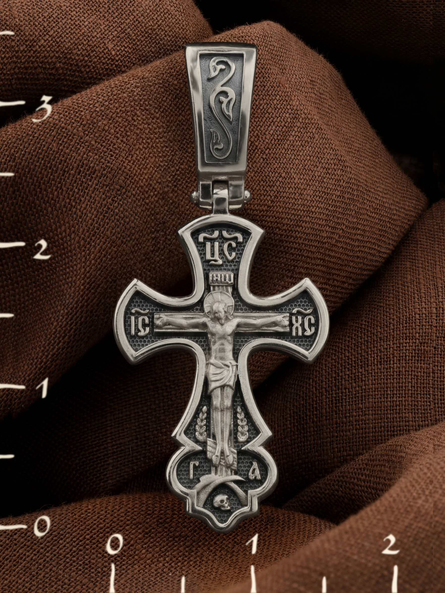 На лицевой стороне креста изображено Распятие, потому что это орудие казни Иисус Христос сделал орудием победы над грехом и смертью. Своими страданиями Он искупил грехи человечества, умерев и сошествовав во ад, победил сатану, освободил души праведников от вечной смерти и открыл им небесные врата рая. Жертва Христа сделала возможным спасение для каждого человека. На православном кресте Христос не умирает, а свободно простирает руки, ладони Иисуса открыты, будто он хочет обнять все человечество, даря им свою любовь и открывая путь к вечной жизни. Над титлом видим буквы «Ц» «С» — Царь Славы. Верхняя перекладина символизирует собой табличку с надписью «IHЦI» — Иисус Назарянин Царь Иудейский. По бокам поперечной перекладины сокращенно написано святое имя Христа «IС ХС». Буквы «Г» и «А» обозначают «Голова Адама». Возвышение, на котором стоит Крест, символизирует гору Голгофу, на которой произошло Распятие. У подножия Креста изображают прах Адама, обозначенный черепом.