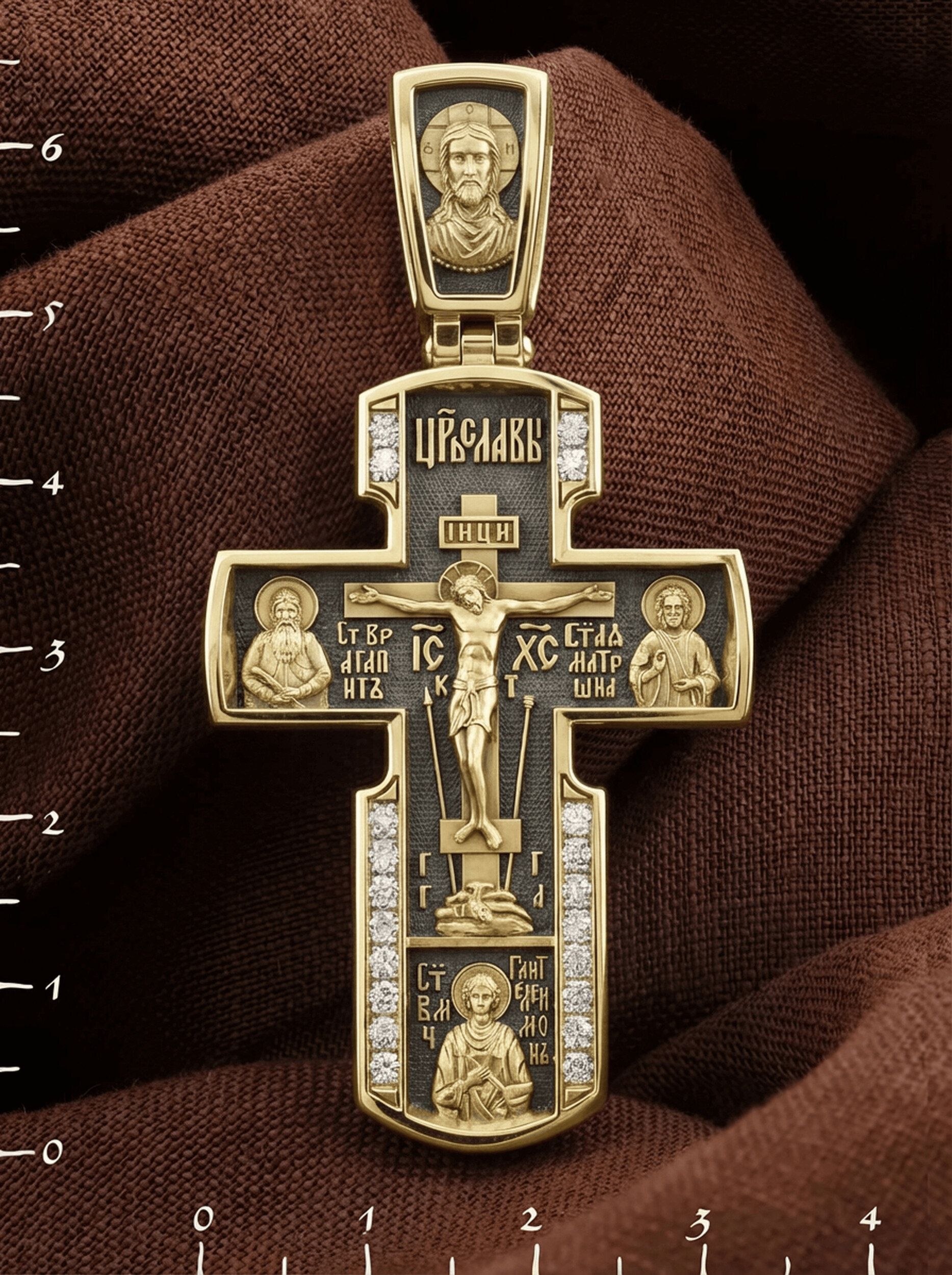 На лицевой стороне креста изображено Распятие Иисуса Христа на Голгофском Кресте, над вершиной которого помещена надпись «Царь Славы». Справа от Распятия помещен образ прославленной святой блаженной Матроны. «Матронушка», — ласково называют эту святую православные за удивительную любовь и помощь, которую она подает всем нуждающимся в ее поддержке. Слева — икона прп. Агапита. Этот святой жил в пещерах Киево-Печерского монастыря в XI веке и бескорыстно врачевал мирян и монахов.