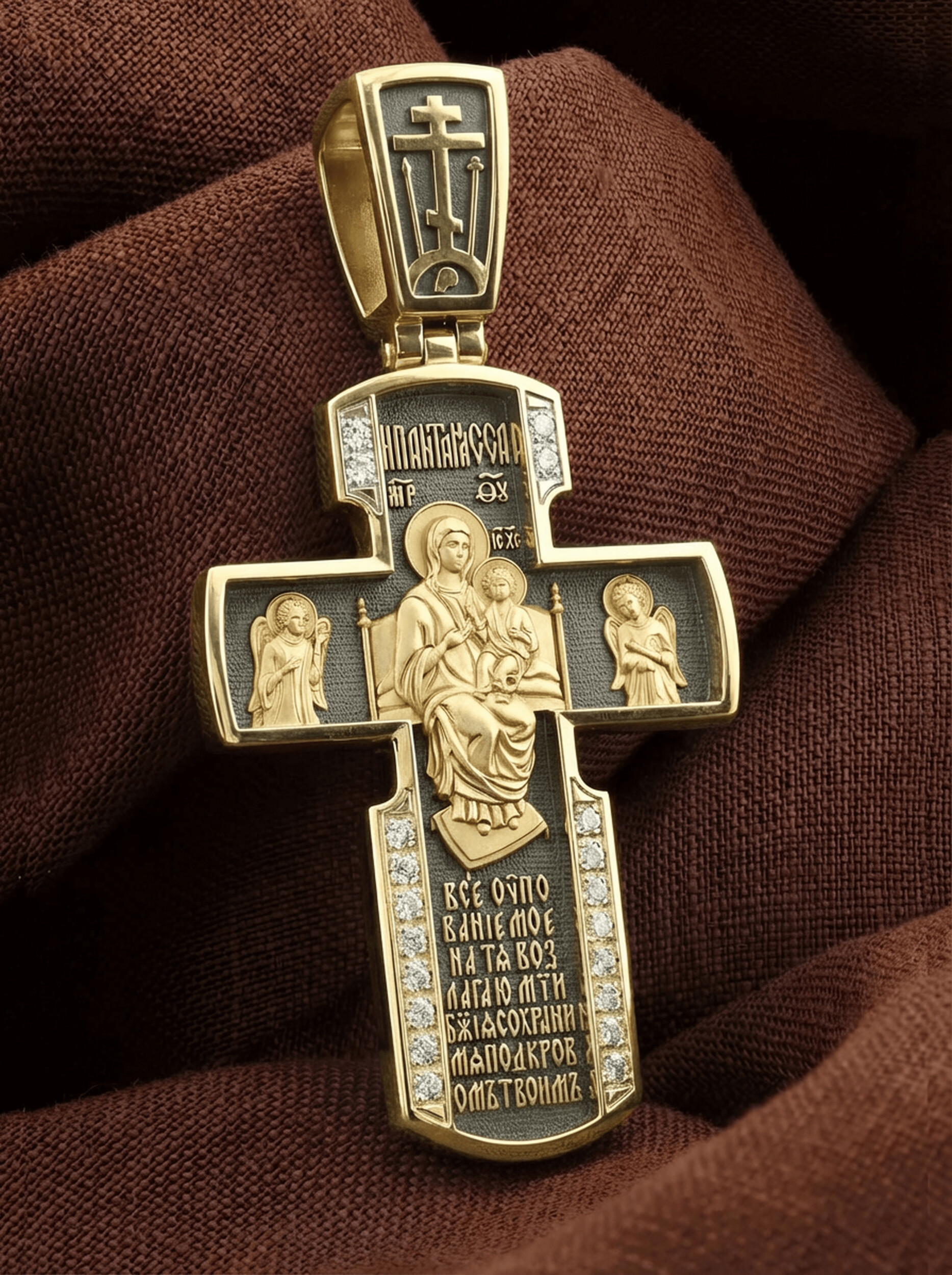 Внизу креста написана молитва обращенная к Божией Матери «Все упование мое на Тя возлагаю, Мати Божия, сохрани мя под кровом Твоим».