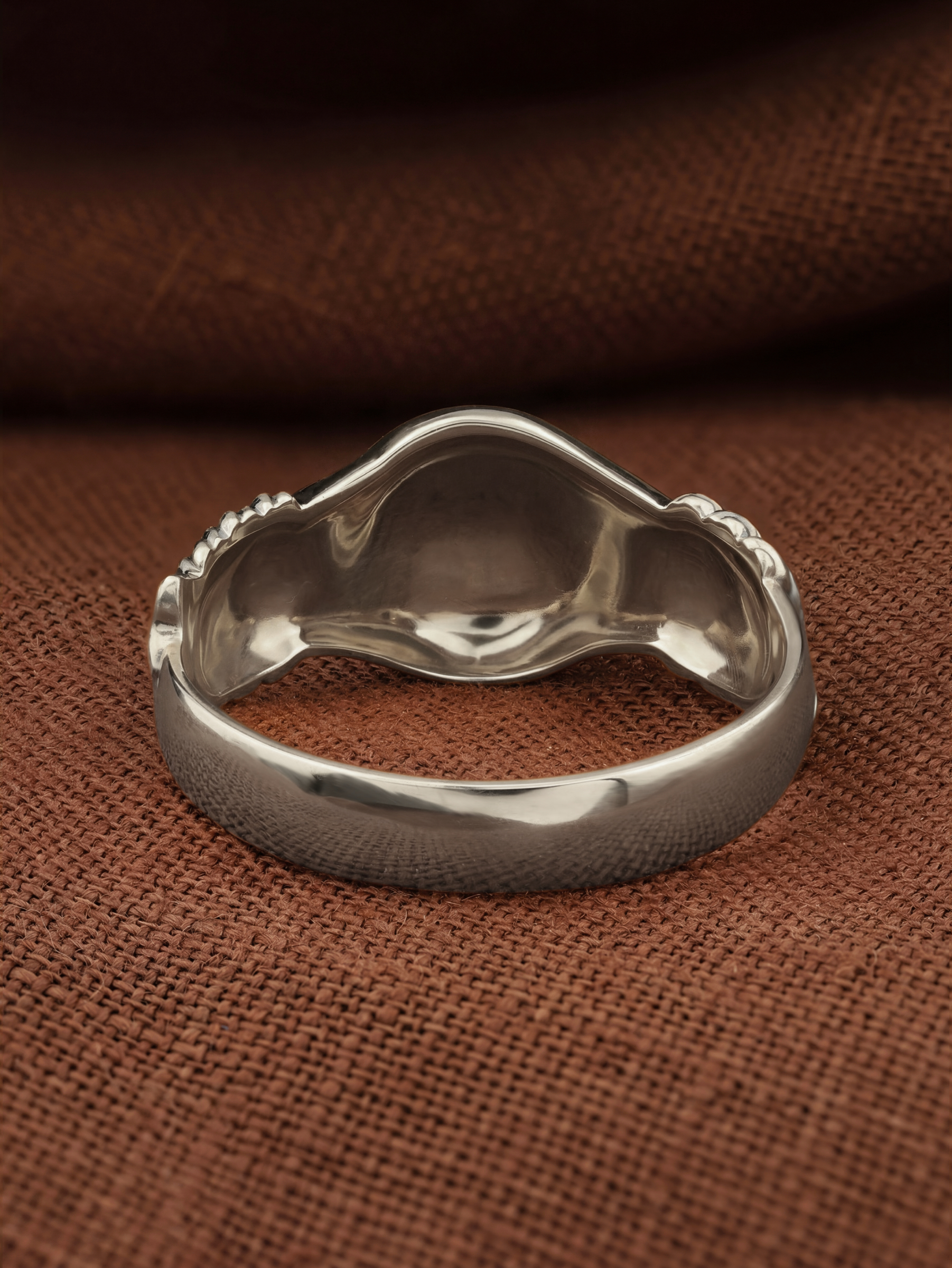 В центральной части лицевой стороны кольца изображен Крест. Господь сказал: кто хочет идти за Мною, отвергнись себя, и возьми крест свой, и следуй за Мною. Крест является символом жертвенной любви Всеблагого Бога к падшим людям, всепобеждающим духовным оружием христиан, основанием и средоточием церковной жизни. Иисус Христос, как искупительная жертва освобождения человечества от власти греха, умер крестной смертью и в третий день воскрес. Крест имеет четырехконечную форму с равными балками. Такого типа кресты существовали во многих дохристианских культурах и были в первую очередь использованы Церковью для выражения идеи христианского преобразования мира. Вокруг креста помещена молитва: «Спаси и Сохрани».