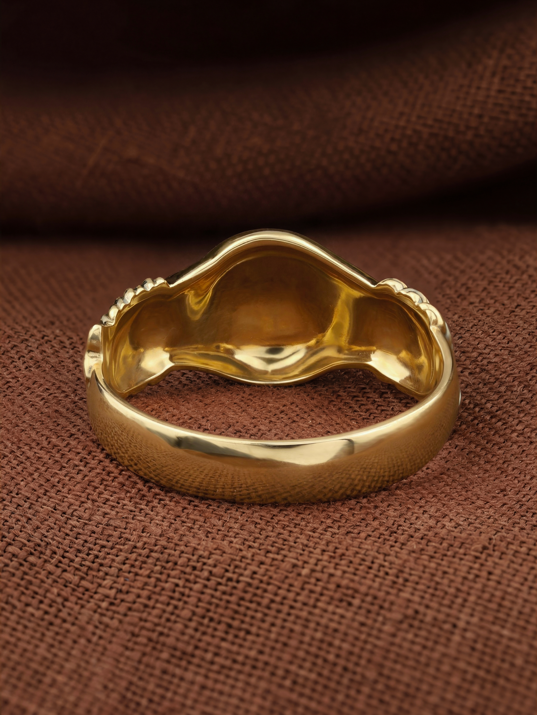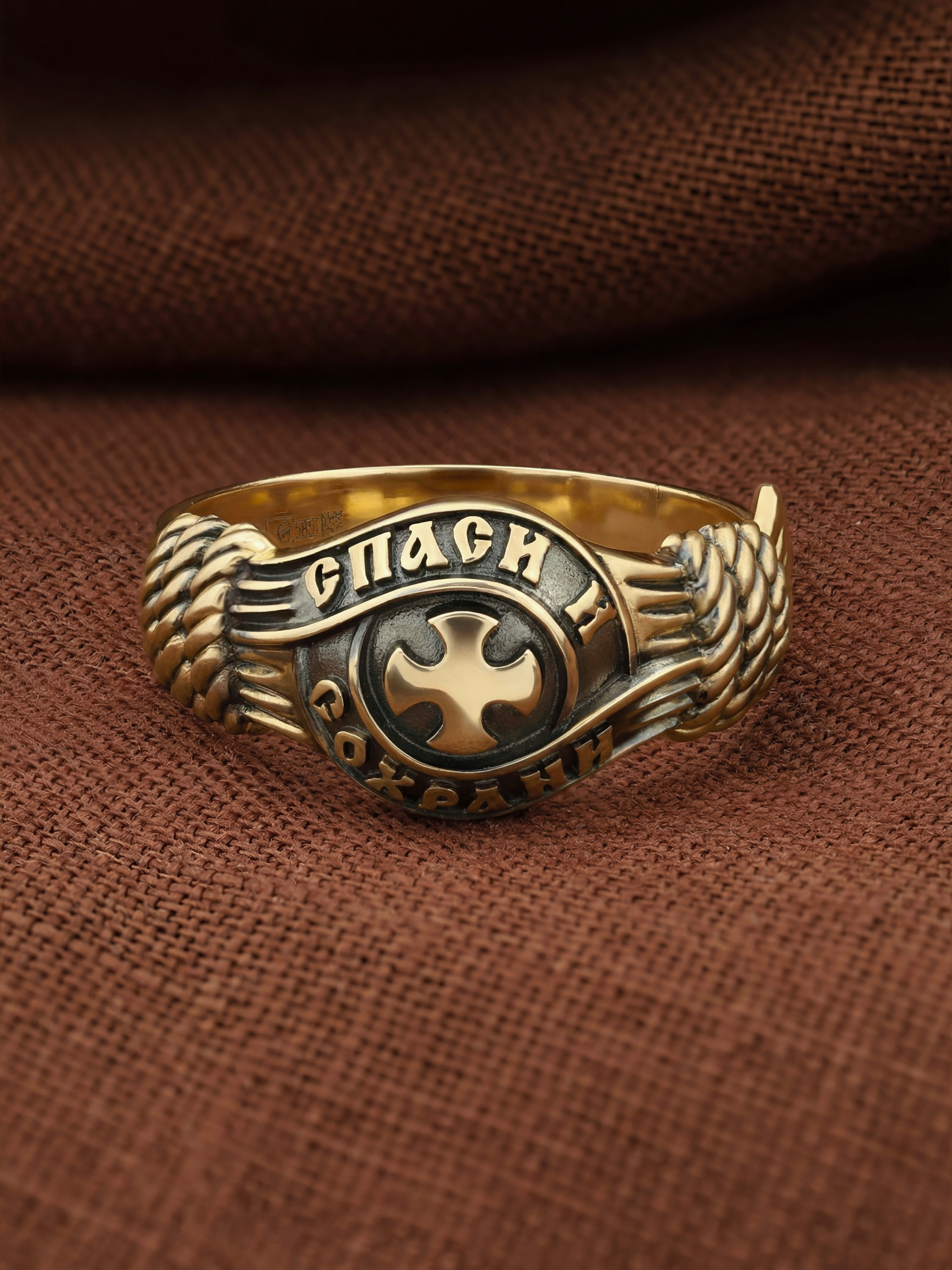 В центральной части лицевой стороны кольца изображен Крест. Господь сказал: кто хочет идти за Мною, отвергнись себя, и возьми крест свой, и следуй за Мною. Крест является символом жертвенной любви Всеблагого Бога к падшим людям, всепобеждающим духовным оружием христиан, основанием и средоточием церковной жизни. Иисус Христос, как искупительная жертва освобождения человечества от власти греха, умер крестной смертью и в третий день воскрес. Крест имеет четырехконечную форму с равными балками. Такого типа кресты существовали во многих дохристианских культурах и были в первую очередь использованы Церковью для выражения идеи христианского преобразования мира. Вокруг креста помещена молитва: «Спаси и Сохрани».