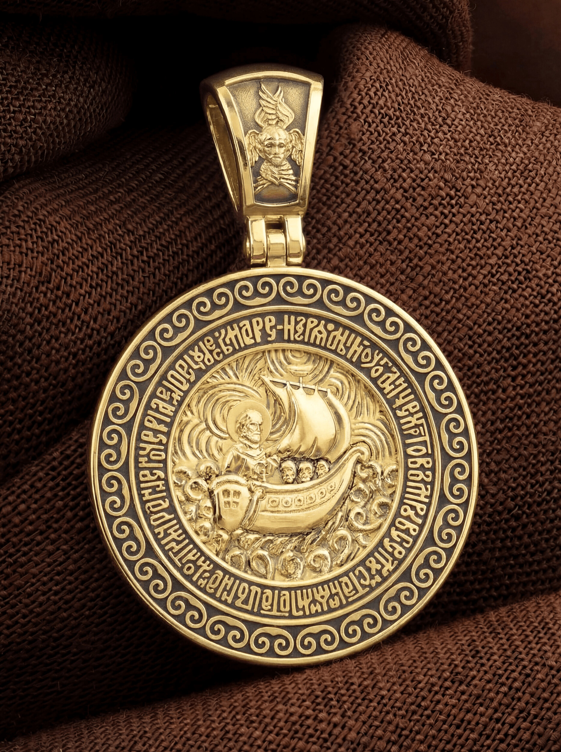 На обороте изображена икона «Чудо спасения трех корабельщиков». Вокруг — слова молитвы. Они просты и одновременно исполнены глубокого символического смысла: «Изрядный угодниче Христов, миру всему источай многоценное милости миро и неисчерпаемое чудес море. Многоценное милости миро — это образ милосердной помощи, которую оказывает Святой Николай Угодник всем обращающимся к нему с молитвой.