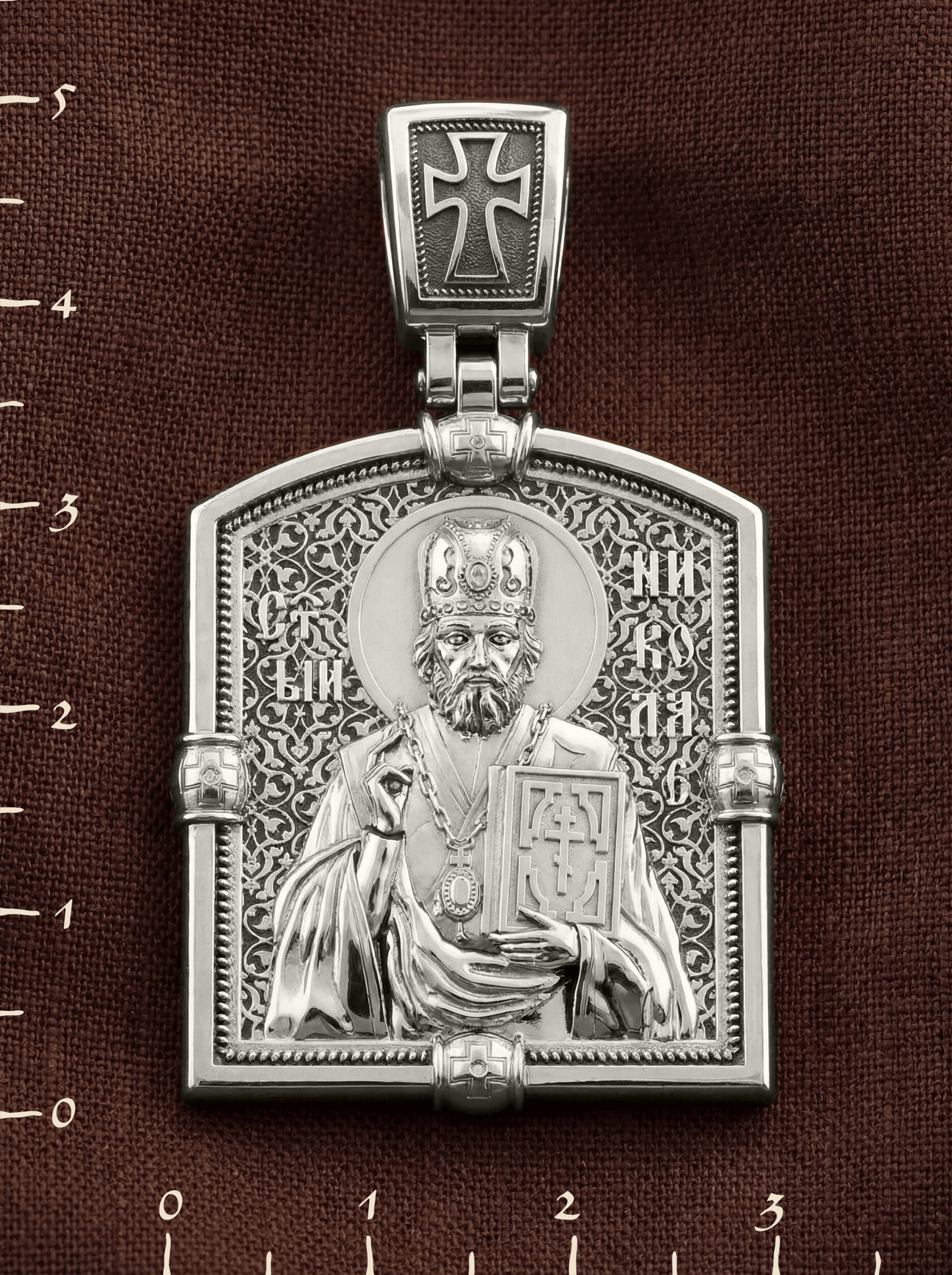 Лицевую сторону возглавляет икона Святителя Николая Чудотворца. Святитель Николай родился во второй половине III века в Малой Азии в Ликийском городе Патары. С рождения Божий Угодник проявлял необыкновенные дарования. Сохранилось Предание, что во время крещения он, никем не поддерживаемый, простоял в купели три часа. С детства святитель избегал пустых развлечений, любил молитву, прекрасно учился и проводил свободное время за чтением Священного Писания. По достижении зрелого возраста жители Патар выбрали его своим пресвитером. Несколько лет спустя Святой Николай стал епископом в городе Миры, столице Ликии.