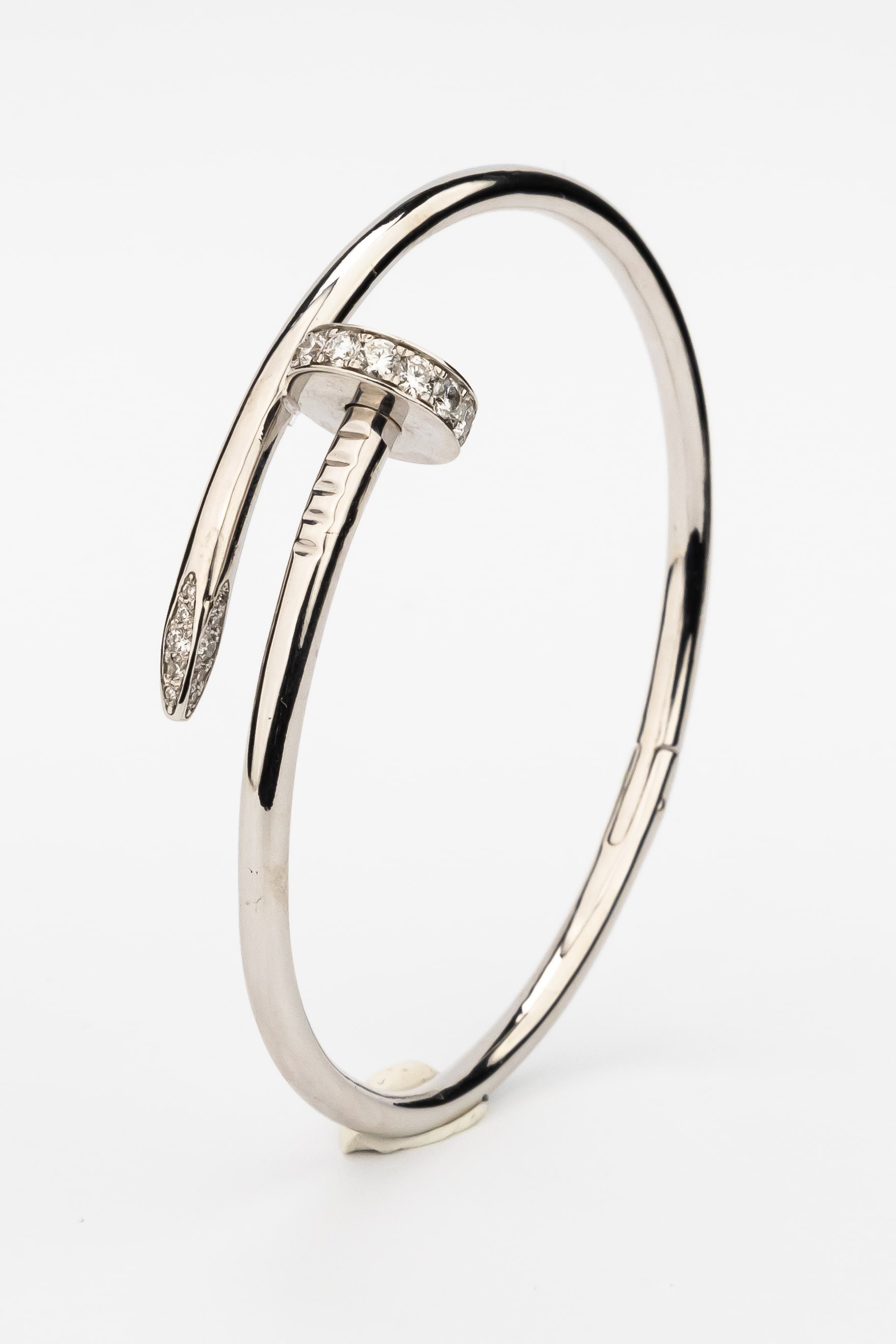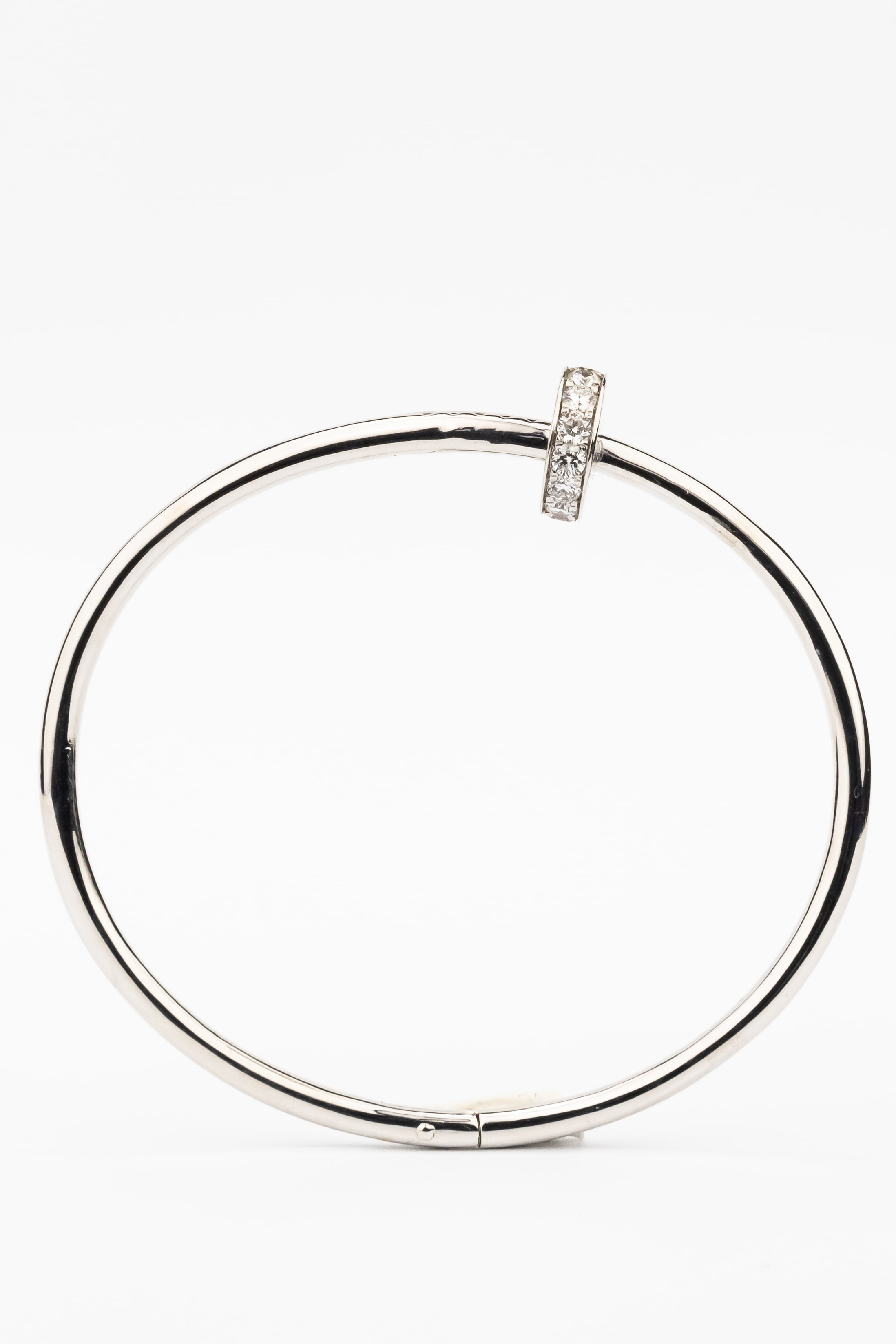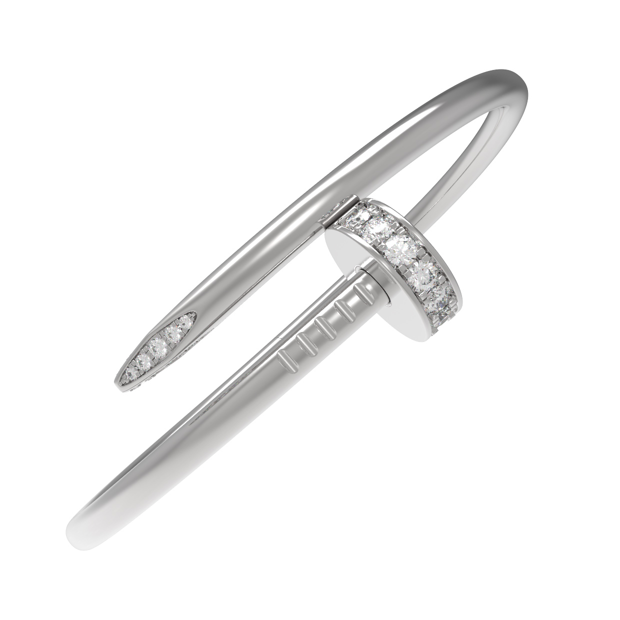Декор модели дополняют 64 бриллианта круглой огранки с чистым белым цветом, которые эффектно расположены на шляпке и кончике изделия, притягивая взгляды к каждому движению вашей руки. Лаконичная, но выразительная форма браслета делает его универсальным аксессуаром, который гармонично дополнит как повседневный образ, так и вечерний наряд.