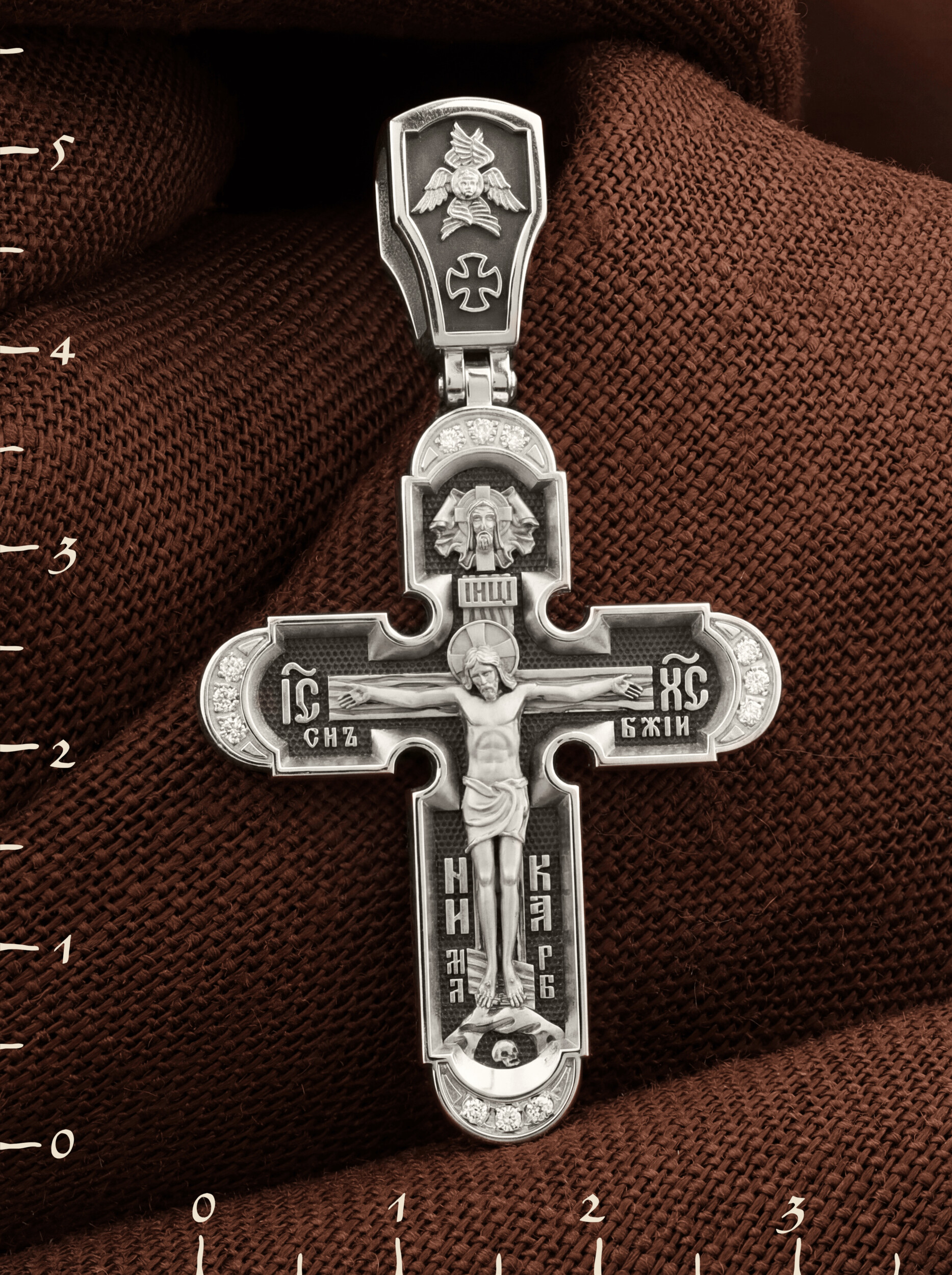 На лицевой стороне нательного креста по традиции изображено Распятие Господа нашего Иисуса Христа. Крест Господень стоит на небольшом каменистом возвышении, символизирующем гору Голгофу, которая обозначена буквами МЛРБ (Место Лобное Рай Бысть). Над головой Господа на поперечной перекладине написано «ИНЦИ», что символизирует табличку, которая была прибита к Кресту, с надписью «Иисус Назорей Царь Иудейский». Этим иудеи хотели посмеяться над Христом, не зная, что распинают истинного Царя всех царей. По сторонам основной перекладины расположены позолоченные рельефные инициалы Христа «ИС ХС». Под перекладиной, по сторонам древа, находится надпись «СЫН БОЖИЙ», а в основании креста — надпись «НИКА» (Победитель).
