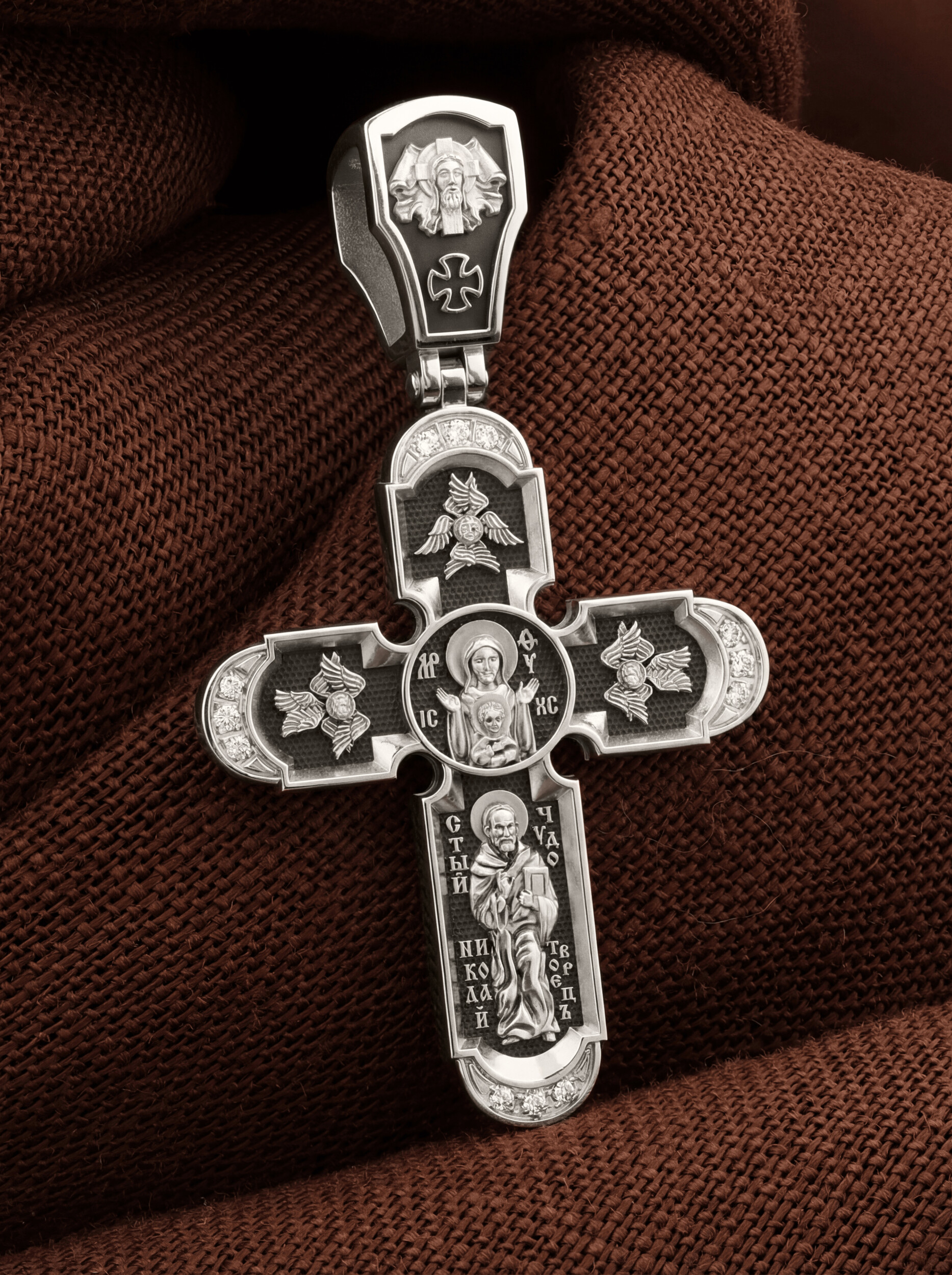 У основания креста в полный рост изображен самый любимый святой Православной Церкви — Николай Чудотворец. Святой почитается как целитель болезней, покровитель путешествующих, особенно по морю, помощник в торговле, учебе, а также в поисках достойного супруга.