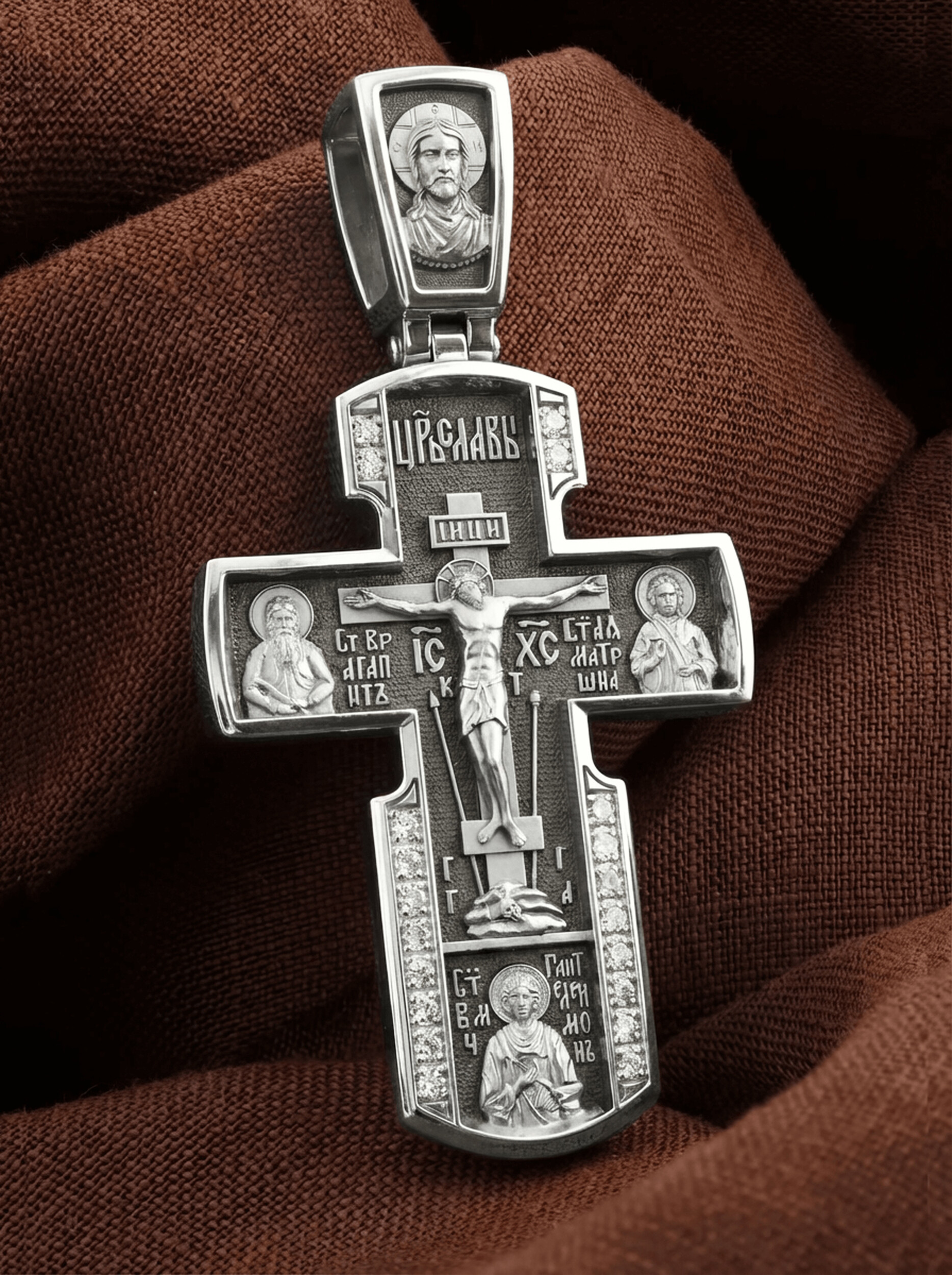 На лицевой стороне креста изображено Распятие Иисуса Христа на Голгофском Кресте, над вершиной которого помещена надпись «Царь Славы». Справа от Распятия помещен образ прославленной святой блаженной Матроны. «Матронушка», — ласково называют эту святую православные за удивительную любовь и помощь, которую она подает всем нуждающимся в ее поддержке. Слева — икона прп. Агапита. Этот святой жил в пещерах Киево-Печерского монастыря в XI веке и бескорыстно врачевал мирян и монахов.