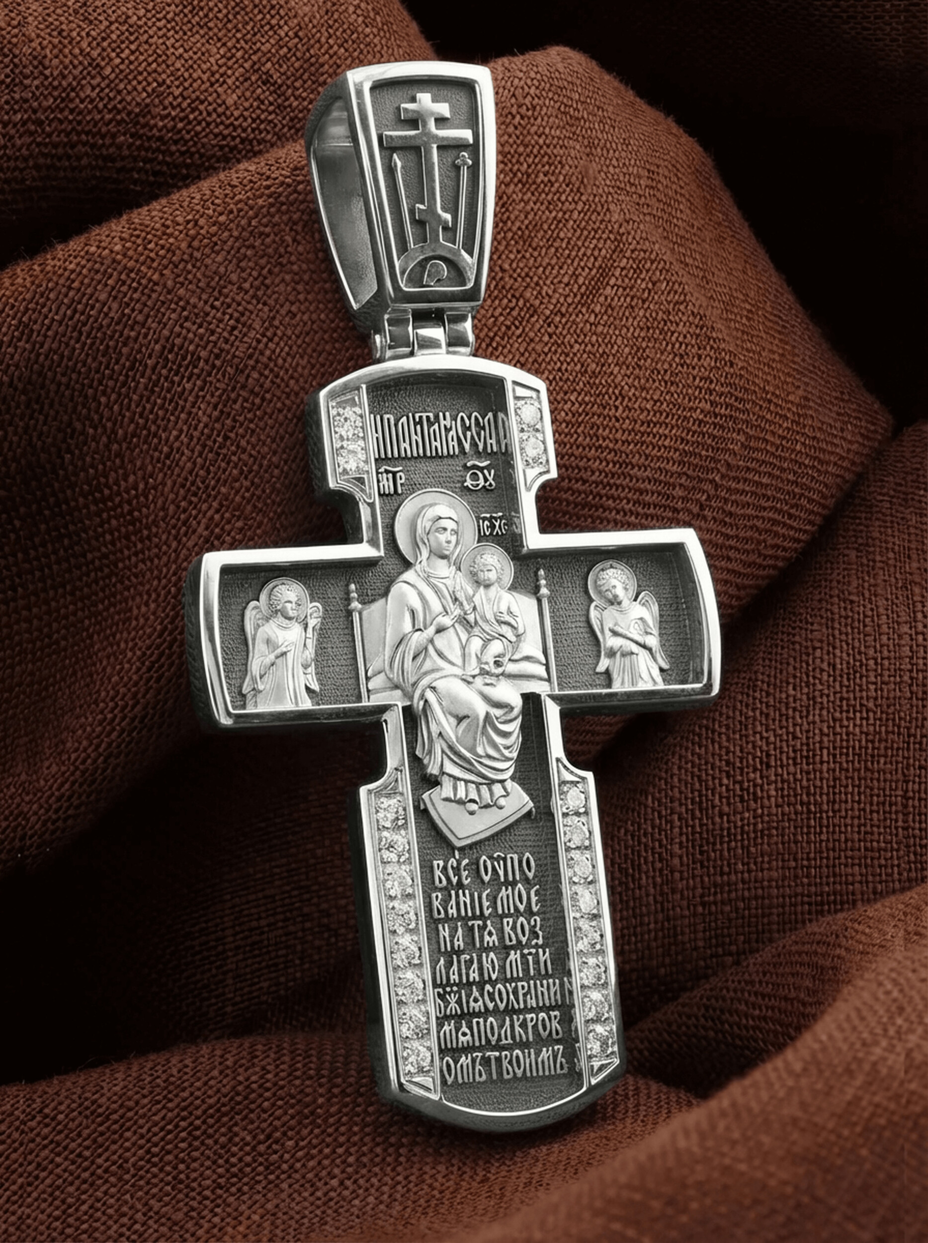 Внизу креста написана молитва обращенная к Божией Матери «Все упование мое на Тя возлагаю, Мати Божия, сохрани мя под кровом Твоим».
