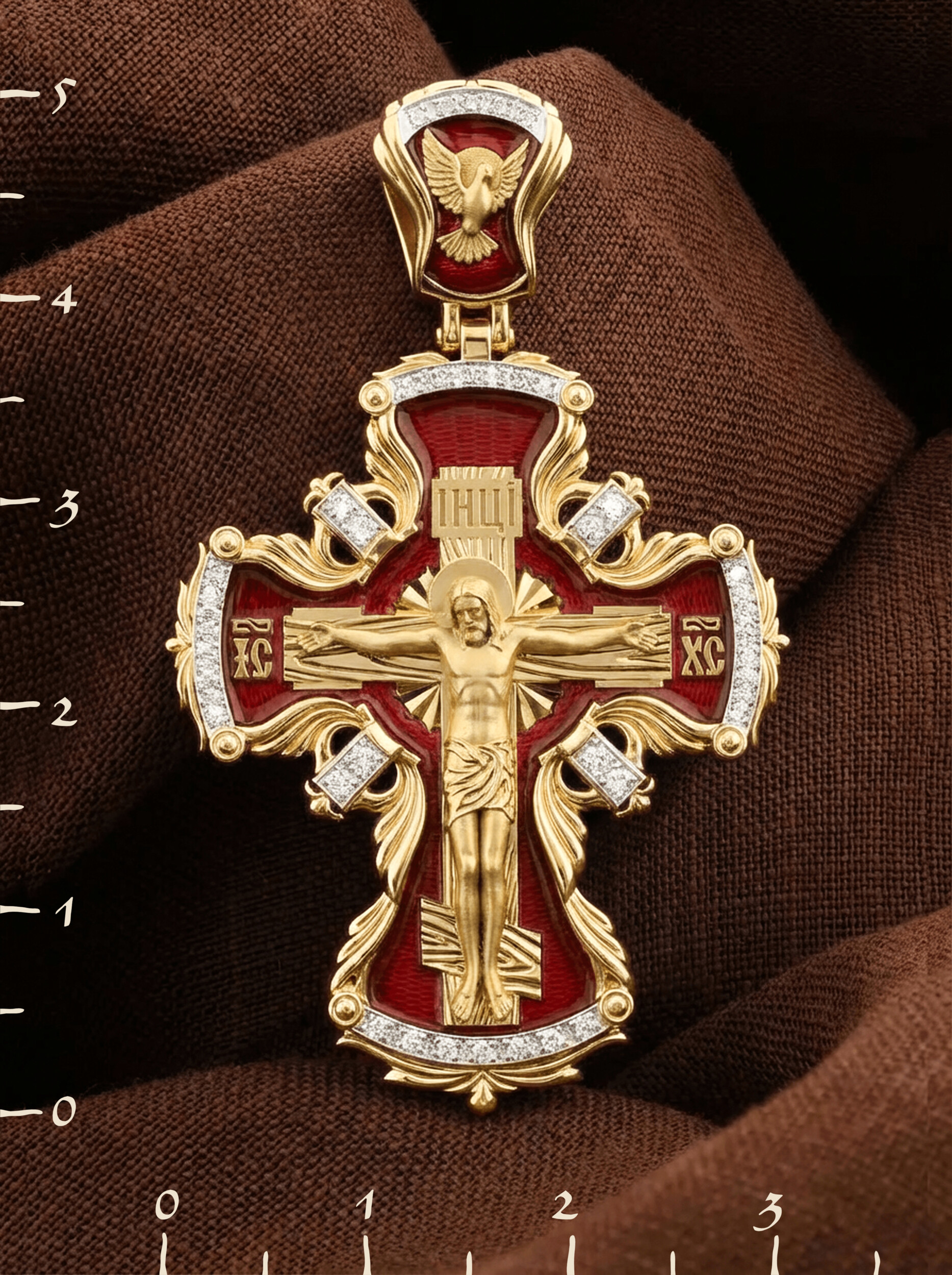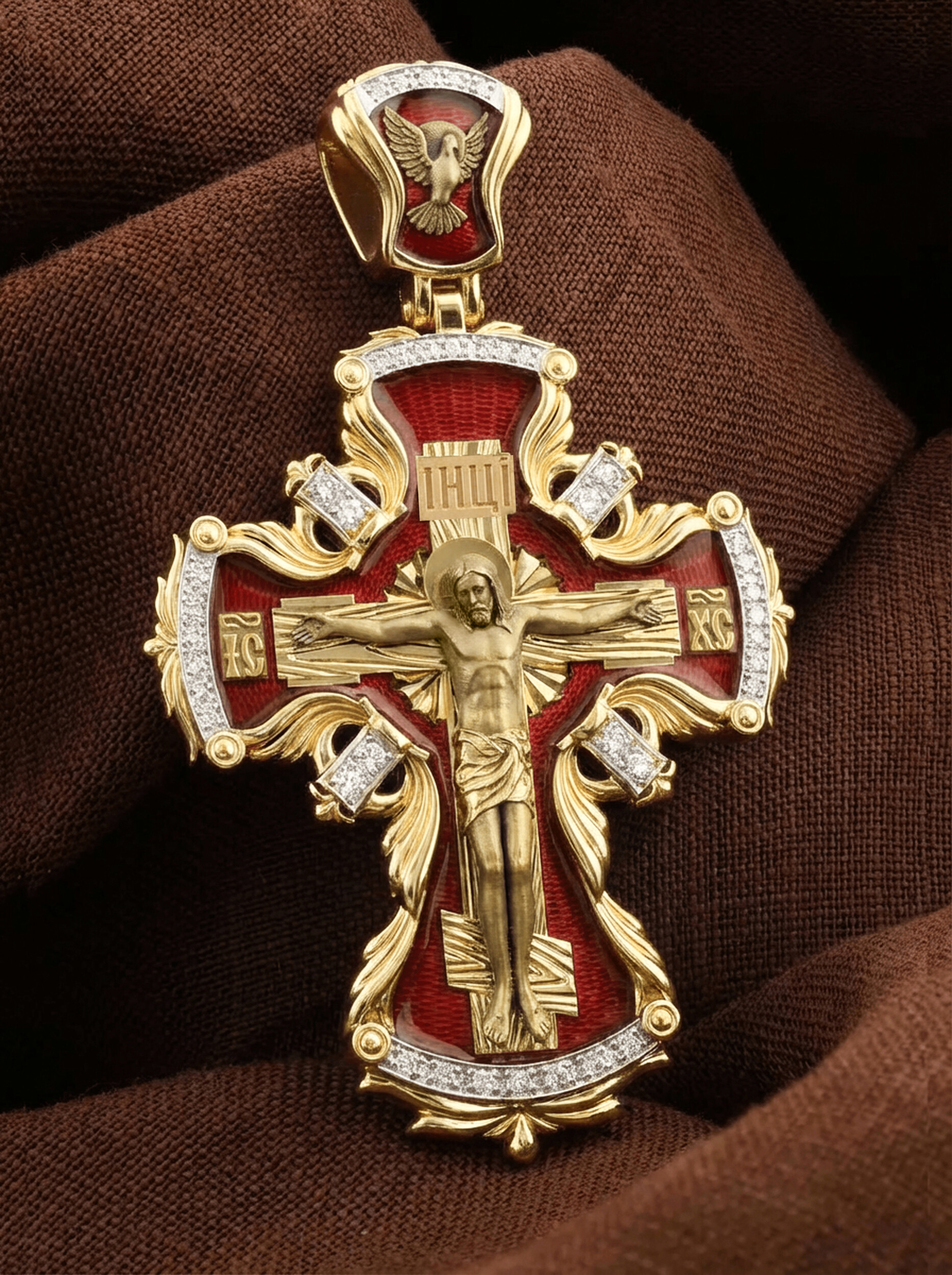 На лицевой стороне креста изображено Распятие Господа и Спасителя нашего Иисуса Христа, отдавшего Себя на смерть, чтобы другие могли жить — жить вечной жизнью, жить с Богом. Своею кровью Господь освятил крест и сделал его проводником Своей благодати, источником освящения верующих. На верхней табличке, выше головы Иисуса, расположена надпись, составленная Понтием Пилатом — «ИНЦИ». Она означает «Иисус Назорей, Царь Иудейский». Надпись «IС ХС» означает Иисус Христос помещается на разных сторонах поперечной (большой) перекладины креста. На кулонном кольце помещено изображение Духа Святого в виде голубя, сходящего с Небес.