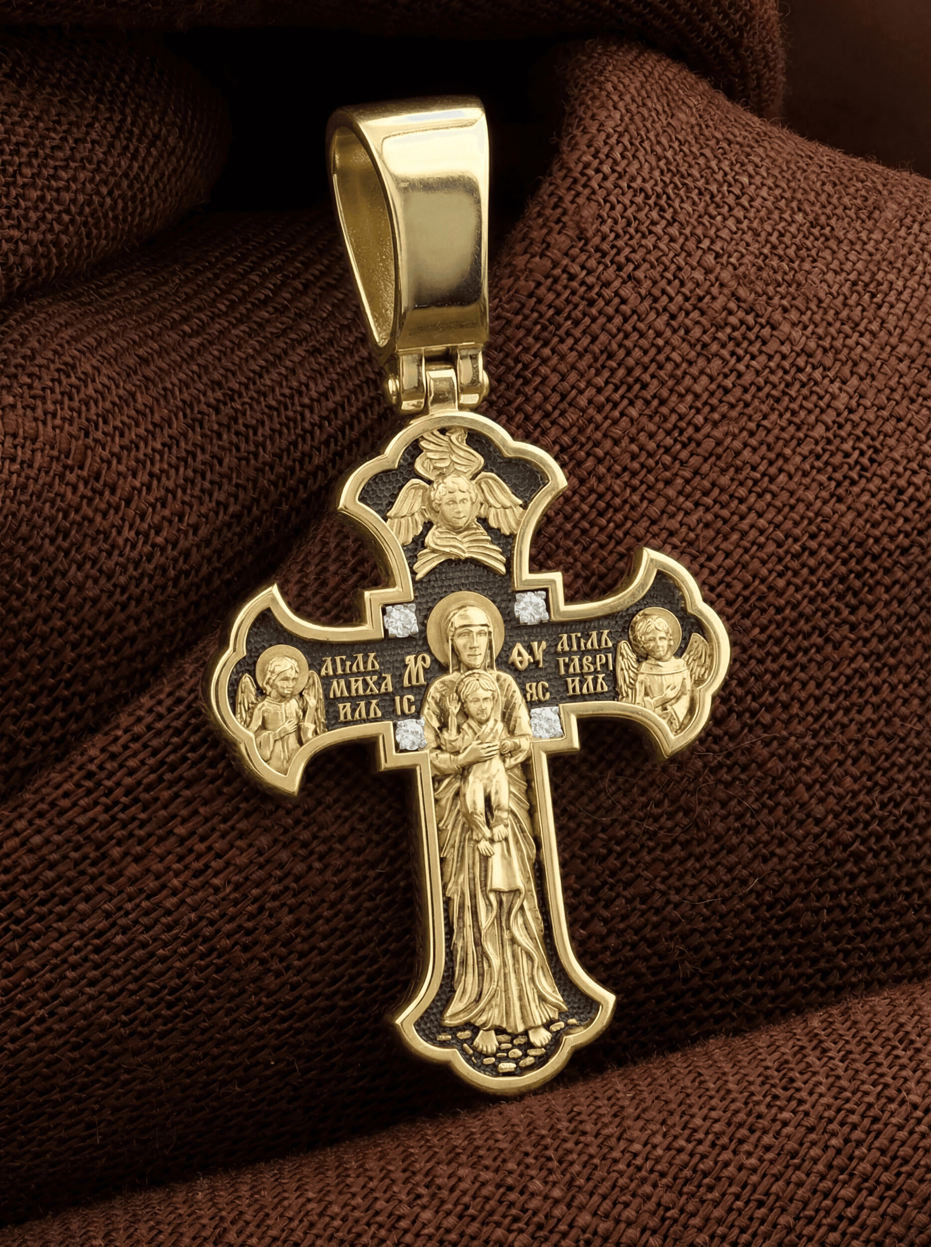 На обратной стороне креста в полный рост изображена Валаамская икона Божией Матери, над которой раскрыл свои крылья серафим. Этот образ написал в 1878 году иеромонах Валаамского монастыря о. Алипий. Валаамскую икону прославили многие чудеса, ее считают целительницей при разных недугах. Перед этим образом Богородицу молят в первую очередь об укреплении веры, просят даровать смирение, твердость в соблюдении заповедей Христовых и об исцелении. Богородице предстоят два архангела, Михаил и Гавриил.