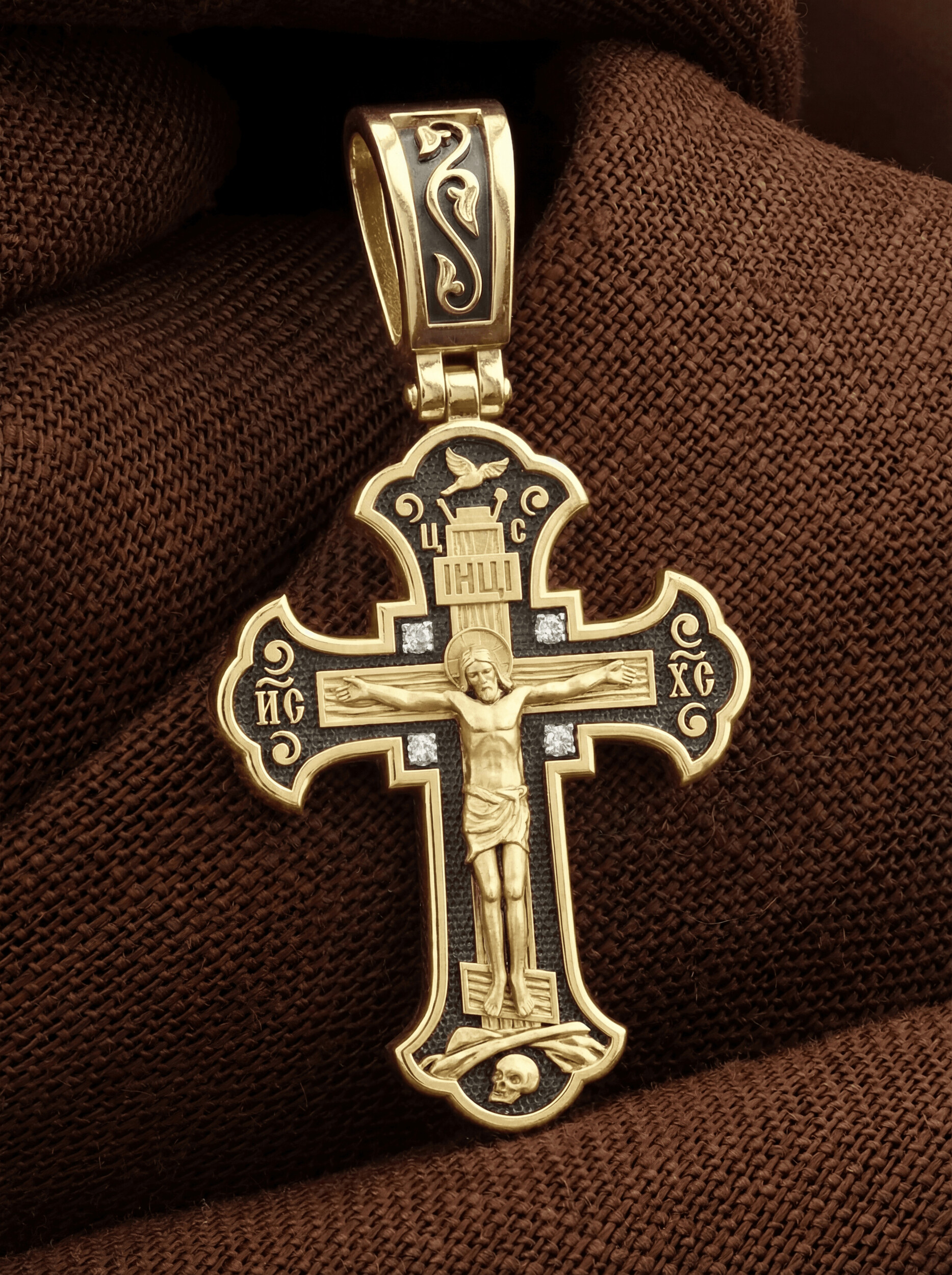 На лицевой стороне этого креста центральную часть занимает икона Распятия Христа — образ жертвы, принесенной Господом за грехи людей. Именно ко Христу, сошедшему на землю ради нашего спасения, возносятся все молитвы. Пресвятая Богородица, ангелы и святые — помощники Господа в деле спасения и заступники за людей перед Богом. «Оружием великим Христовым» именует Церковь крест, потому что, претерпев страдания и умерев, Господь победил смерть и лишил дьявола его власти над миром. Поэтому рядом с титлами Святого имени Христа написано «НИКА», что значит «победитель».