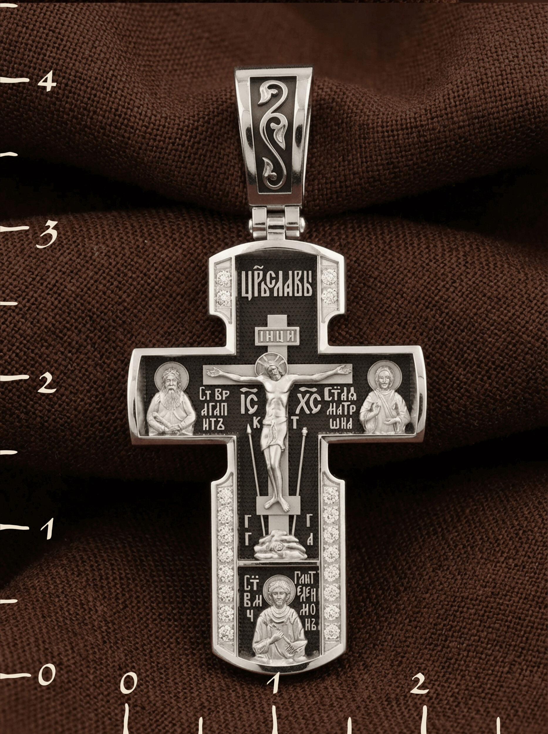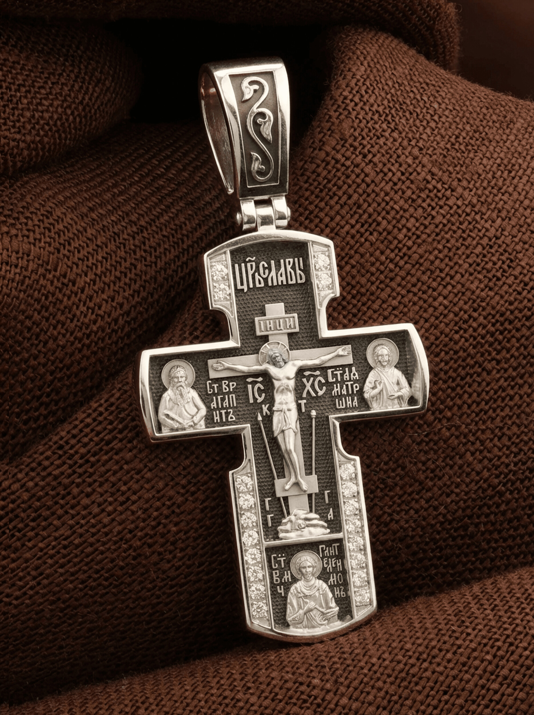 На лицевой стороне креста изображено Распятие Иисуса Христа на Голгофском Кресте, над вершиной которого помещена надпись «Царь Славы». Справа от Распятия помещен образ прославленной святой блаженной Матроны. «Матронушка», — ласково называют эту святую православные за удивительную любовь и помощь, которую она подает всем нуждающимся в ее поддержке. Слева — икона прп. Агапита. Этот святой жил в пещерах Киево-Печерского монастыря в XI веке и бескорыстно врачевал мирян и монахов.
