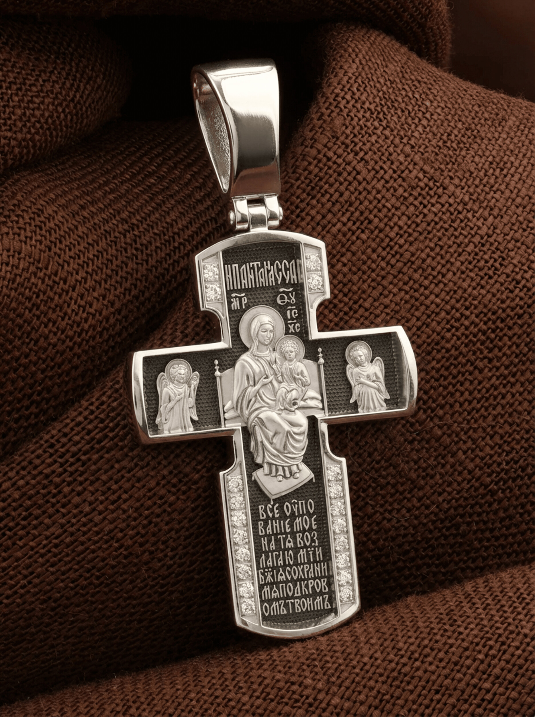 Внизу креста написана молитва обращенная к Божией Матери «Все упование мое на Тя возлагаю, Мати Божия, сохрани мя под кровом Твоим».