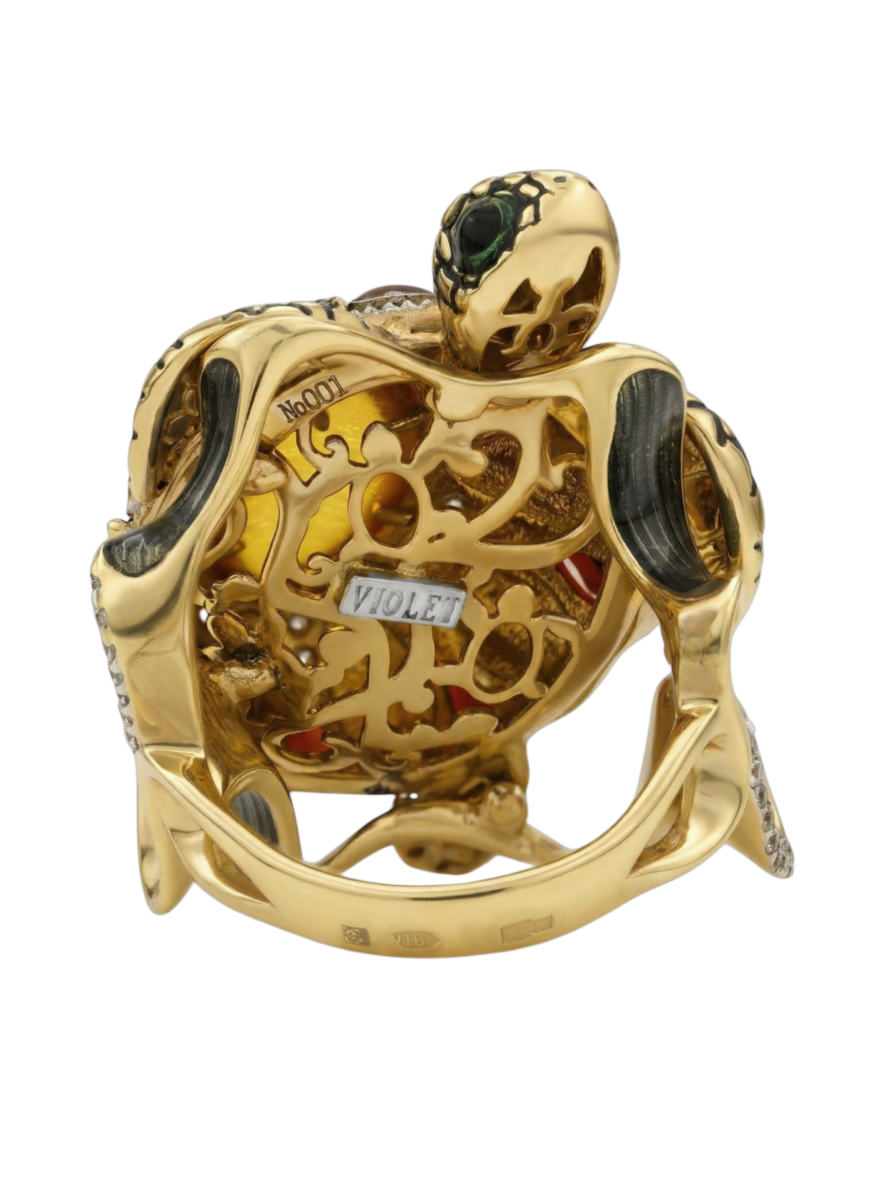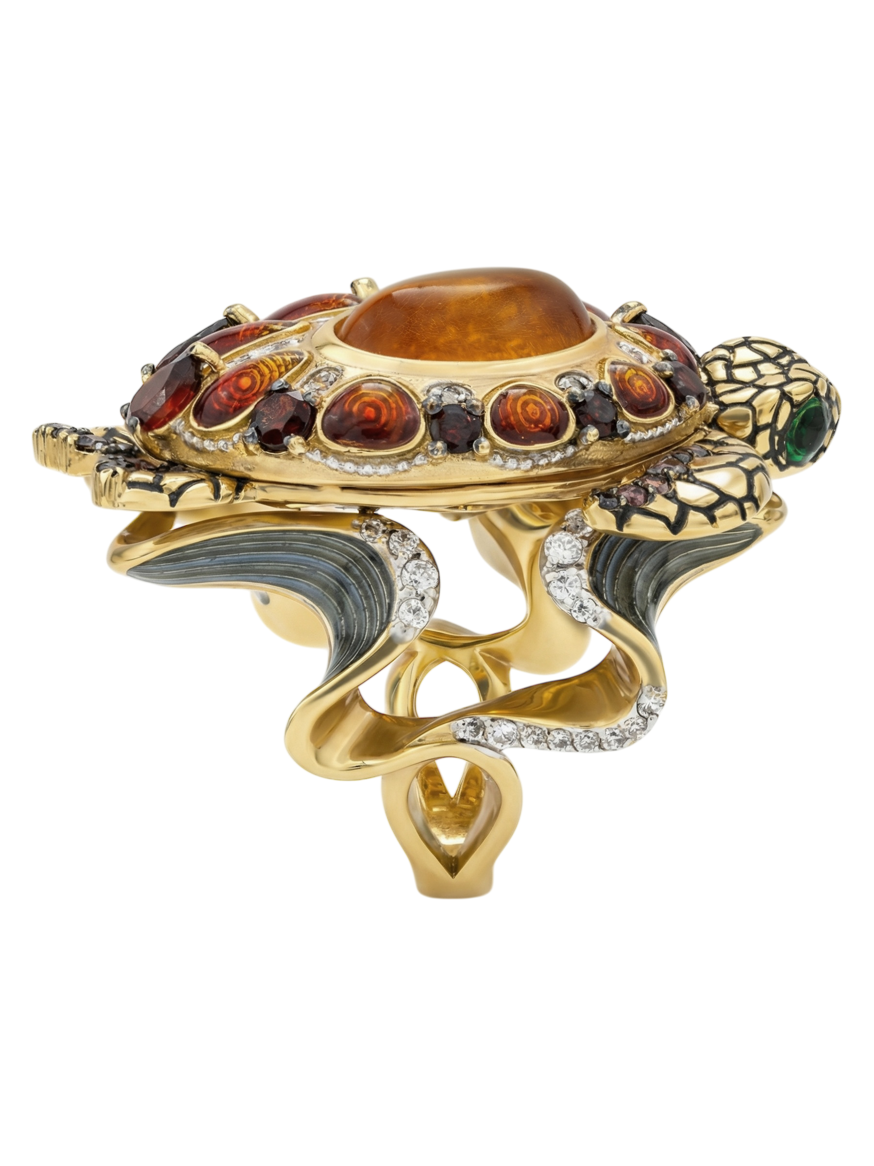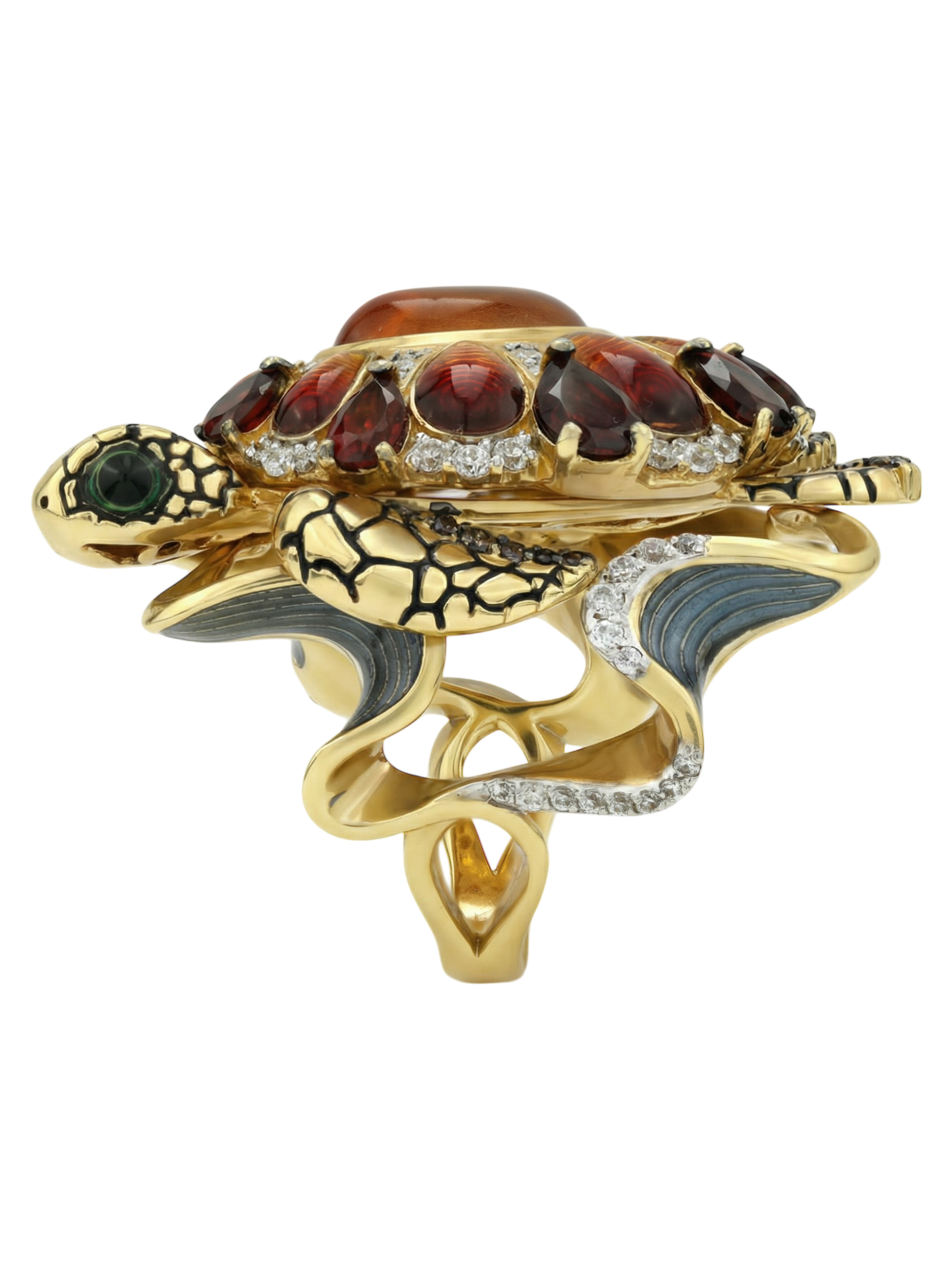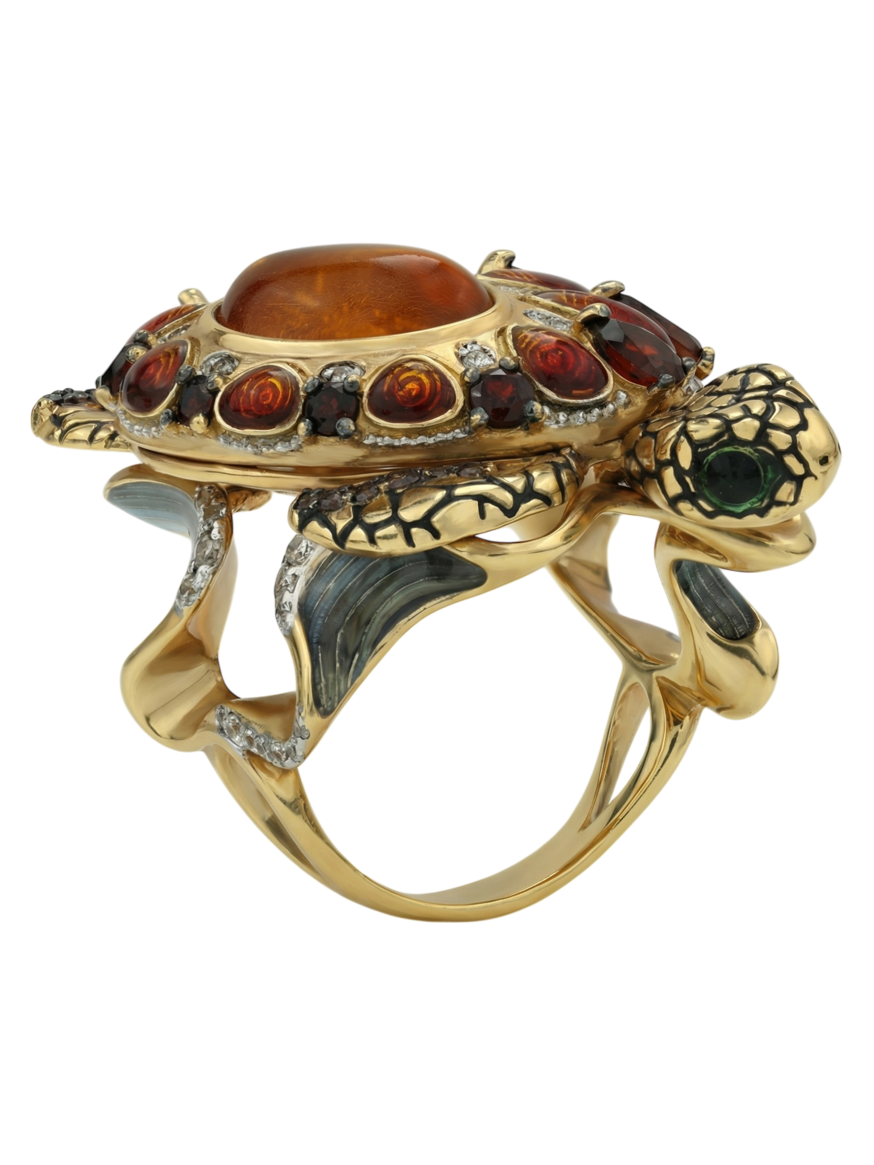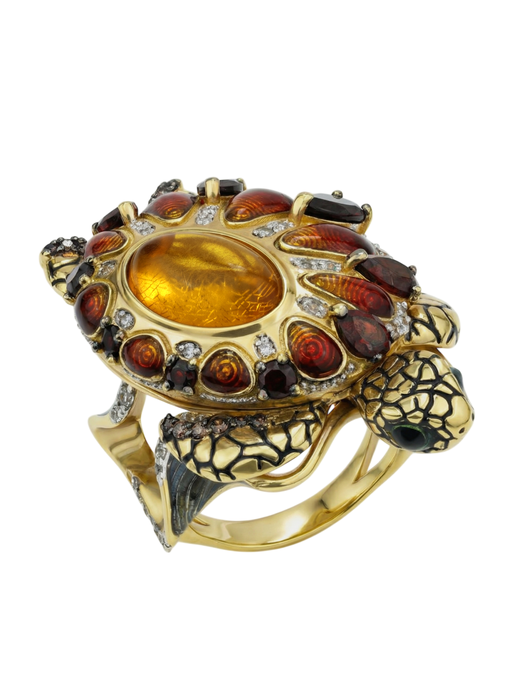 Кольцо из лимонного золота c эмалью, фианитом, гранатом и янтарём